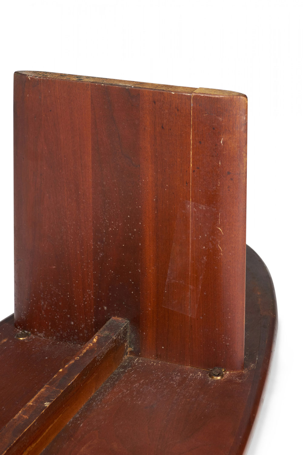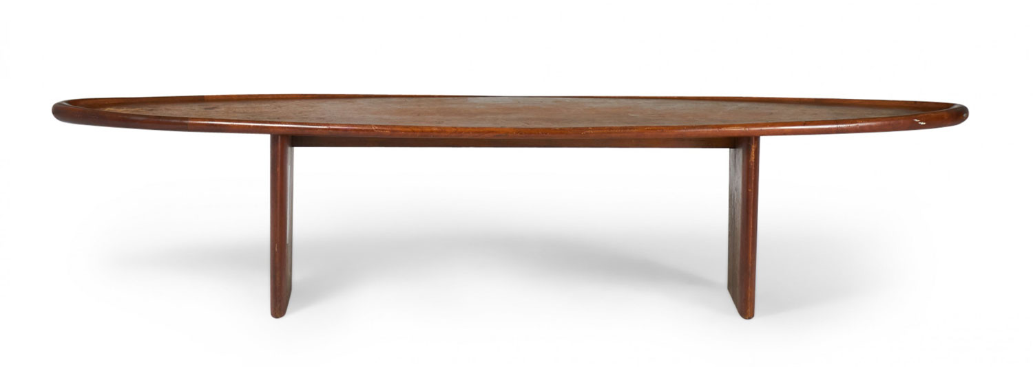 American Mid-Century mahogany coffee table with an elongated oval "surfboard" top with a shallow lip supported by two rectangular wooden legs. (T.H. ROBSJOHN-GIBBINGS FOR WIDDICOMB)(Similar table: DUF0153B)