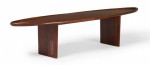 American Mid-Century mahogany coffee table with an elongated oval "surfboard" top with a shallow lip supported by two rectangular wooden legs. (T.H. ROBSJOHN-GIBBINGS FOR WIDDICOMB)(Similar table: DUF0153B).