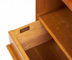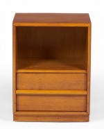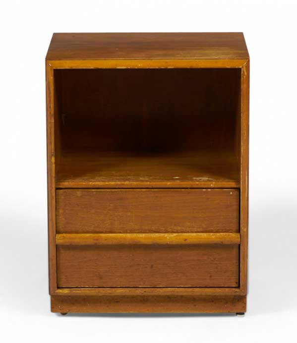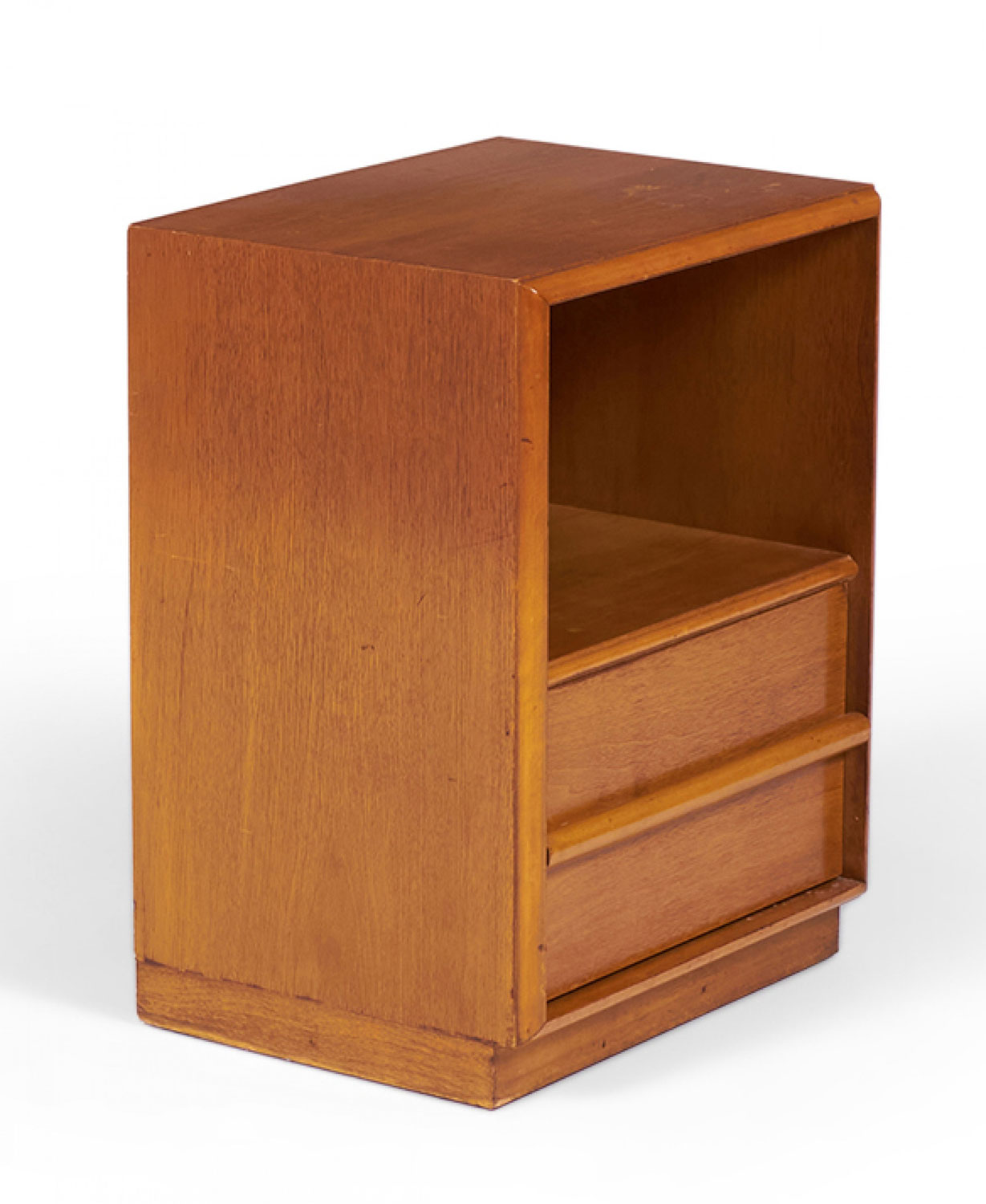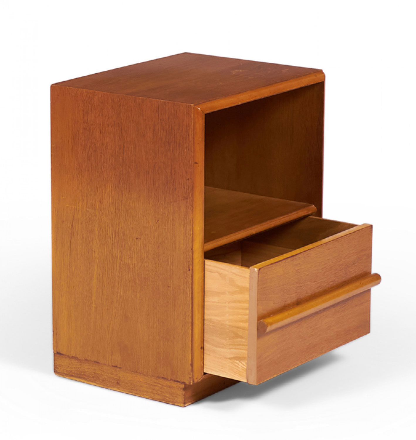 American Mid-Century walnut nightstand with an open upper cabinet shelf and a single lower drawer with a horizontal raised wooden drawer pull. (T.H. ROBSJOHN-GIBBINGS FOR WIDDICOMB)(Same piece with different finish: DUF0143A&C).