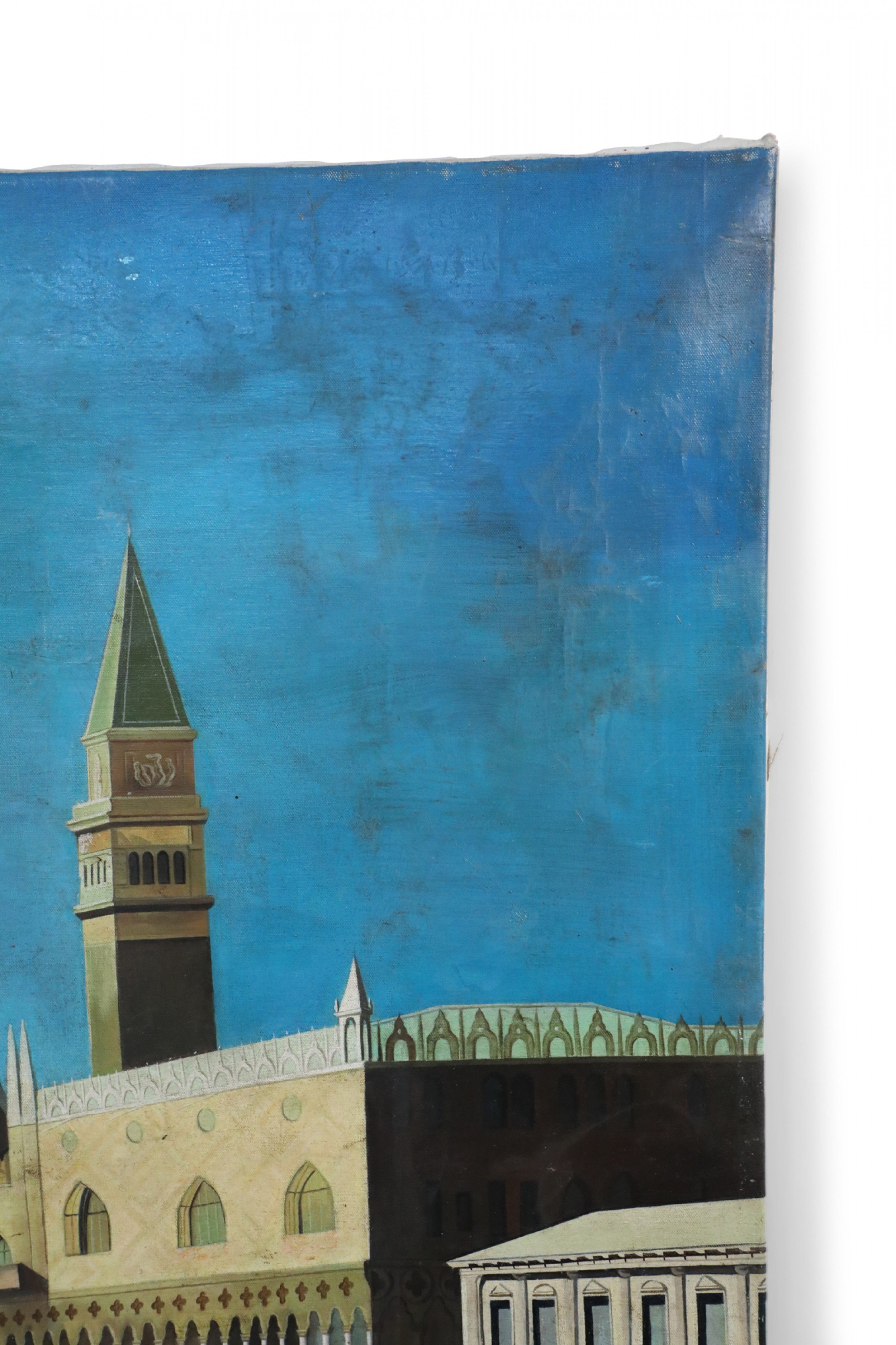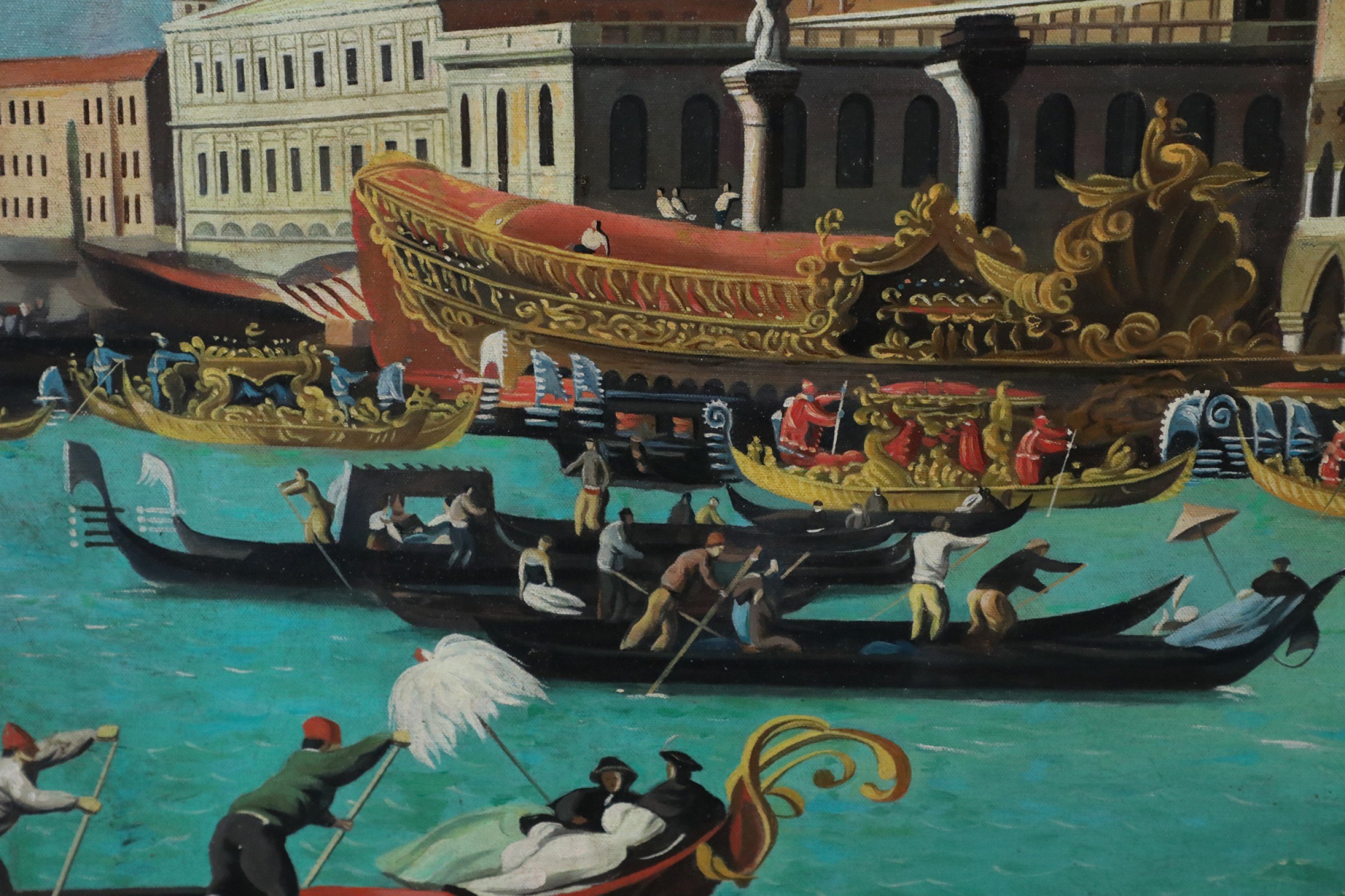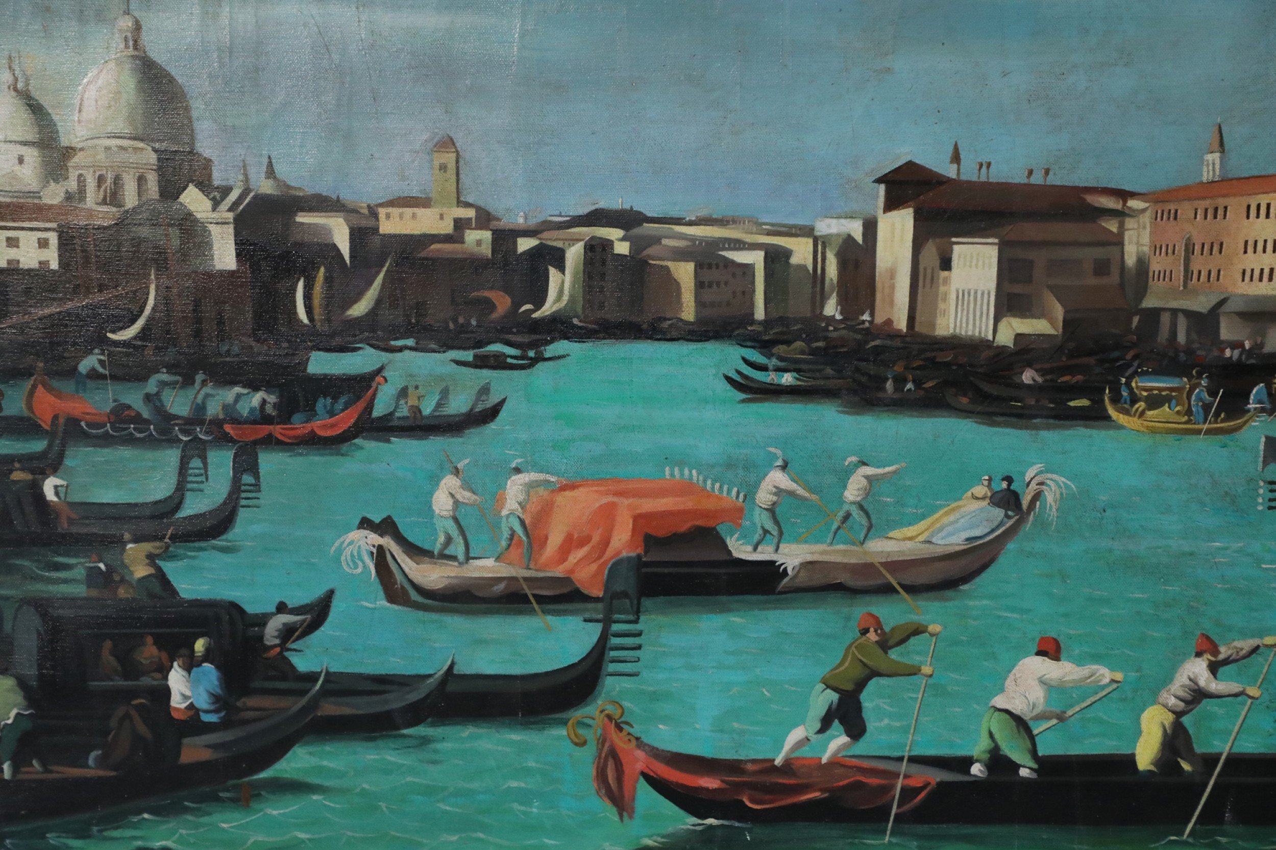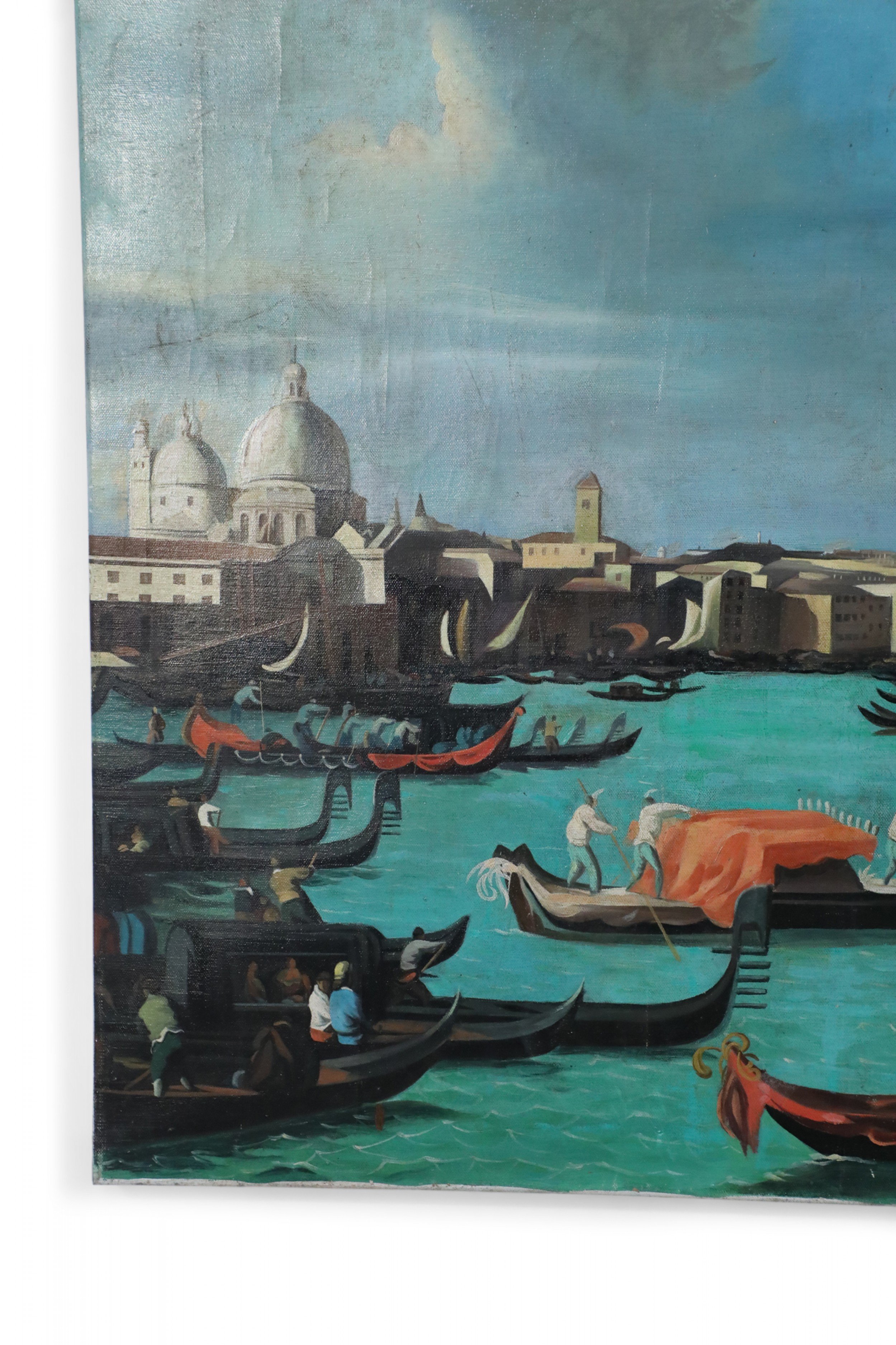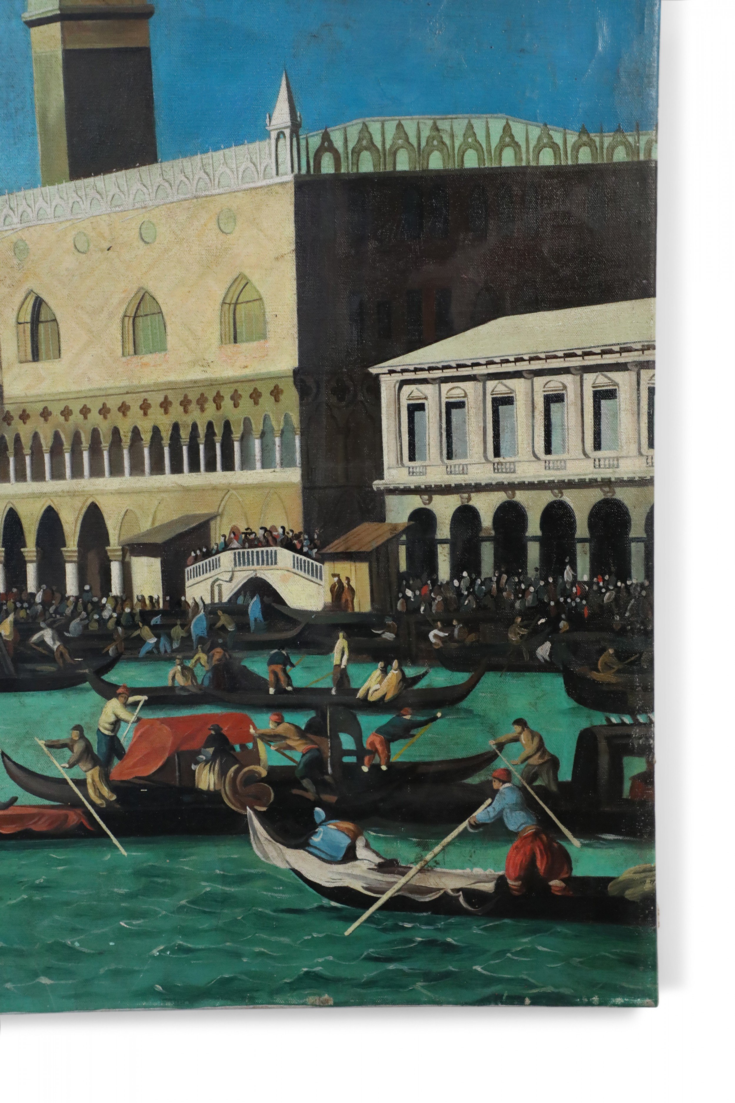 Italian Venetian-Style (20th Century) unframed canvas oil painting of a bright, aqua canal crowded with gondolas under passage in front of Doge's Palace with St Mark's Campanile just behind it, and the domes of the Punta della Dogana visible in the distance in the lower left corner.