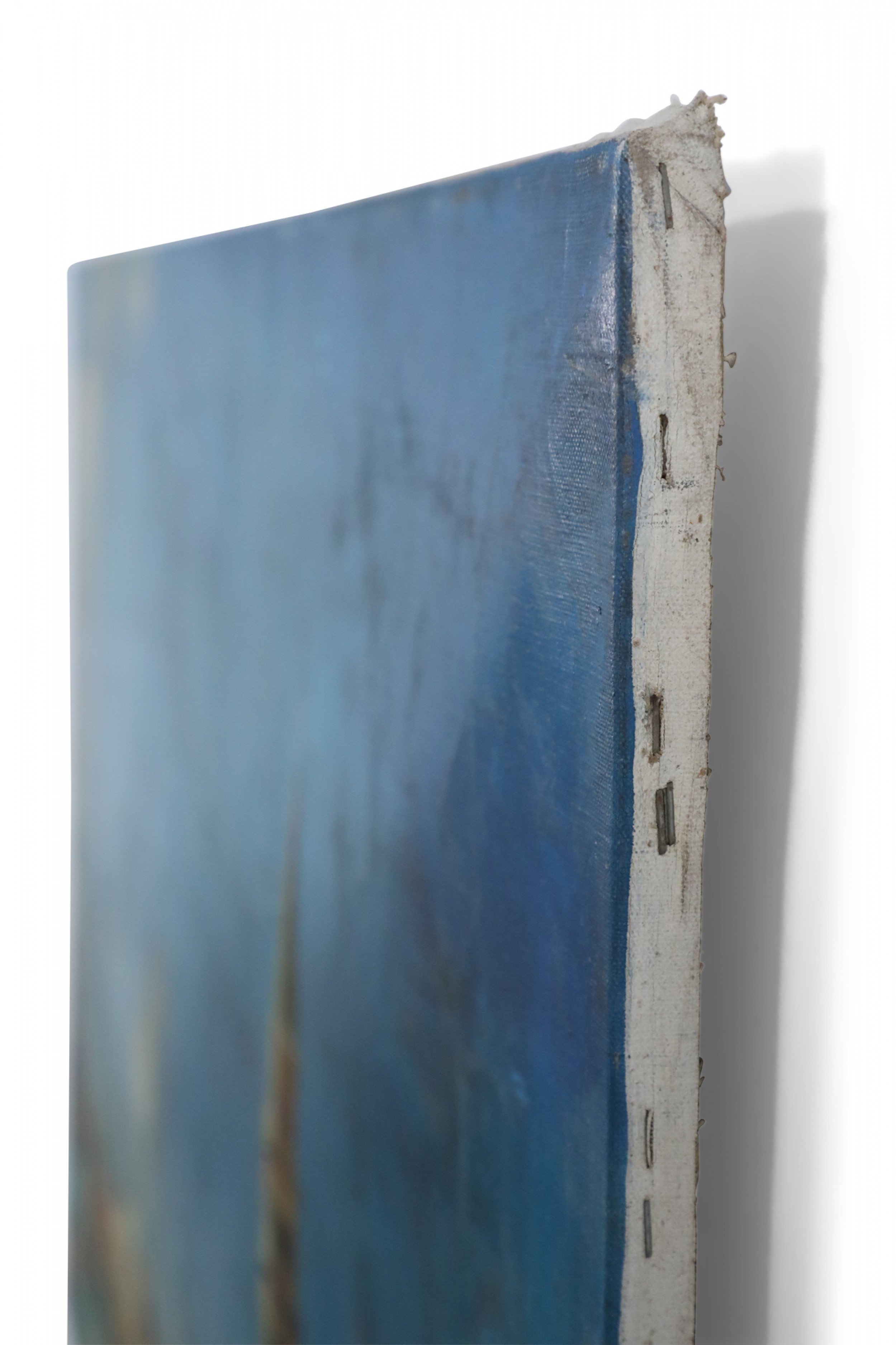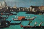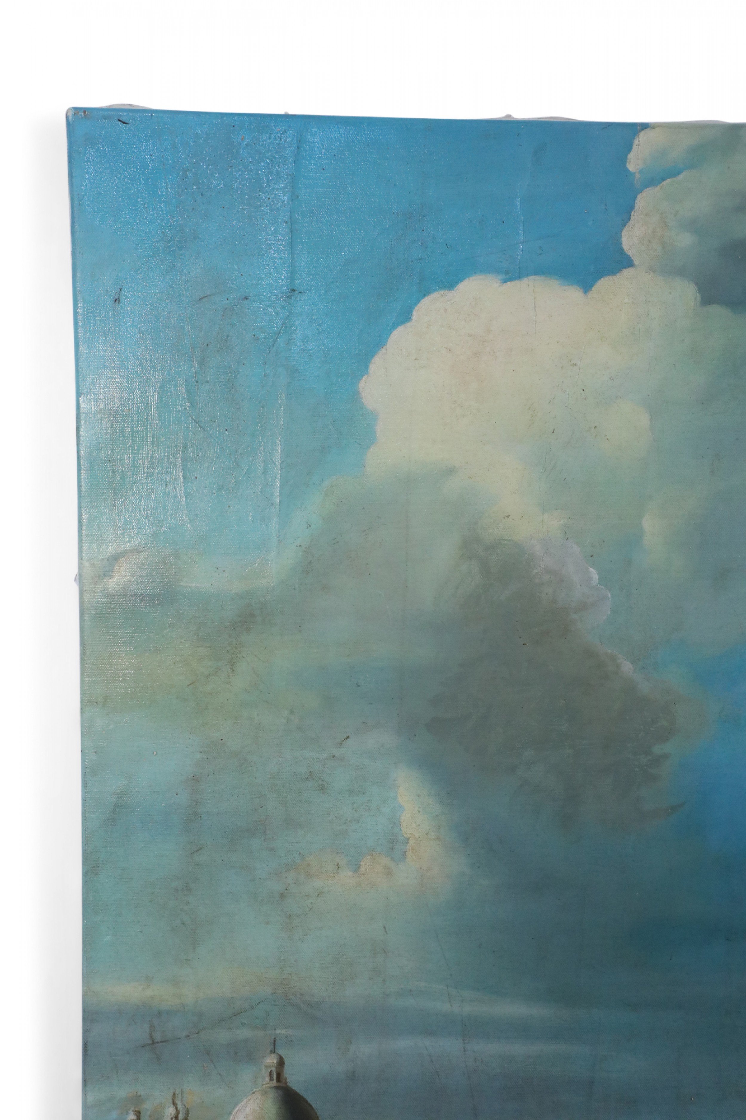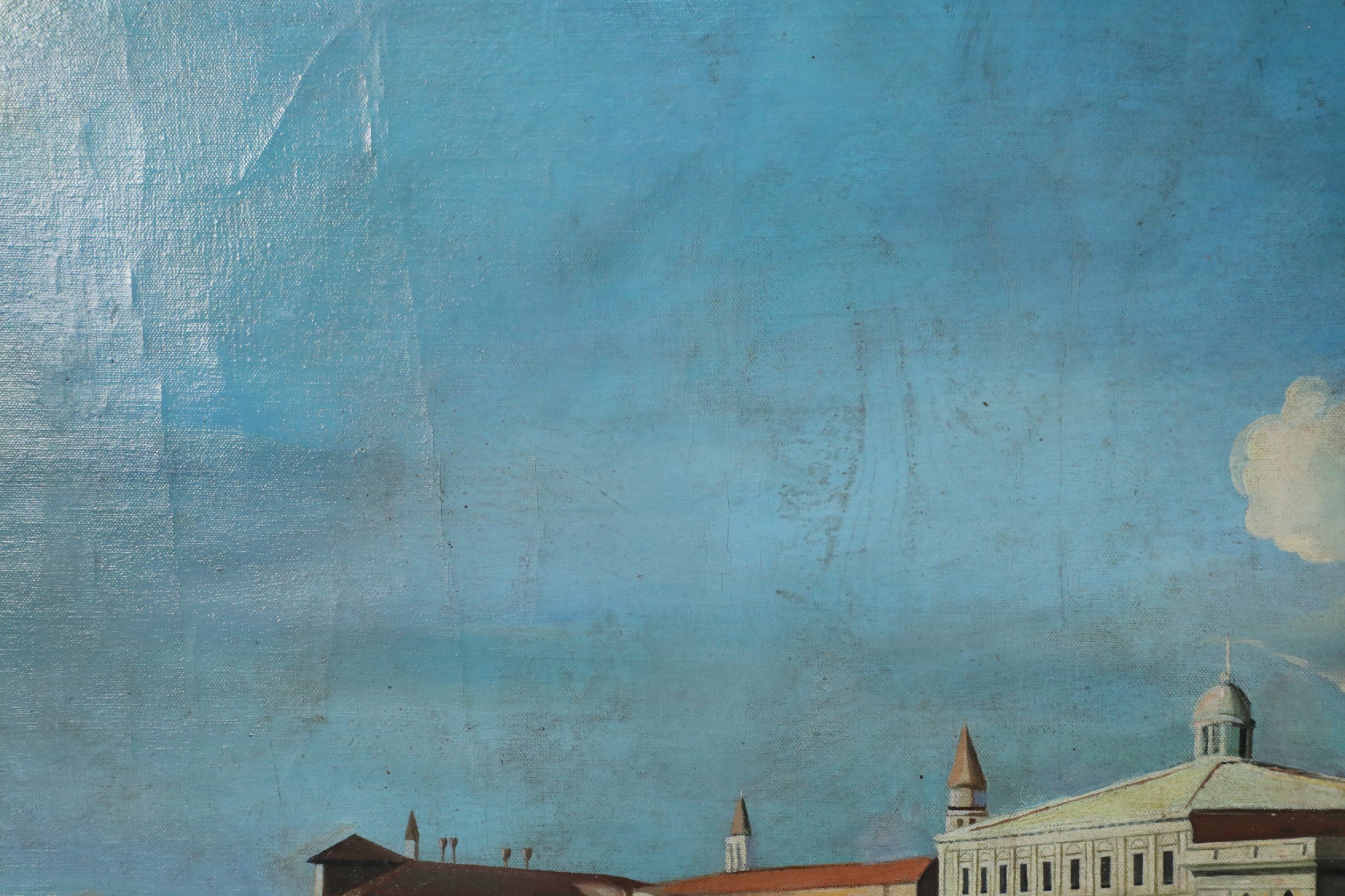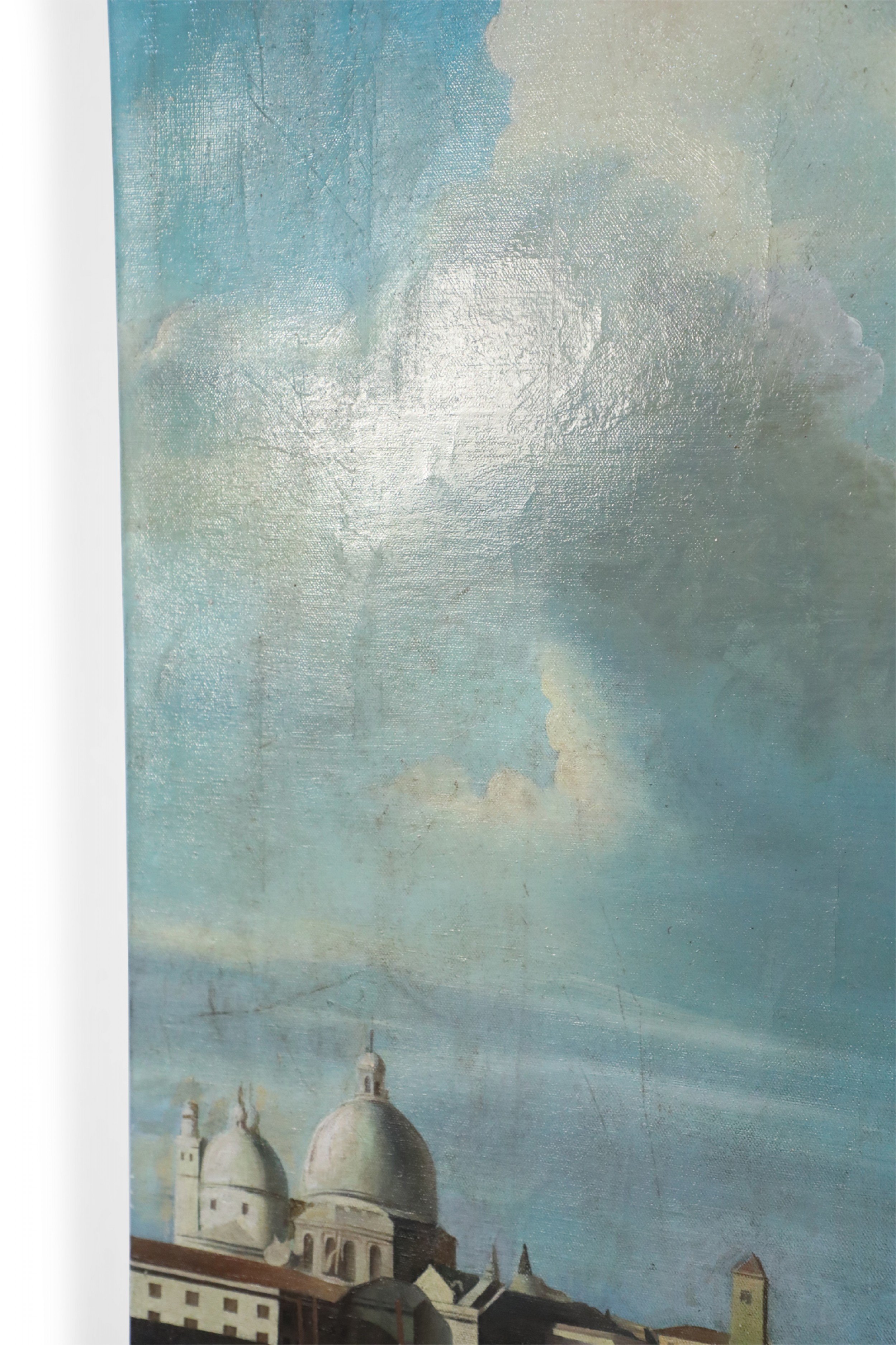 Italian Venetian-Style (20th Century) unframed canvas oil painting of a bright, aqua canal crowded with gondolas under passage in front of Doge's Palace with St Mark's Campanile just behind it, and the domes of the Punta della Dogana visible in the distance in the lower left corner.