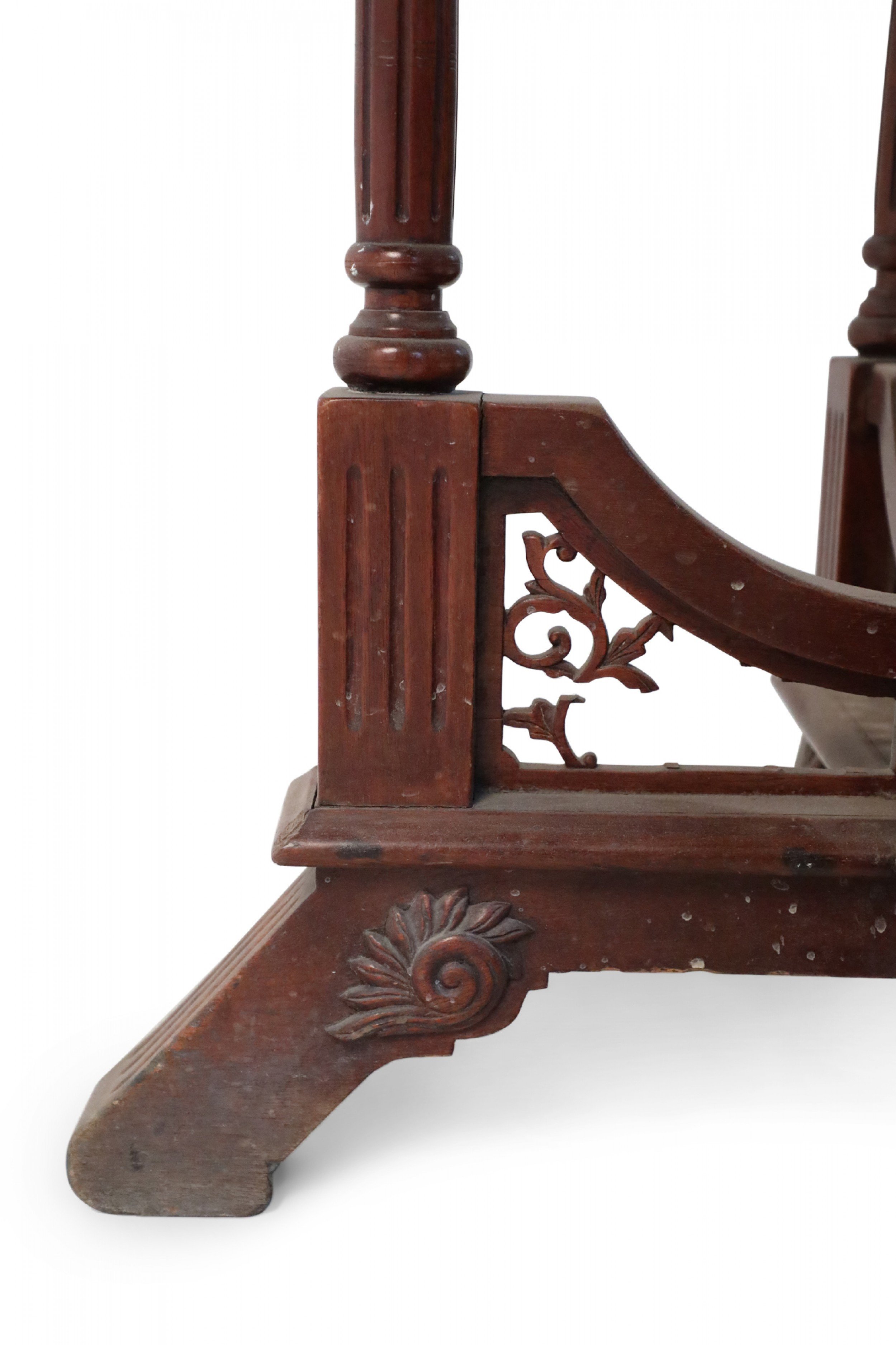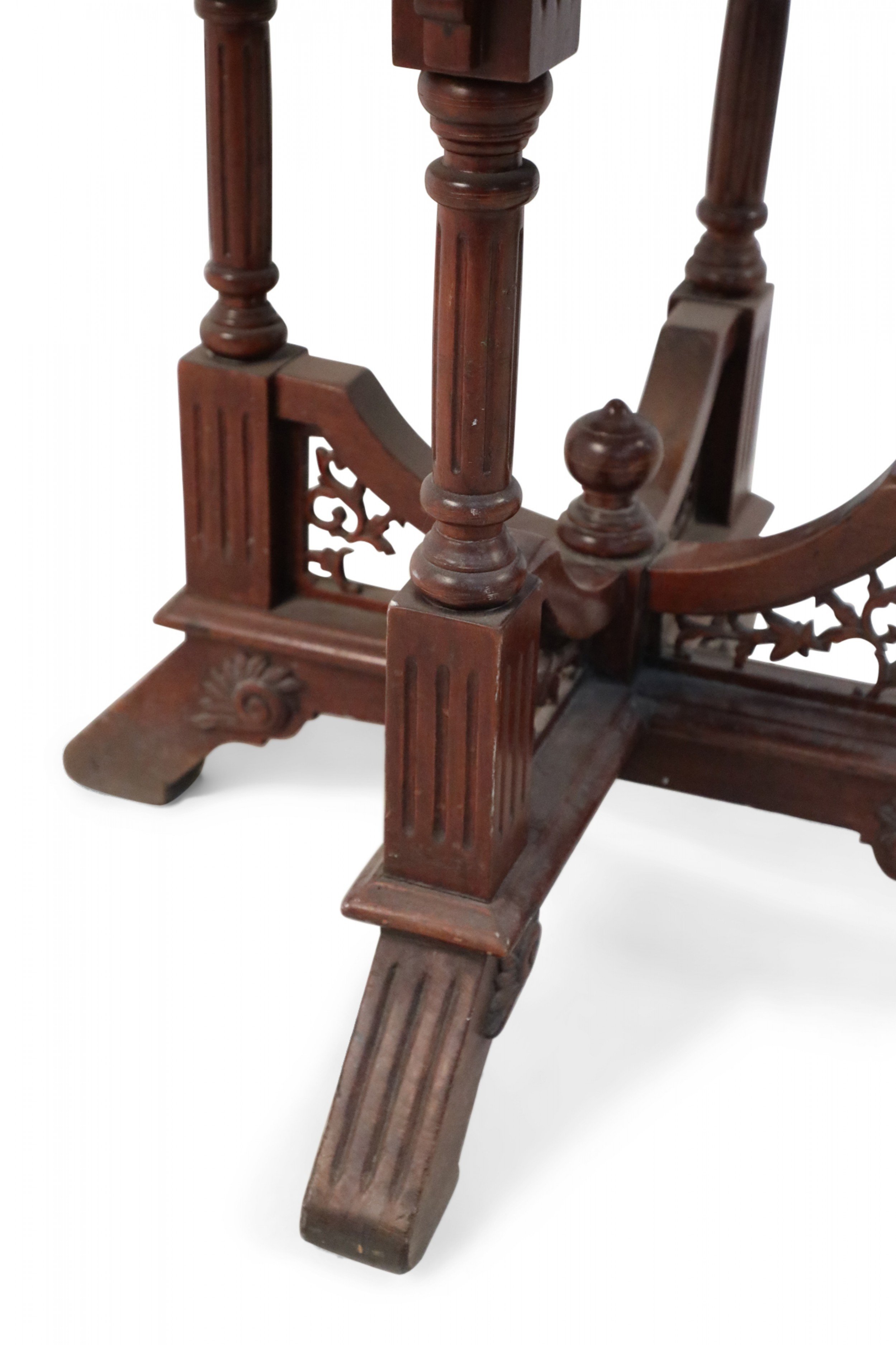 Victorian Aestheticism-style round oak center table having an inset antique 18th century-style blue and white porcelain plate (as is) decorated in alternating bands of circular patterns atop an incised apron supported on four turned and incised legs connected with an x-shaped stretcher with floral and geometric carved designs..