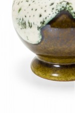 West German Mid-Century ceramic vase with a bulbous bottom on a circular foot and tapered neck that opens to a wide flared mouth, finished with an organically mottled white, green, and brown glaze. (mark on bottom W. GERMANY 66 14)