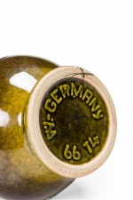 West German Mid-Century ceramic vase with a bulbous bottom on a circular foot and tapered neck that opens to a wide flared mouth, finished with an organically mottled white, green, and brown glaze. (mark on bottom W. GERMANY 66 14).