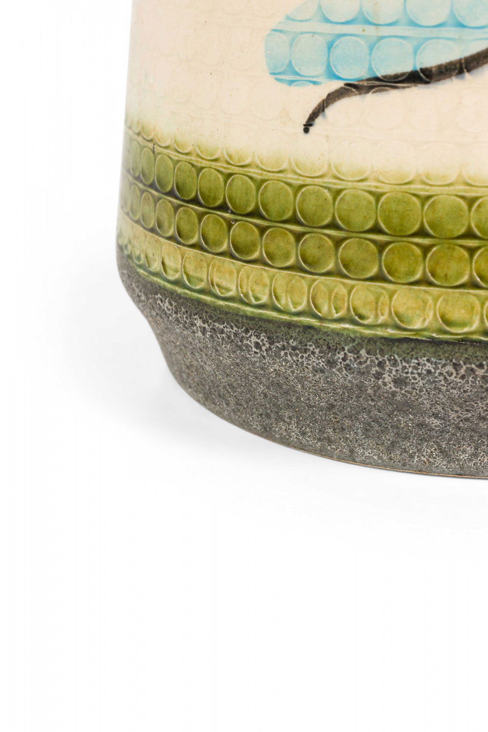 West German Mid-Century cylindrical ceramic vase with a finely painted yellow and green floral design band around the body with a small circle pattern beneath against a multi-tonal gray glazed ground. (mark on bottom, W. GERMANY 276-40)