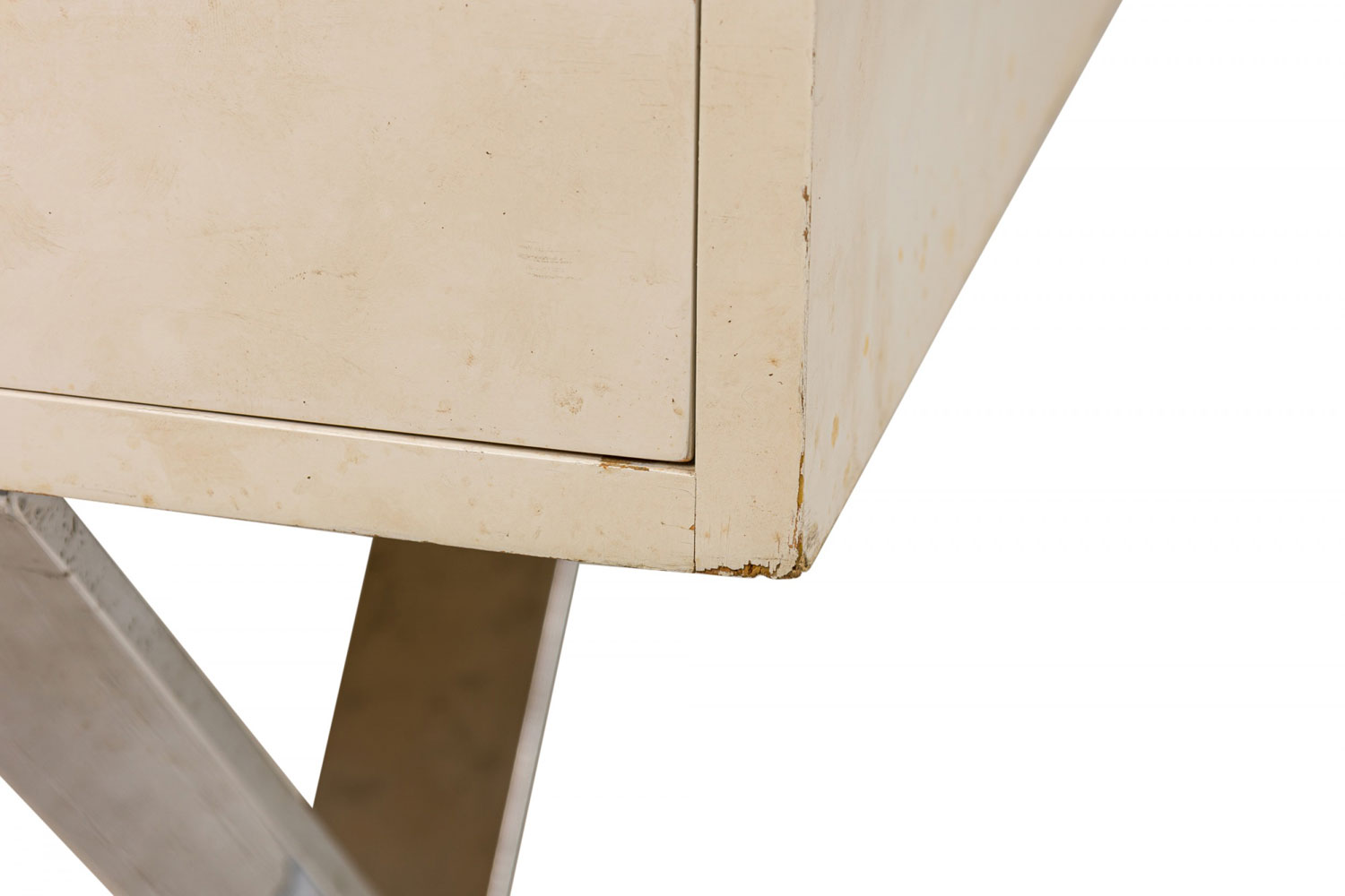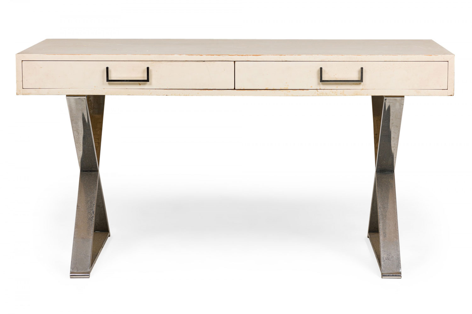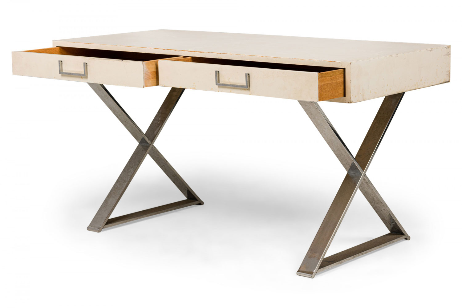 American Mid-Century rectangular campaign desk with a white lacquered top with two drawers with silver metal bracket-shaped drawer pulls resting on two X-shaped silver metal legs. (WEST MICHIGAN FURNITURE COMPANY) (Similar Desk: DUF0206)
