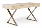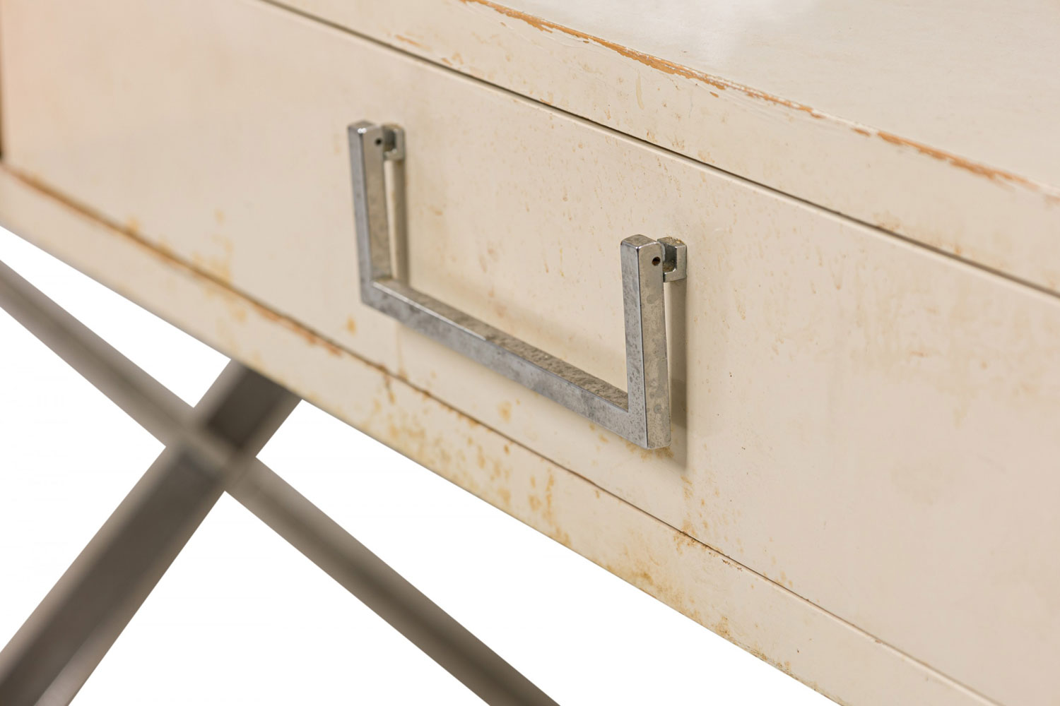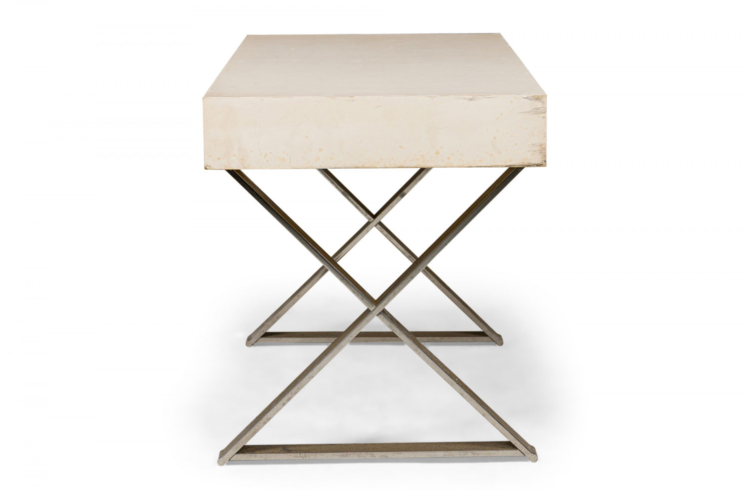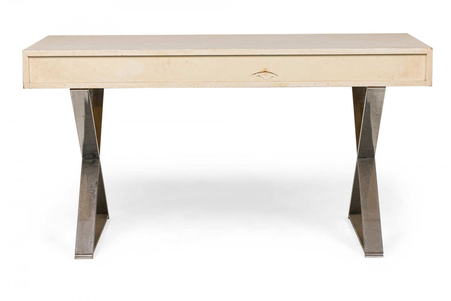 American Mid-Century rectangular campaign desk with a white lacquered top with two drawers with silver metal bracket-shaped drawer pulls resting on two X-shaped silver metal legs. (WEST MICHIGAN FURNITURE COMPANY) (Similar Desk: DUF0206)