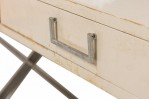 American Mid-Century rectangular campaign desk with a white lacquered top with two drawers with silver metal bracket-shaped drawer pulls resting on two X-shaped silver metal legs. (WEST MICHIGAN FURNITURE COMPANY) (Similar Desk: DUF0206).