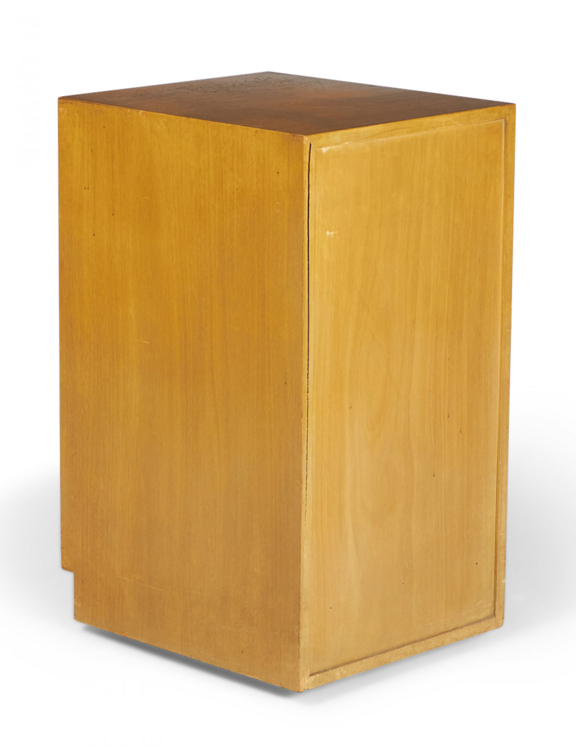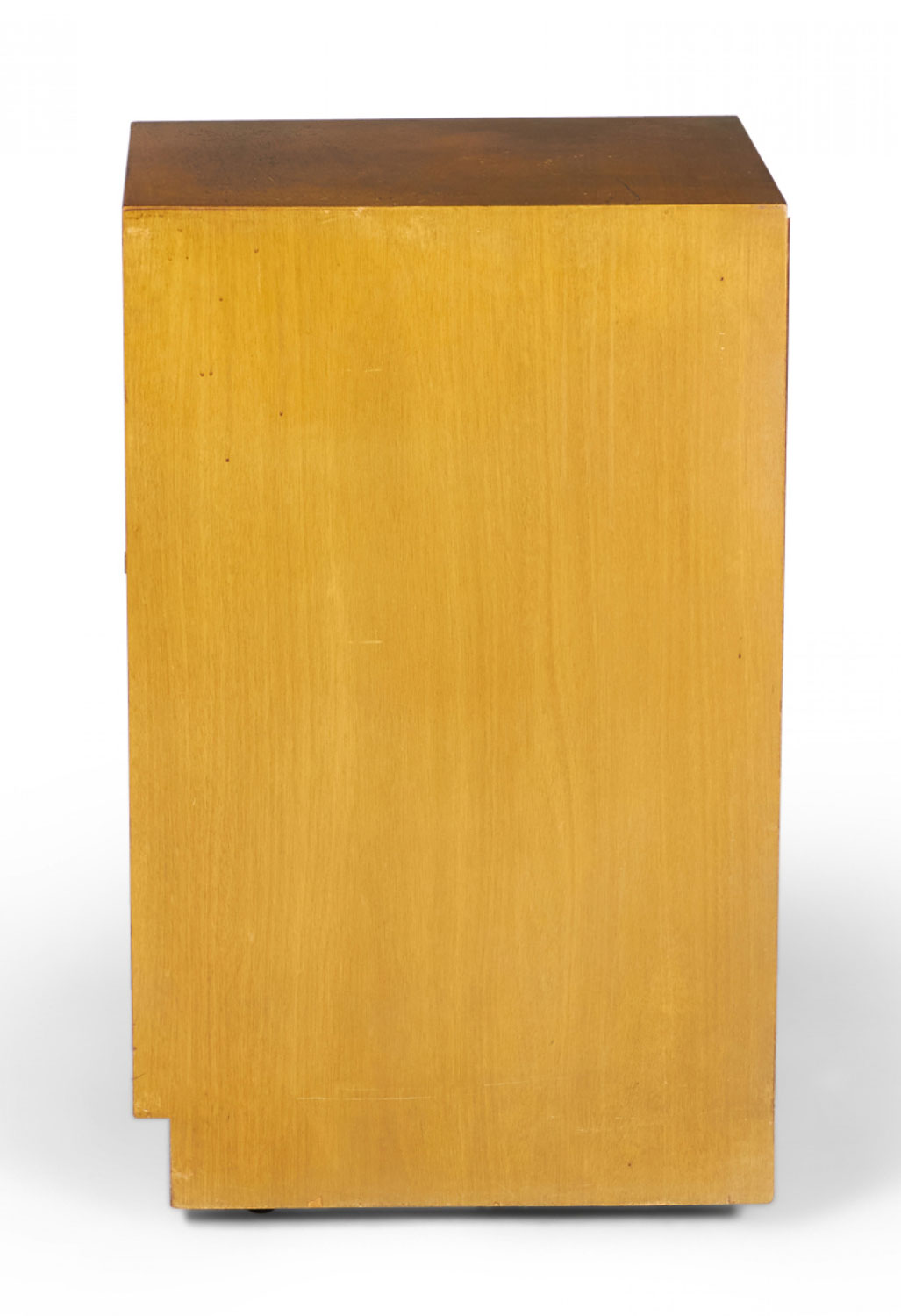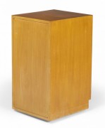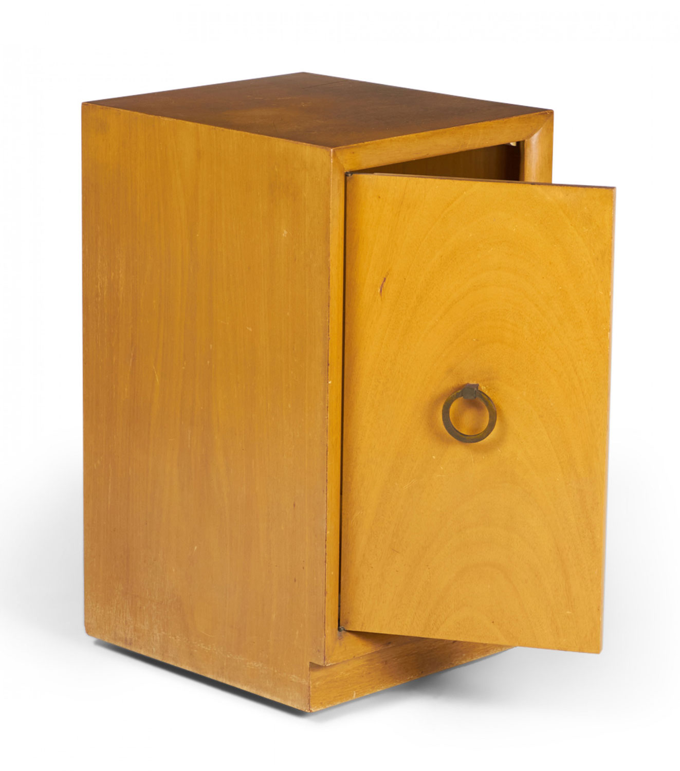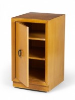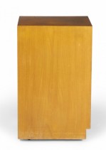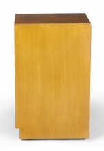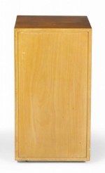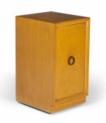 American Mid-Century blond maple nightstand / tall cabinet with a single compartment concealed by a hinged door with a bronze ring door pull. (WIDDICOMB MODERN)(Similar cabinets: DUF0149B, DUF0149C).