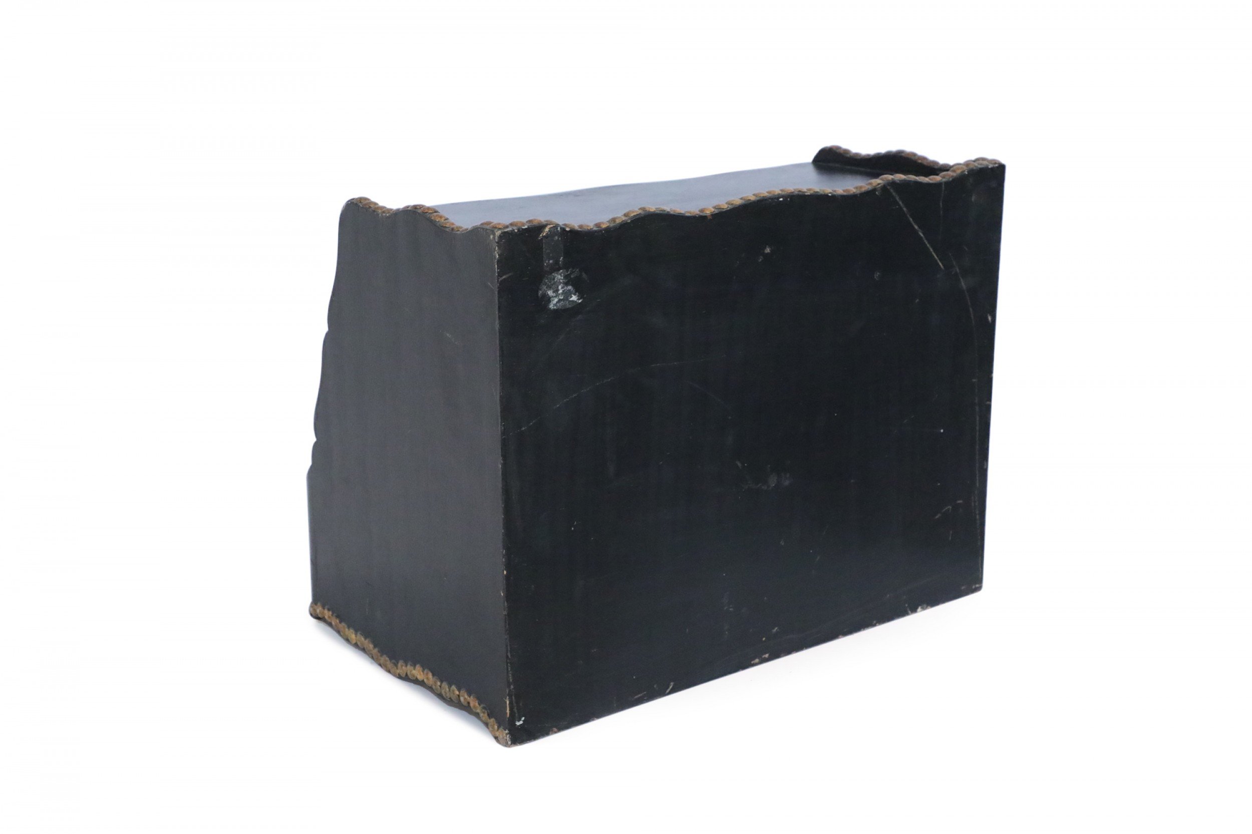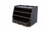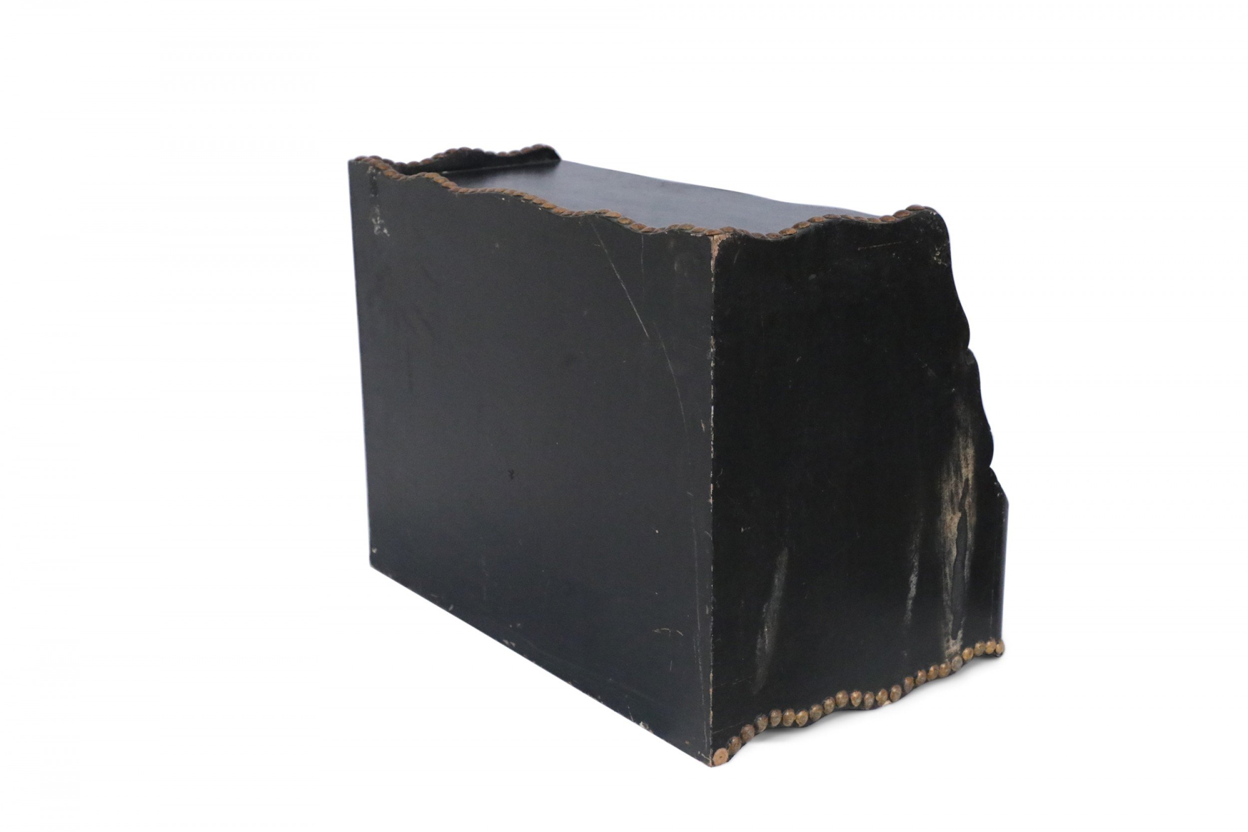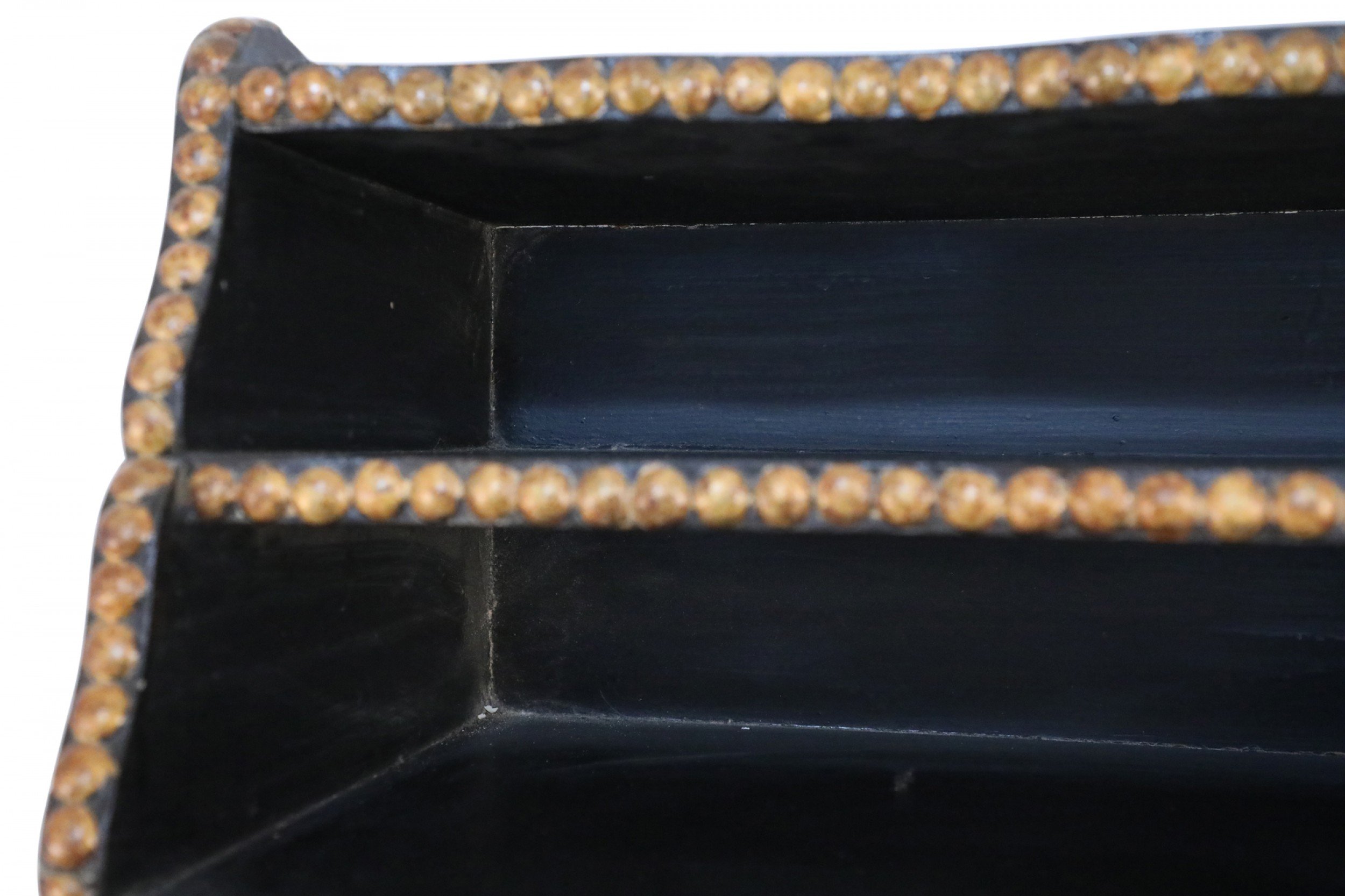 Windsor-style (modern) black top of desk shelving unit with three compartments trimmed in gold, nailhead-like dots, and scalloped top and bottom edges..