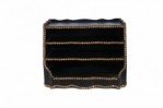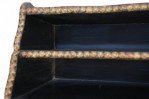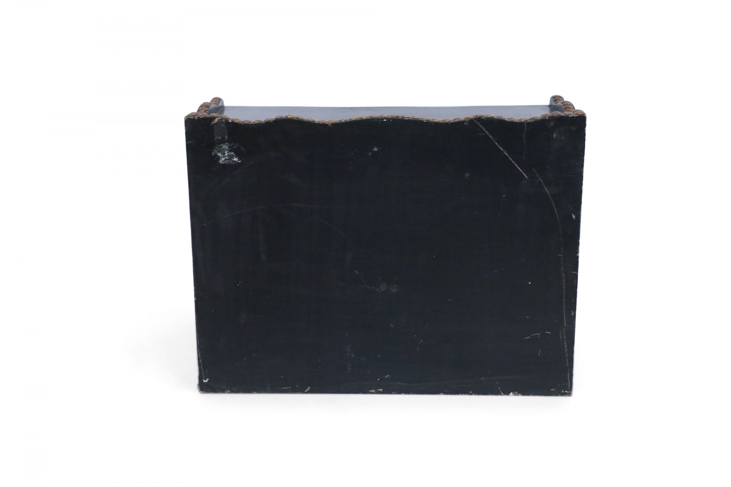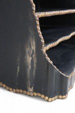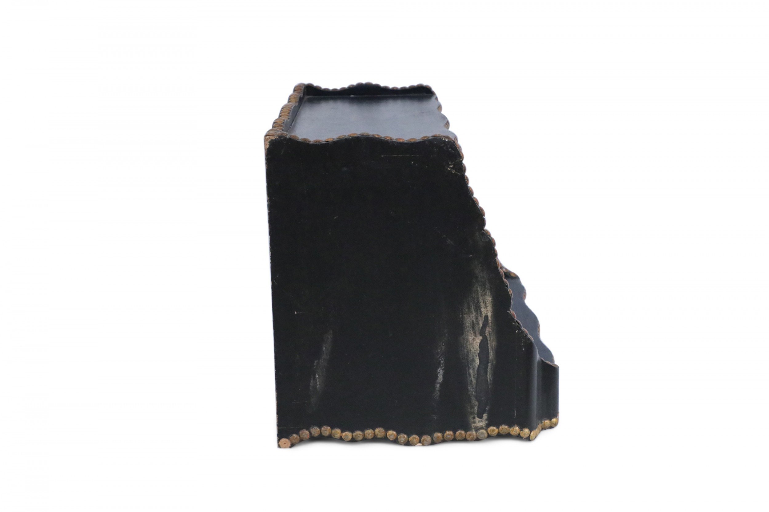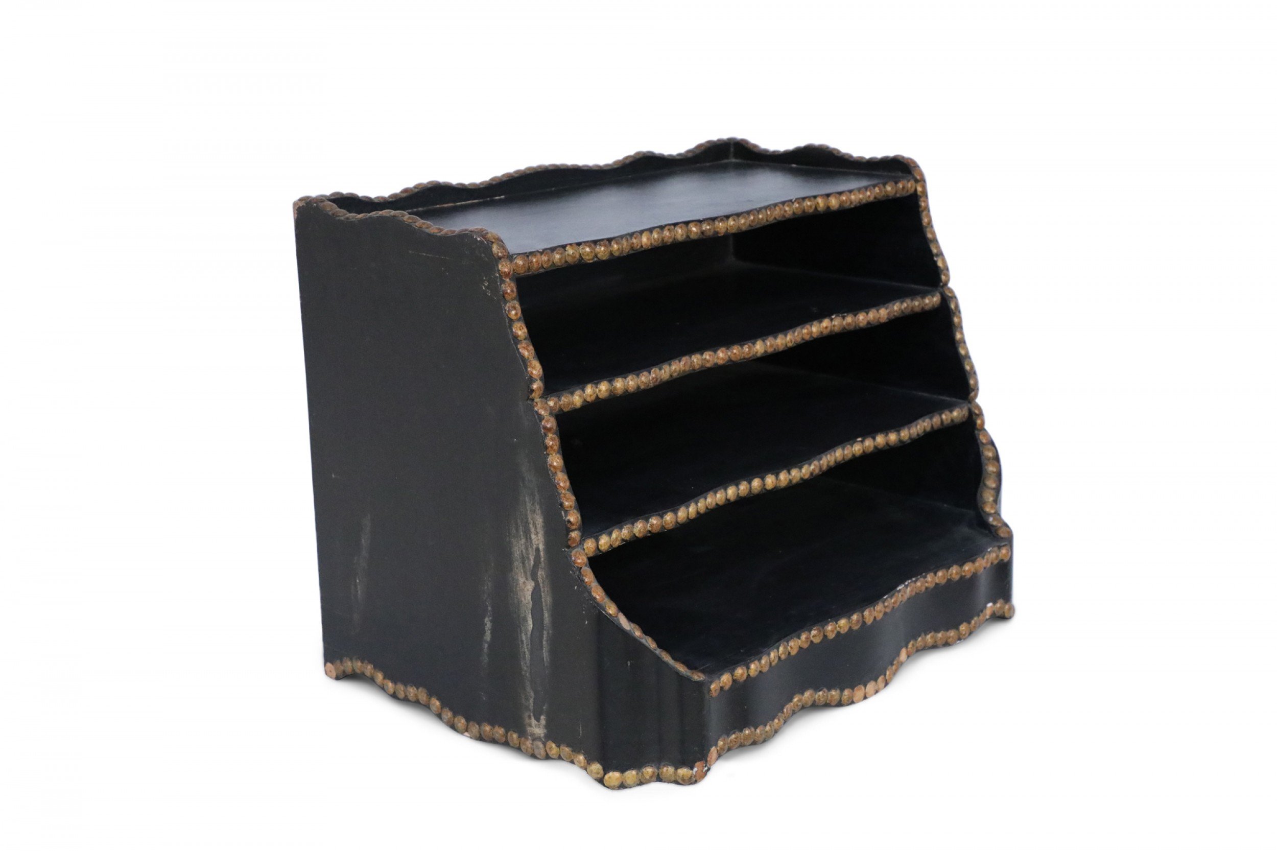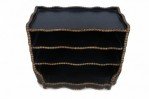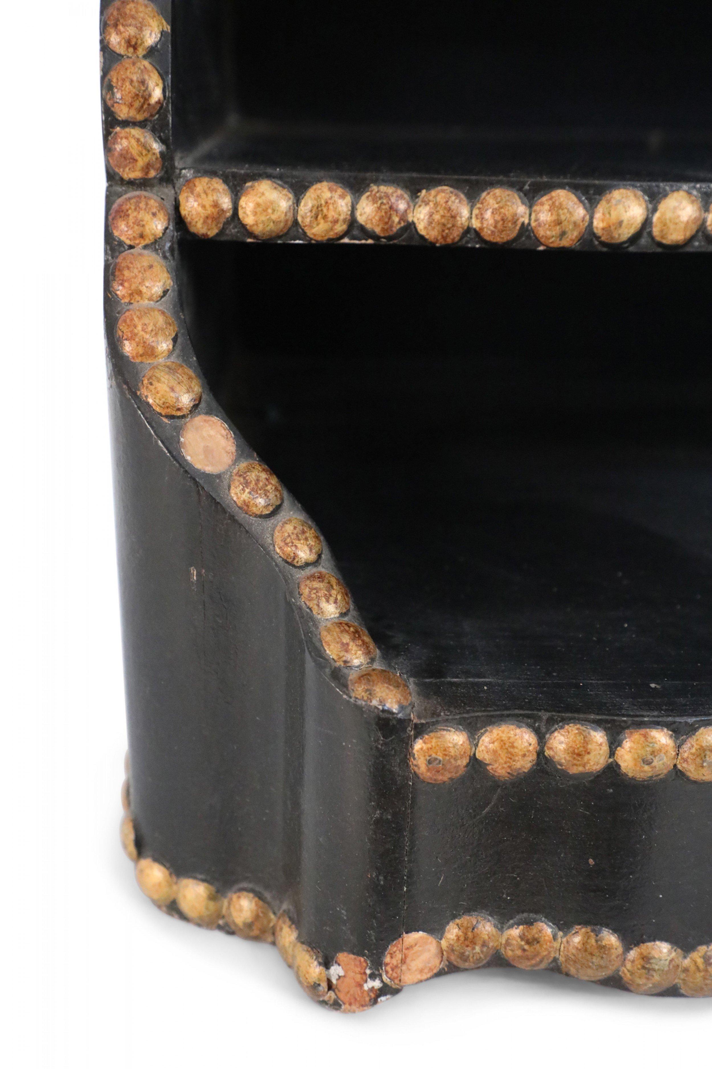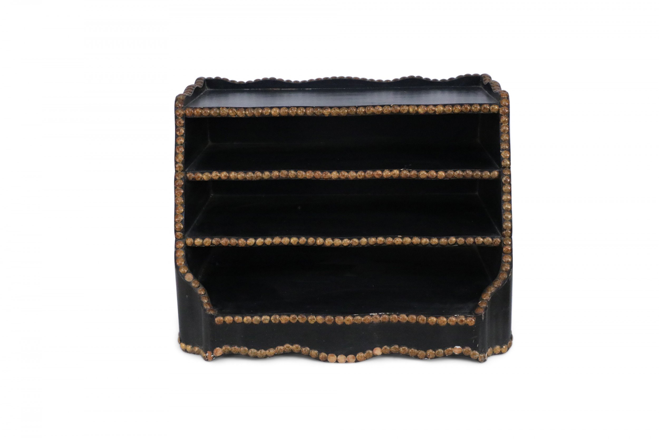 Windsor-style (modern) black top of desk shelving unit with three compartments trimmed in gold, nailhead-like dots, and scalloped top and bottom edges.