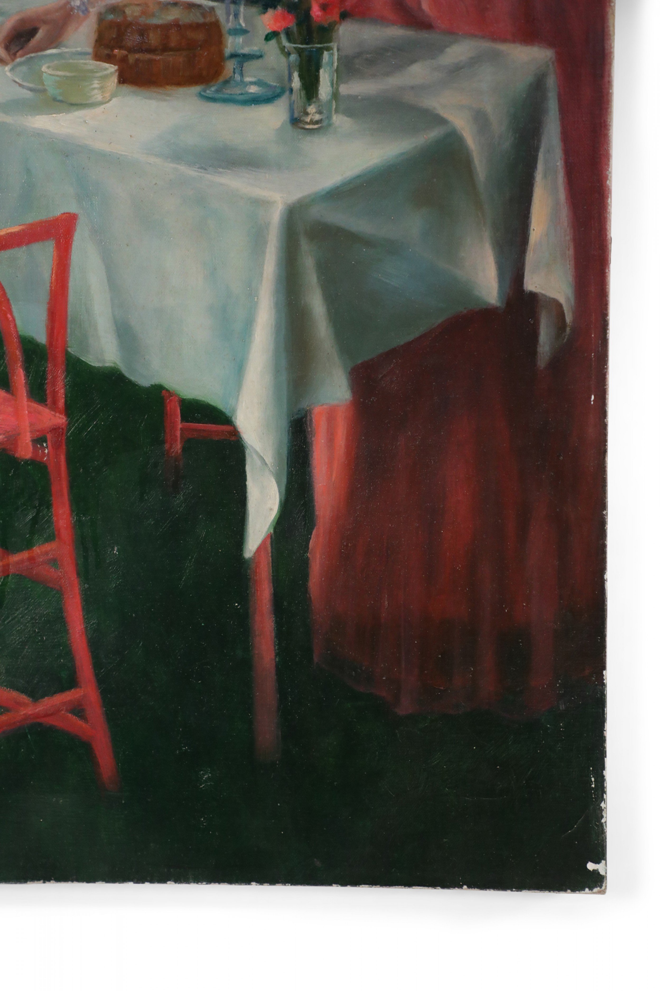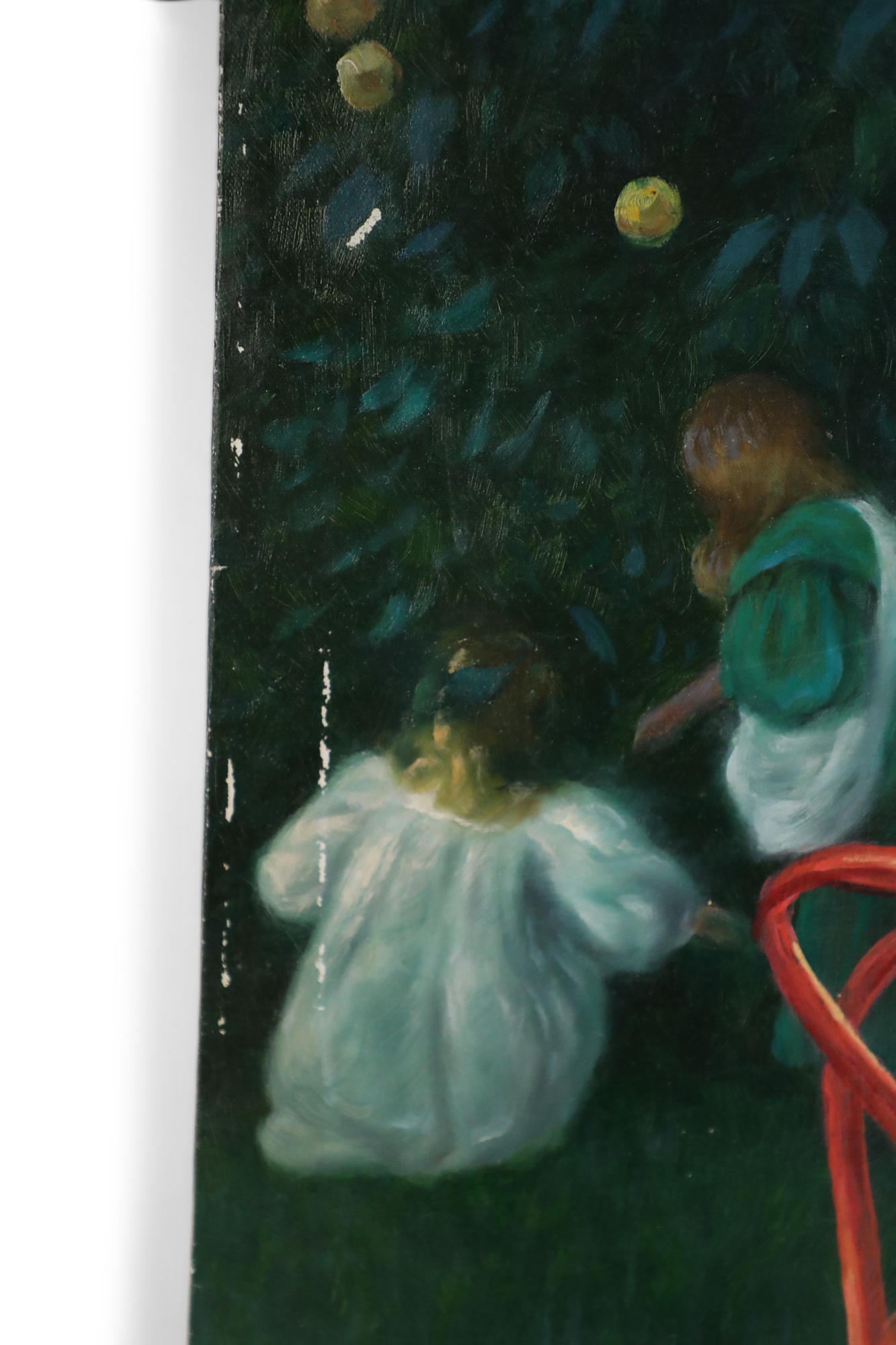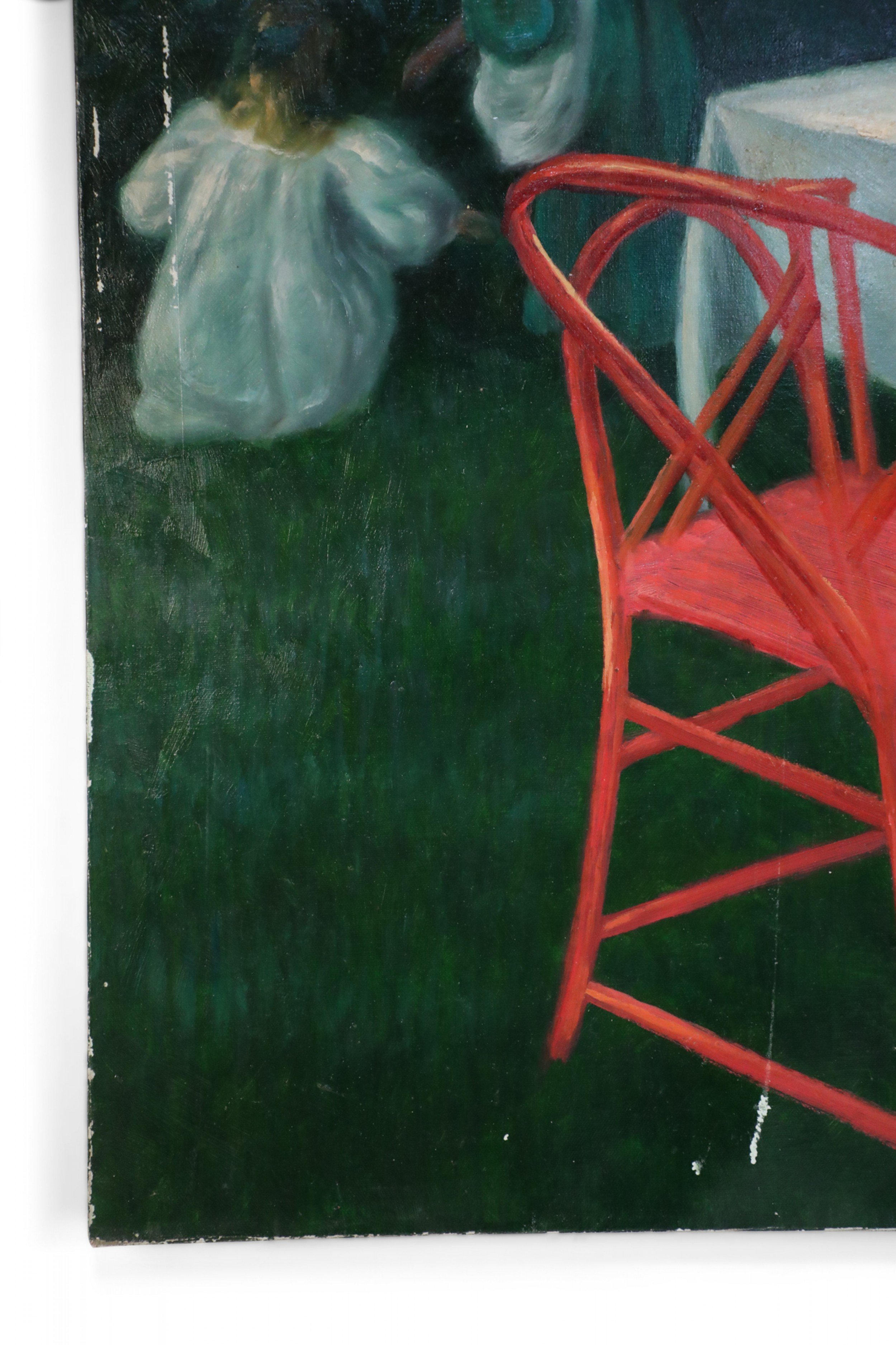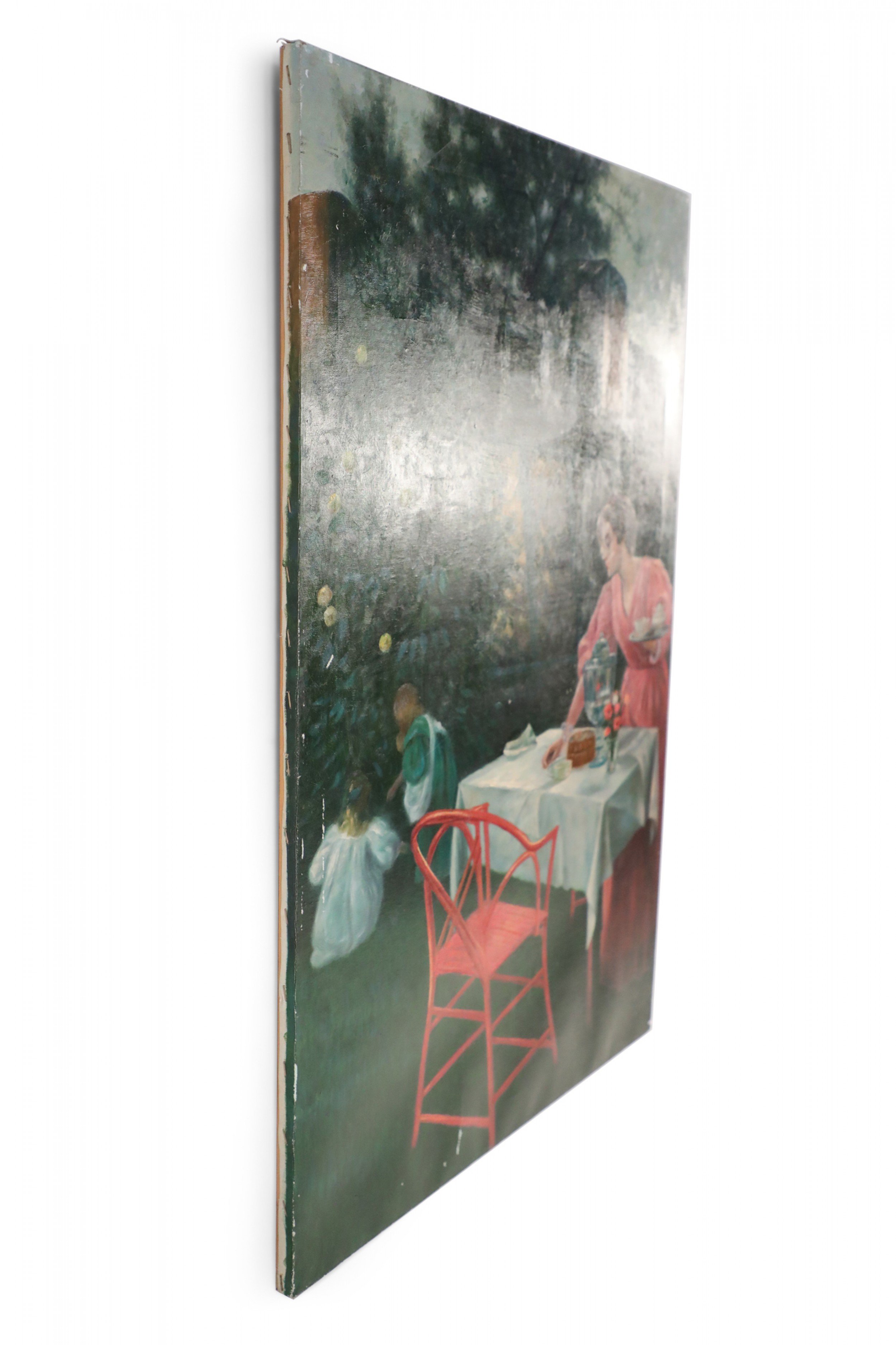 English Victorian style (20th Century) unframed canvas oil painting of a woman wearing a long pink dress setting a table for tea alongside a home, while two children play under a nearby apple tree.