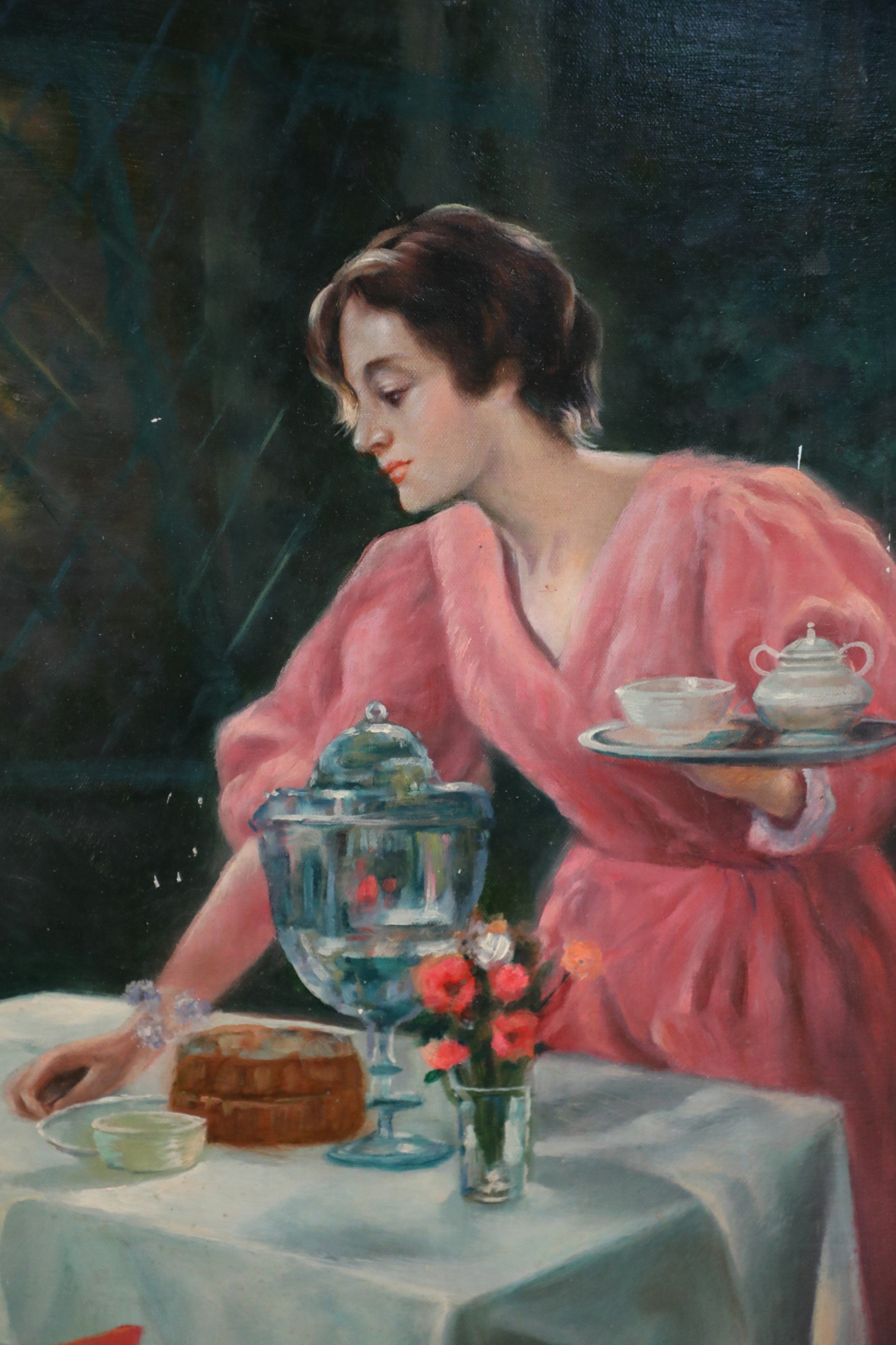 English Victorian style (20th Century) unframed canvas oil painting of a woman wearing a long pink dress setting a table for tea alongside a home, while two children play under a nearby apple tree..