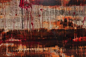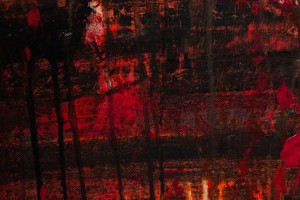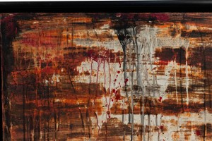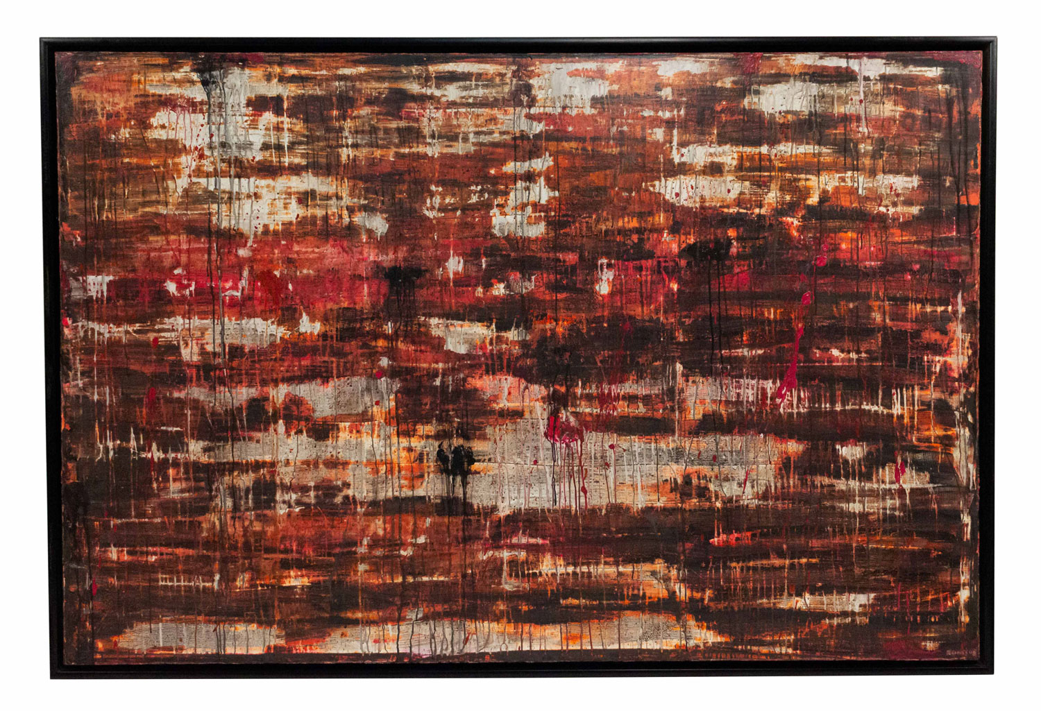 Acrylic on canvas painting in red and white strokes with a black frame by Richard Rumi, "Dragon's Den"..
