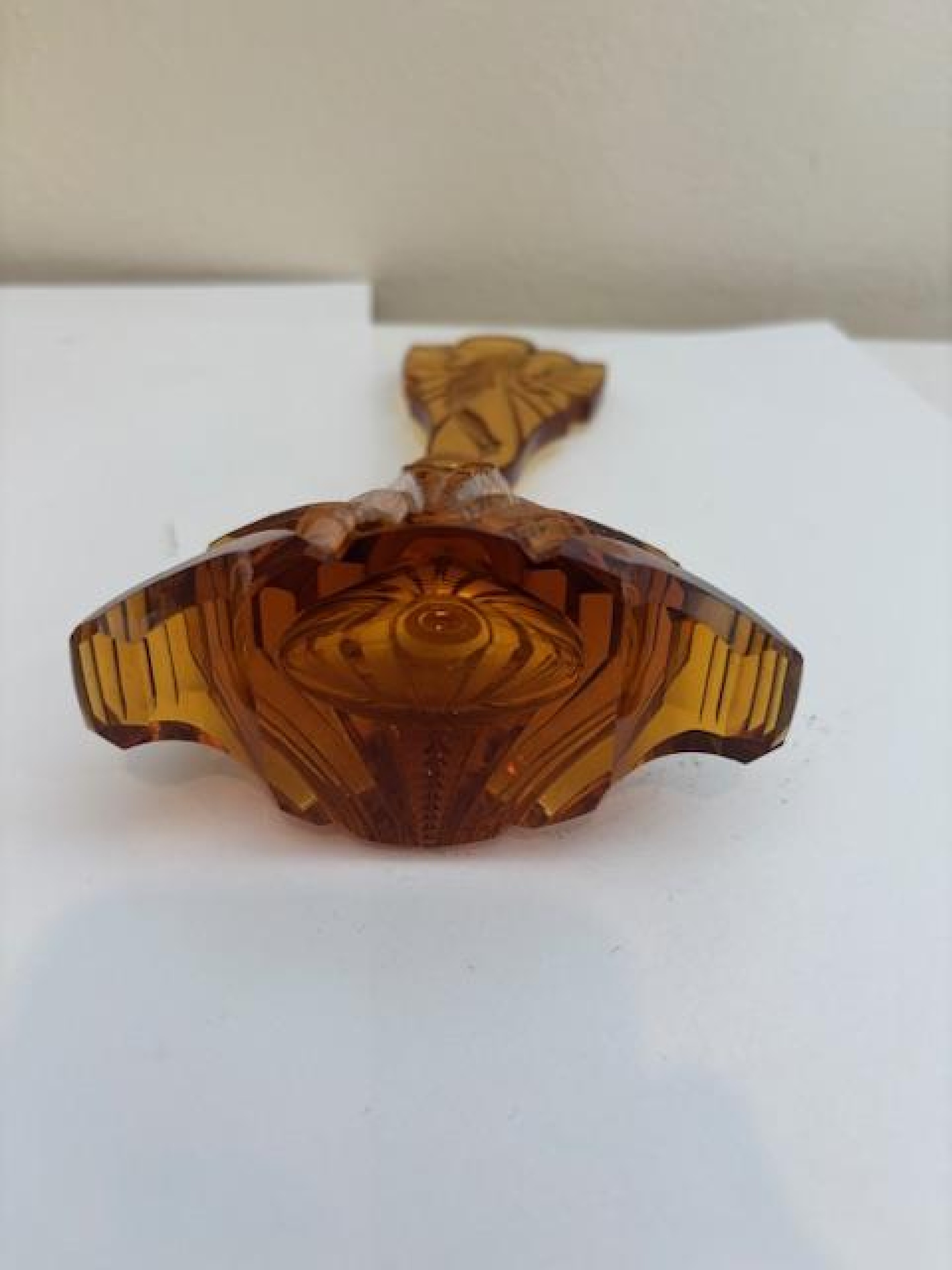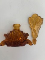 American Art Deco amber cut glass perfume bottle with flaired design base supporting a stopper with an etched figure of a lady.