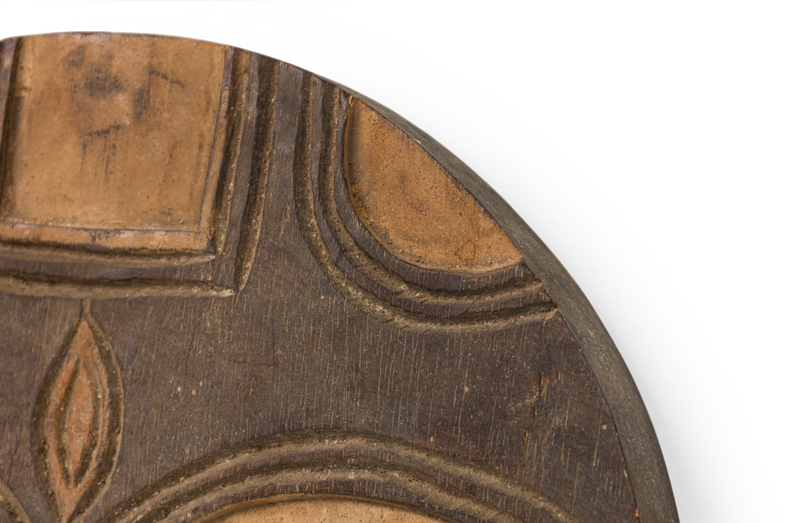 African Democratic Republic of the Congo Late 20th Century carved & painted Teke disc mask plaque in flattened circular form features symmetric relief shapes which suggest a geometric face with incised double borders and a pale green painted finish.