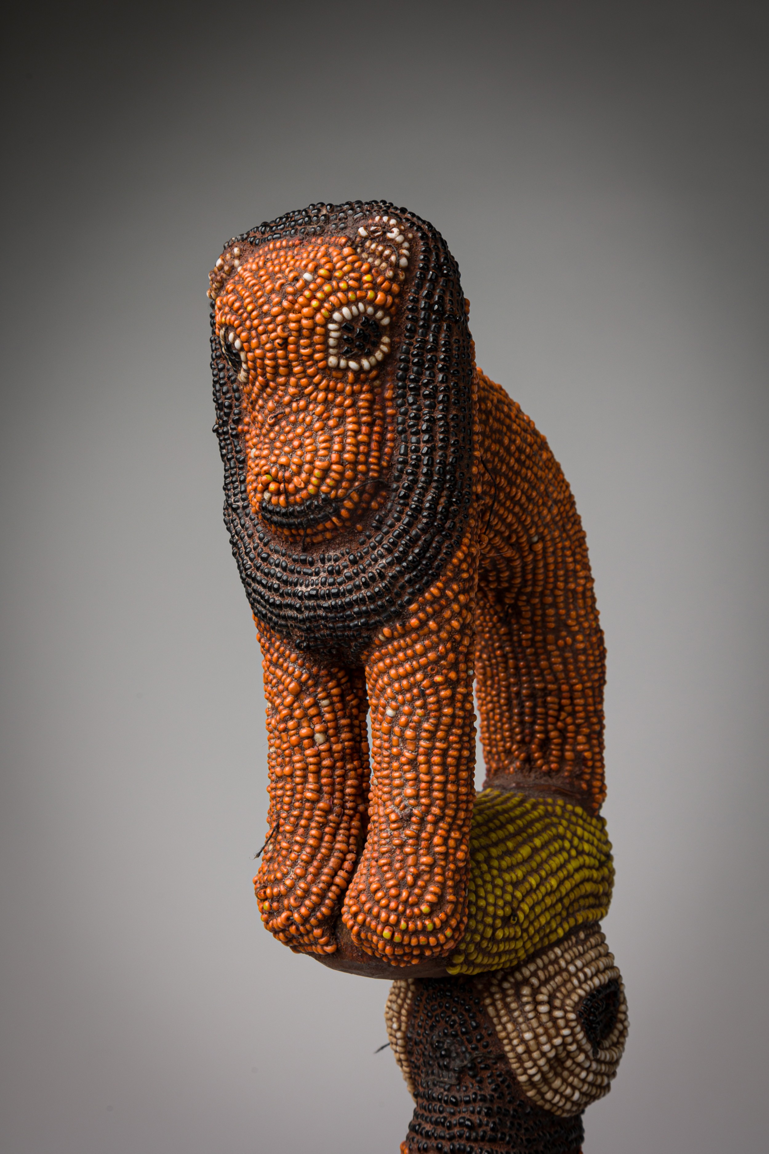 Style: Misc. Style Materials & Techniques: Wood Category: Stands/Racks Condition: Good, shows minor patina, no bead loss observed, stray threads, metal mounting pin sunk into base