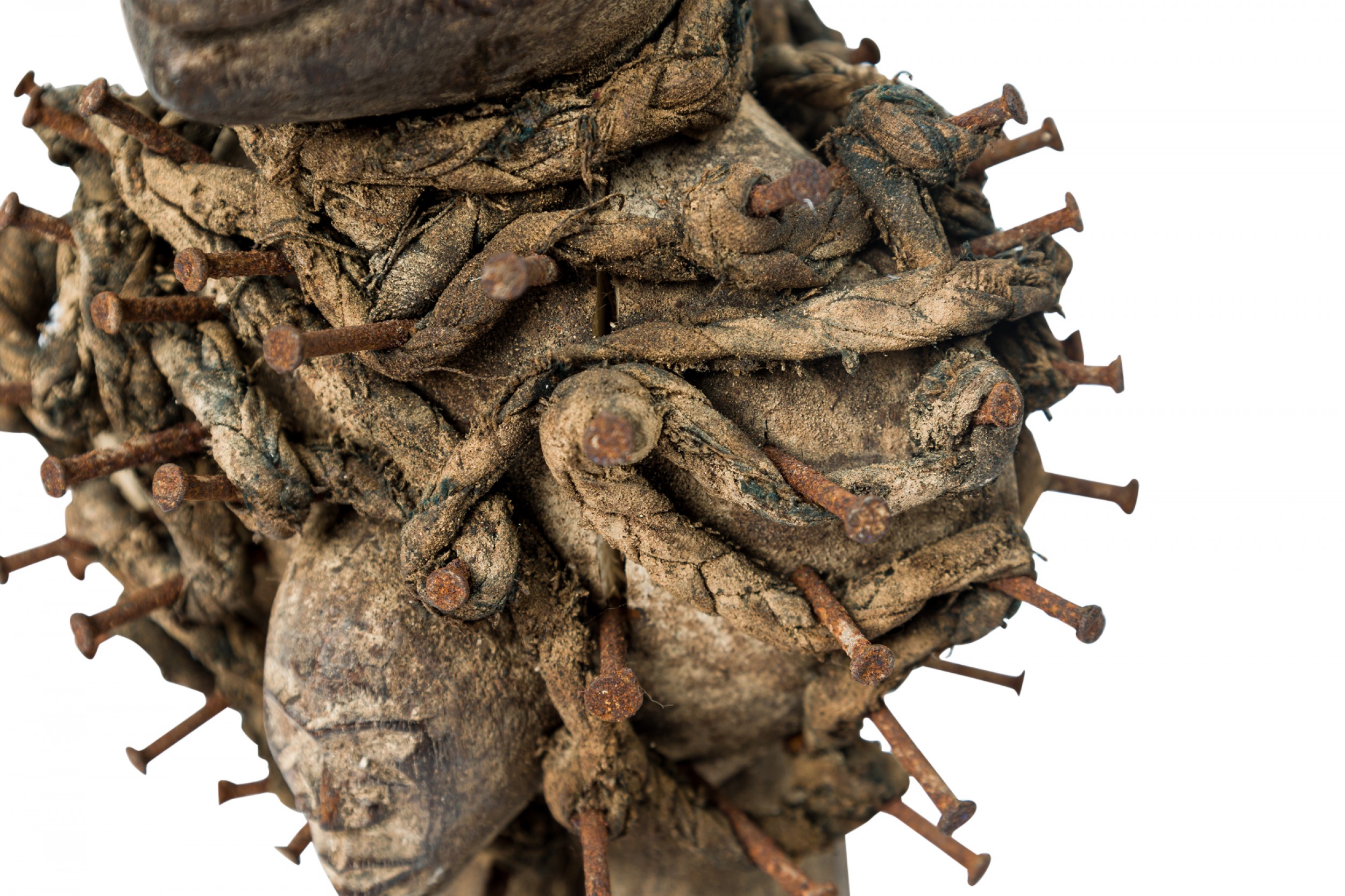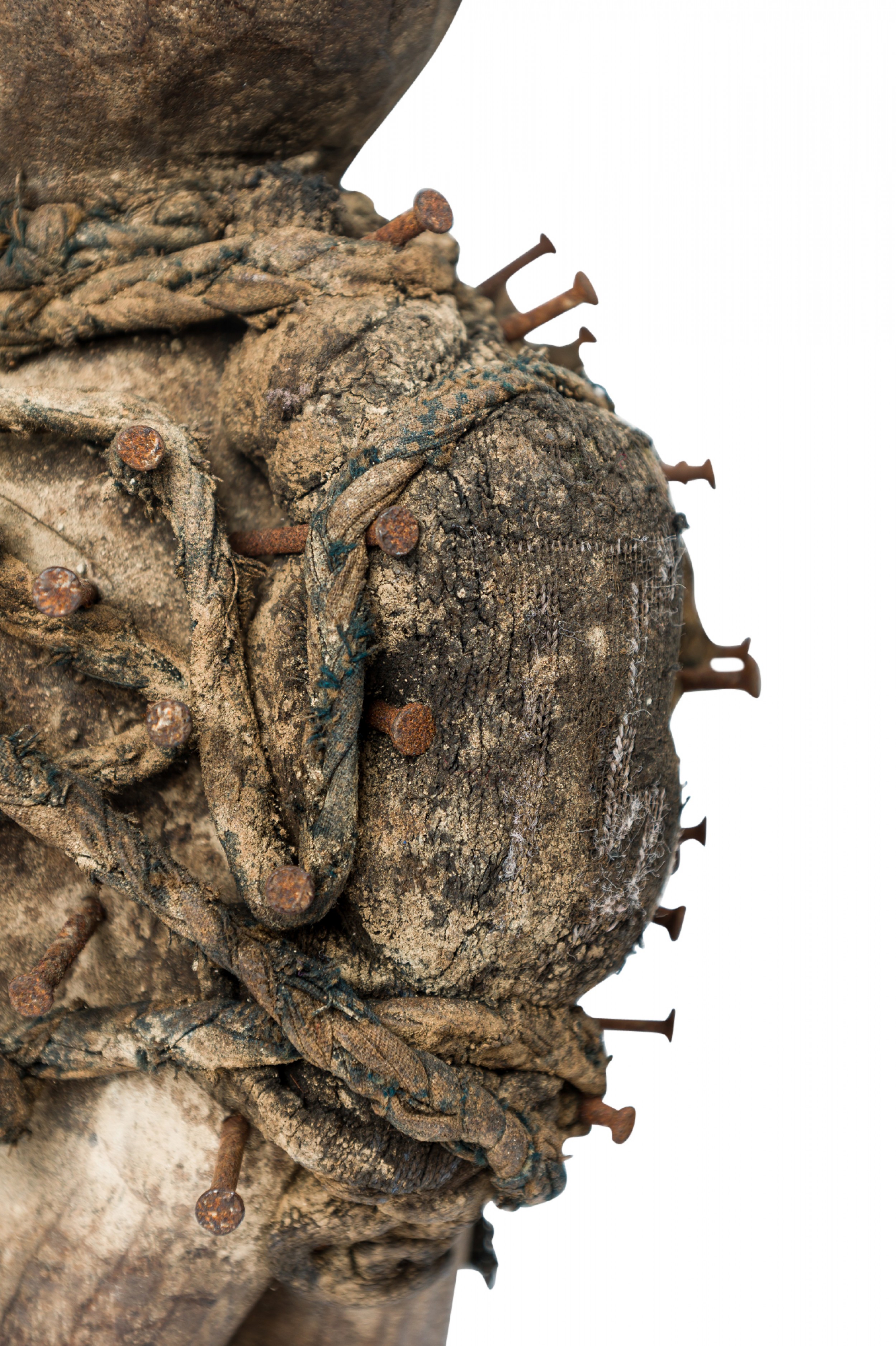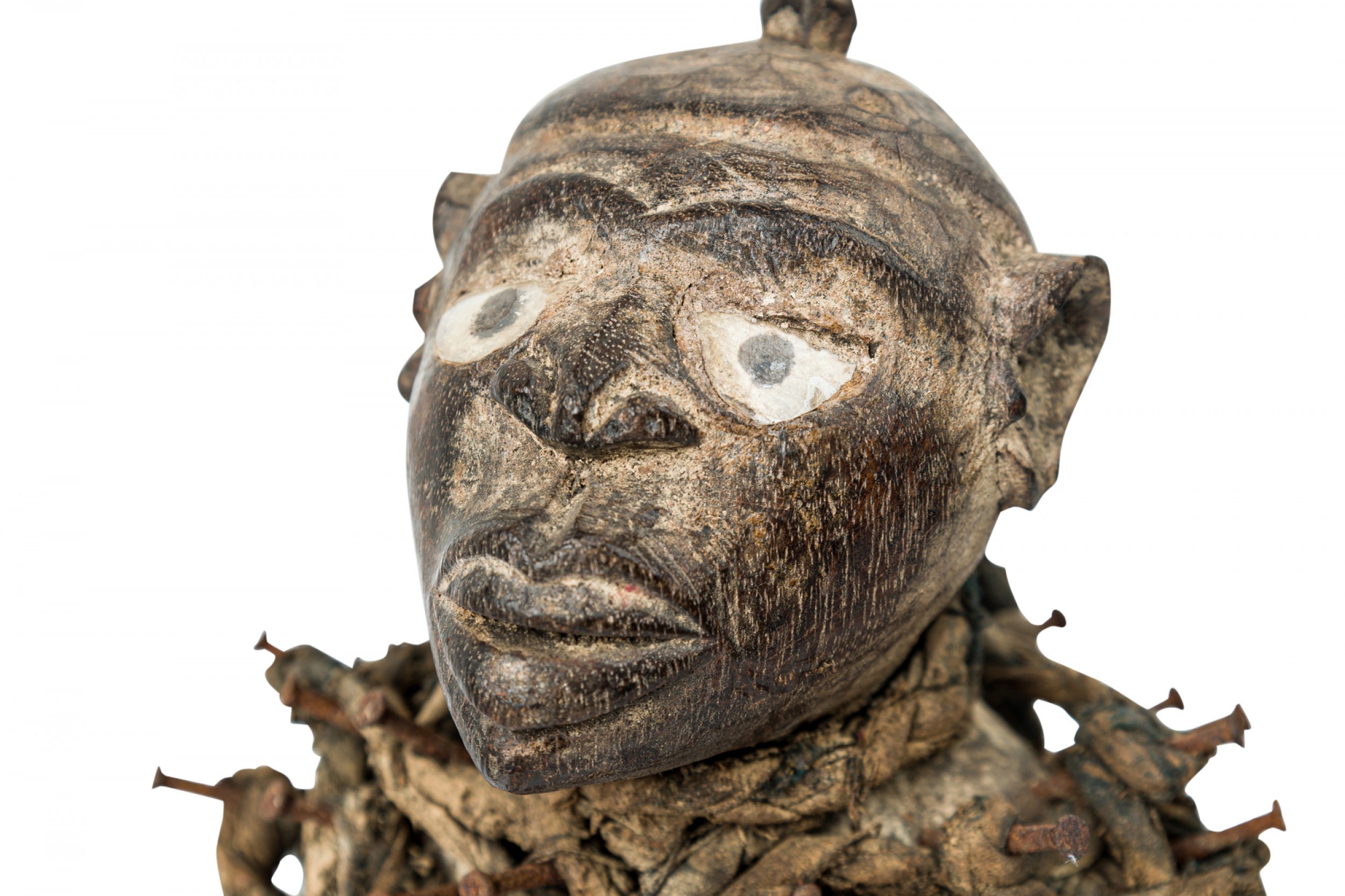 African Democratic Republic of the Congo 20th Century carved wood male nail fetish guardian figure ("Yombe Nkisi Nkonde") with inlaid glass over painted eyes, a human head in its belly, roped bundles and metal nails. (Similar items: NWL6885, NWL6886, NWL6887, NWL6888, NWL6889, NWL6932)