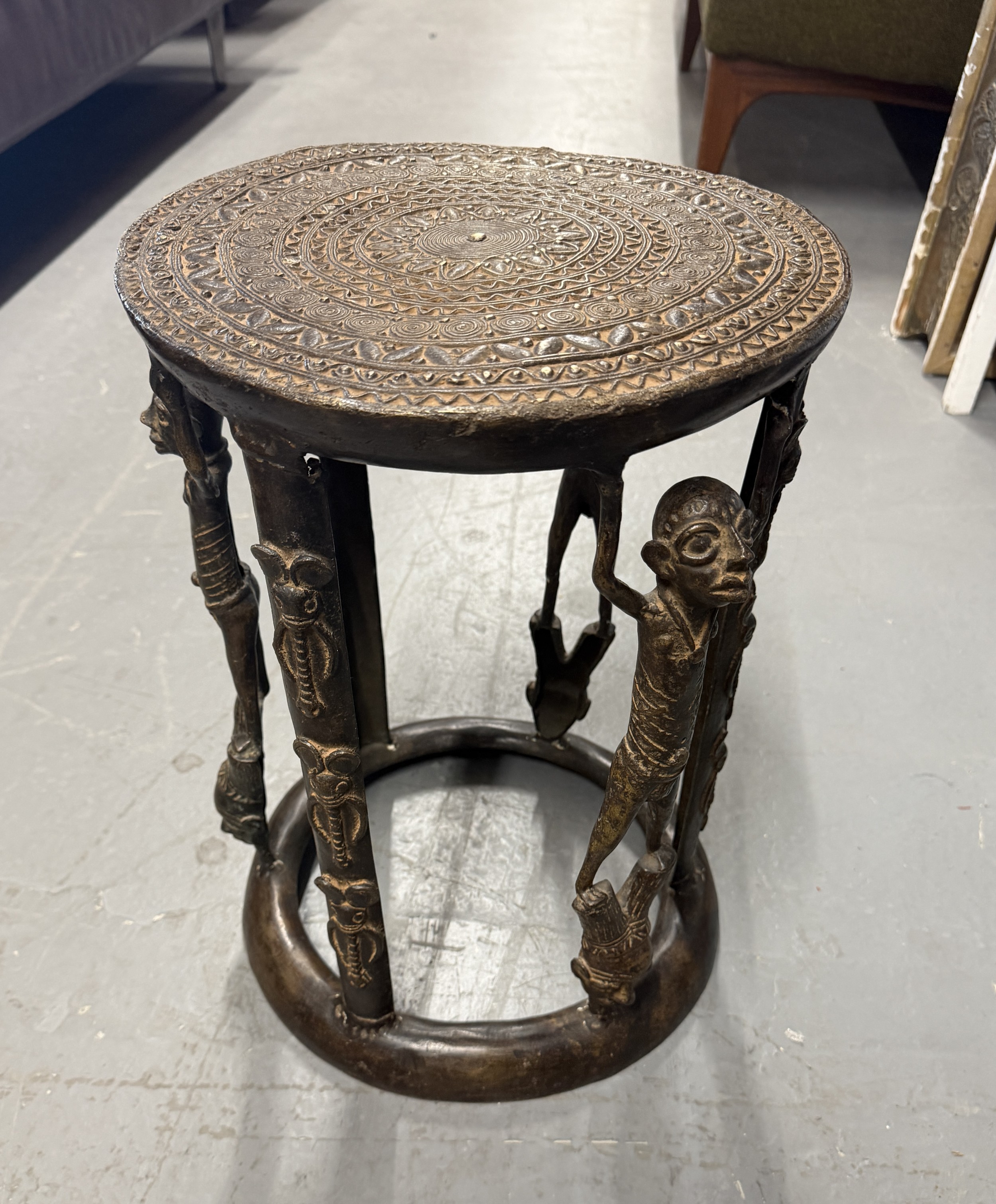 African Tikar bronze stool from Cameroon with 3 human figurines above 3 masks, holding the seating platform, originally used for ceremonial purposes.