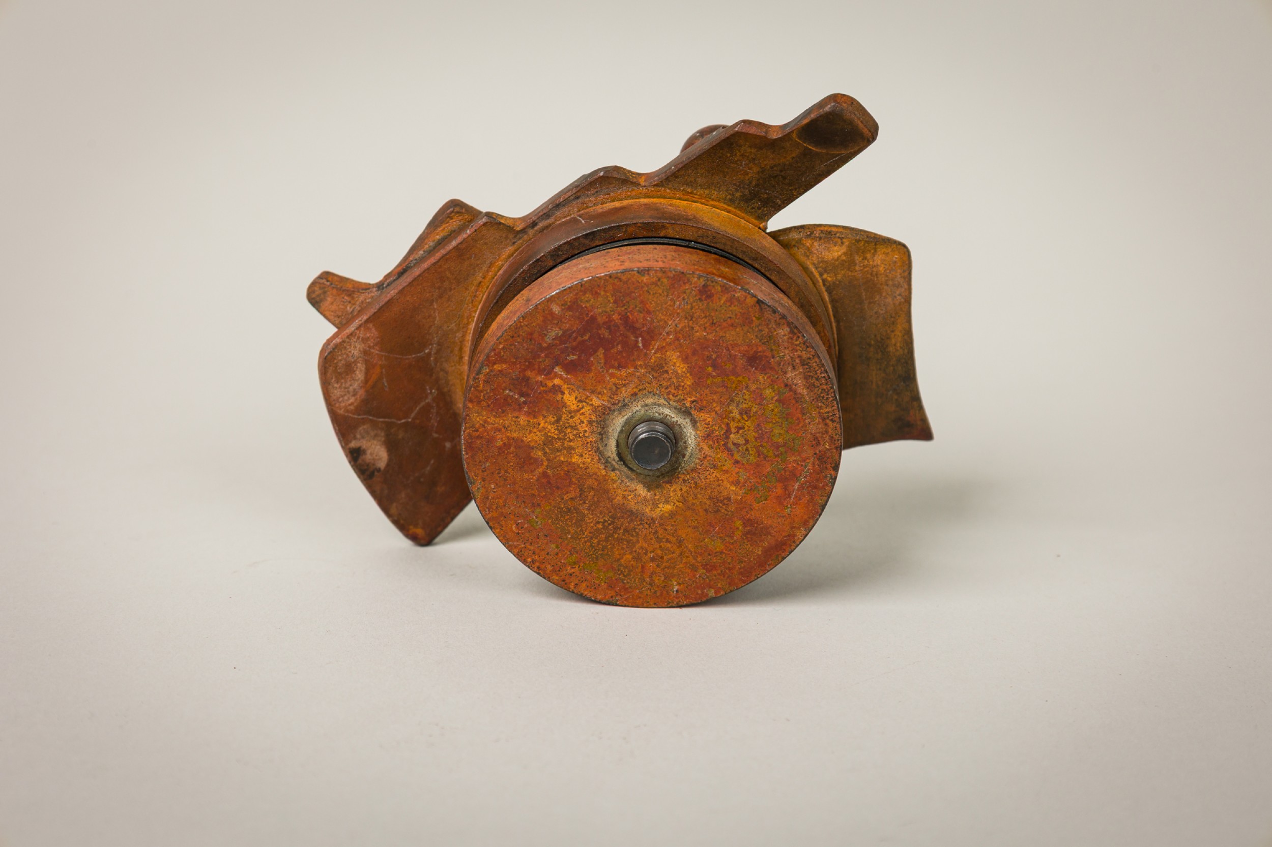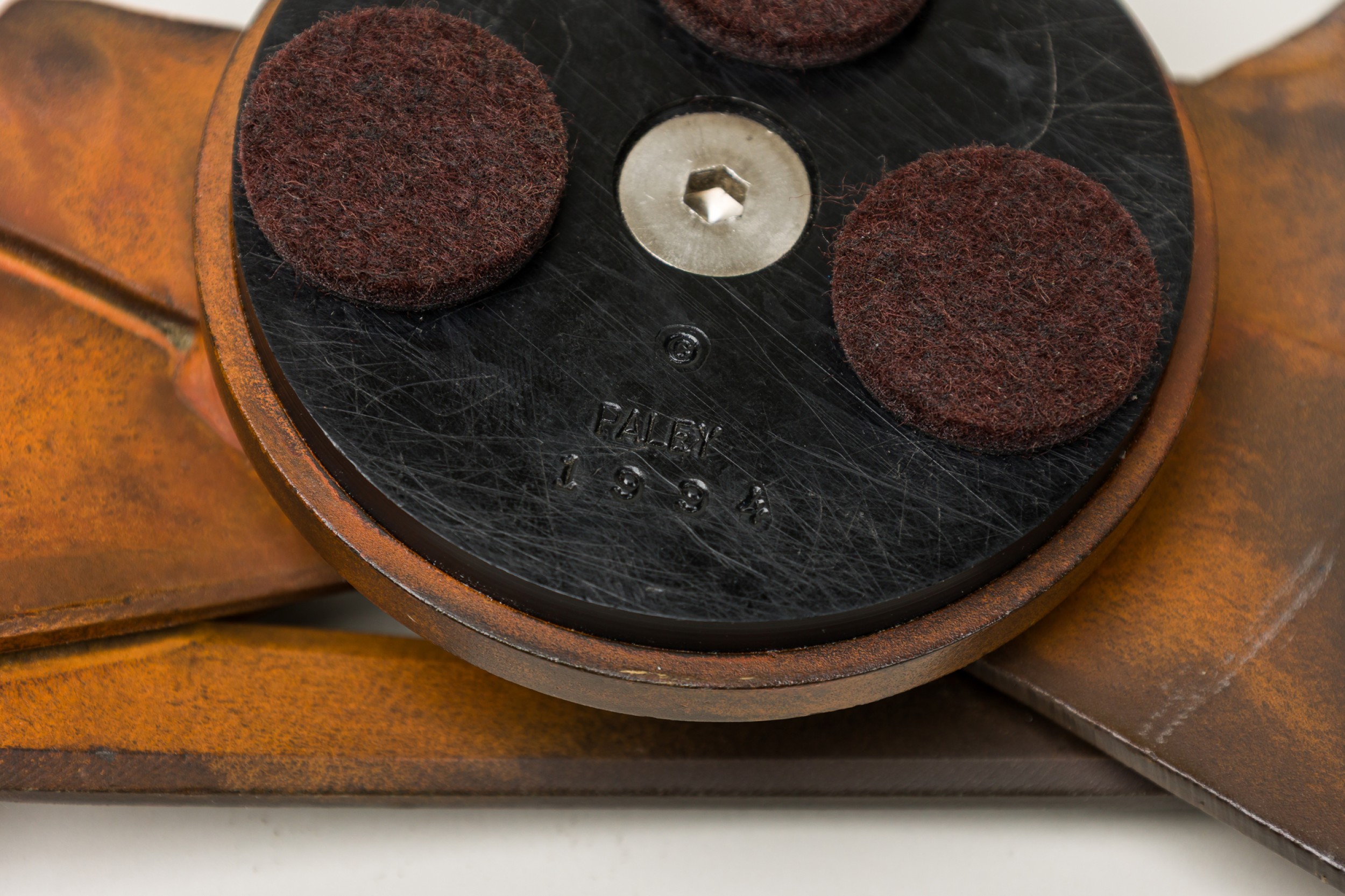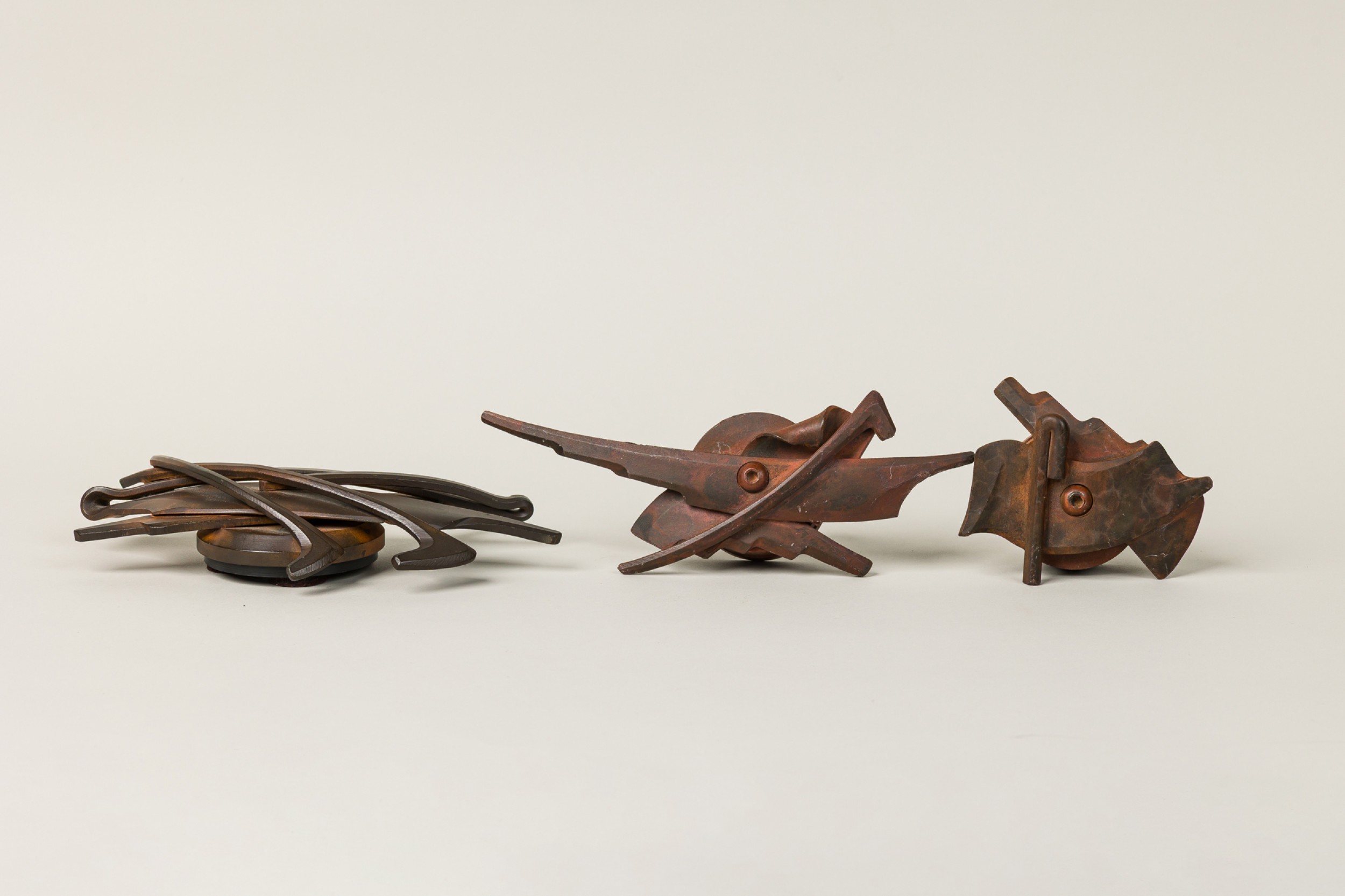 3 American Post-War forged and fabricated steel double sided knobs / paper weightS with controlled rust patina. marked (PALEY, 1994) (PRICED EACH).