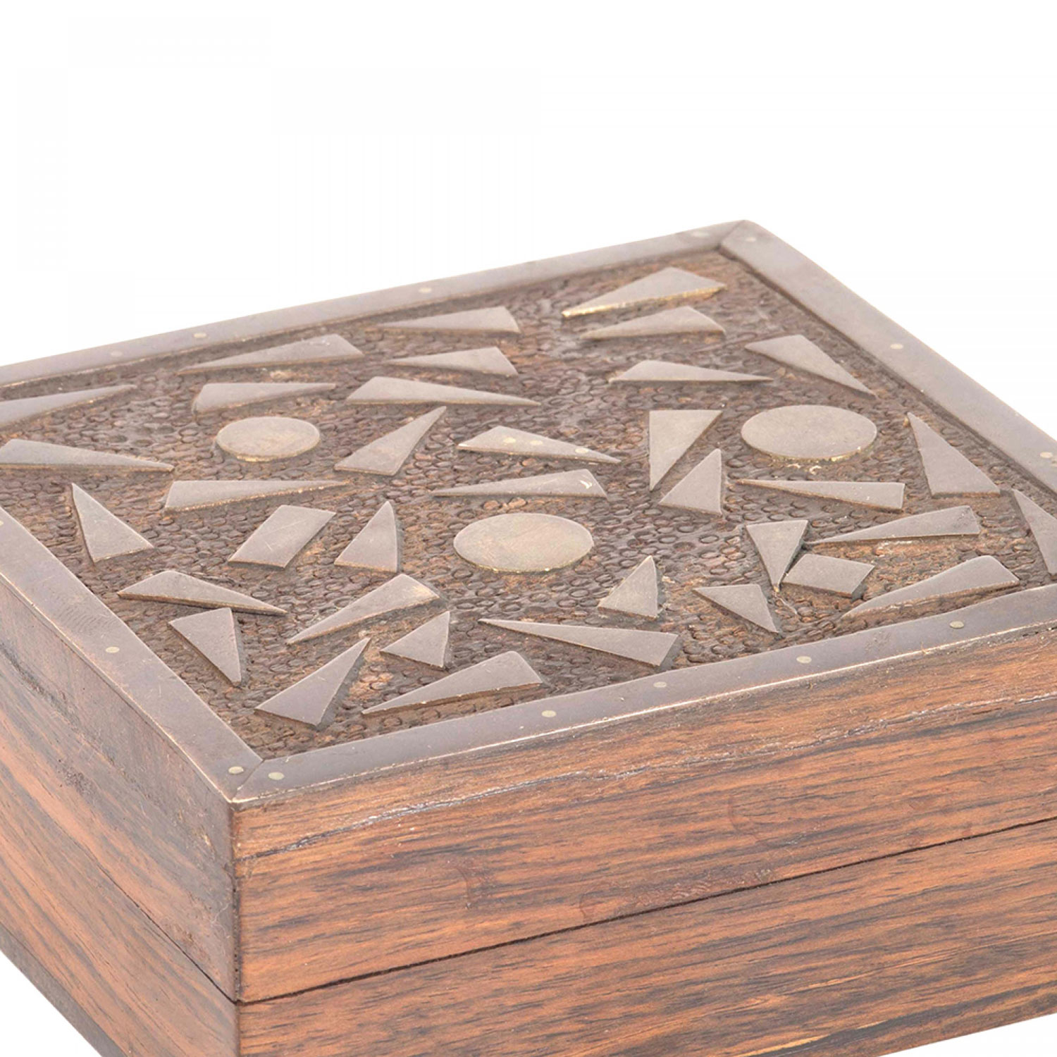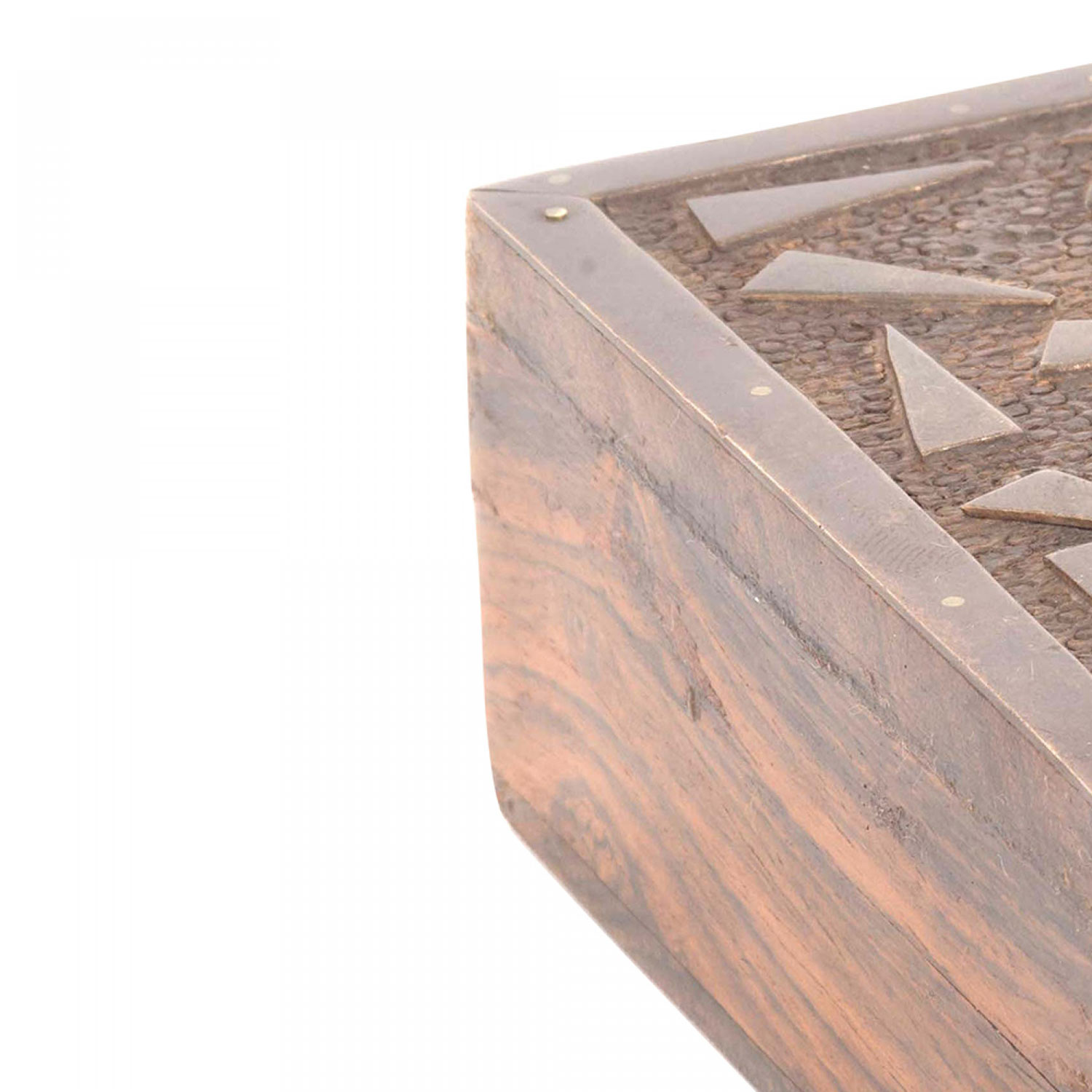 American Art Deco square rosewood box with brass trim and raised brass geometric circles and triangles on lid.