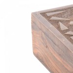 American Art Deco square rosewood box with brass trim and raised brass geometric circles and triangles on lid..