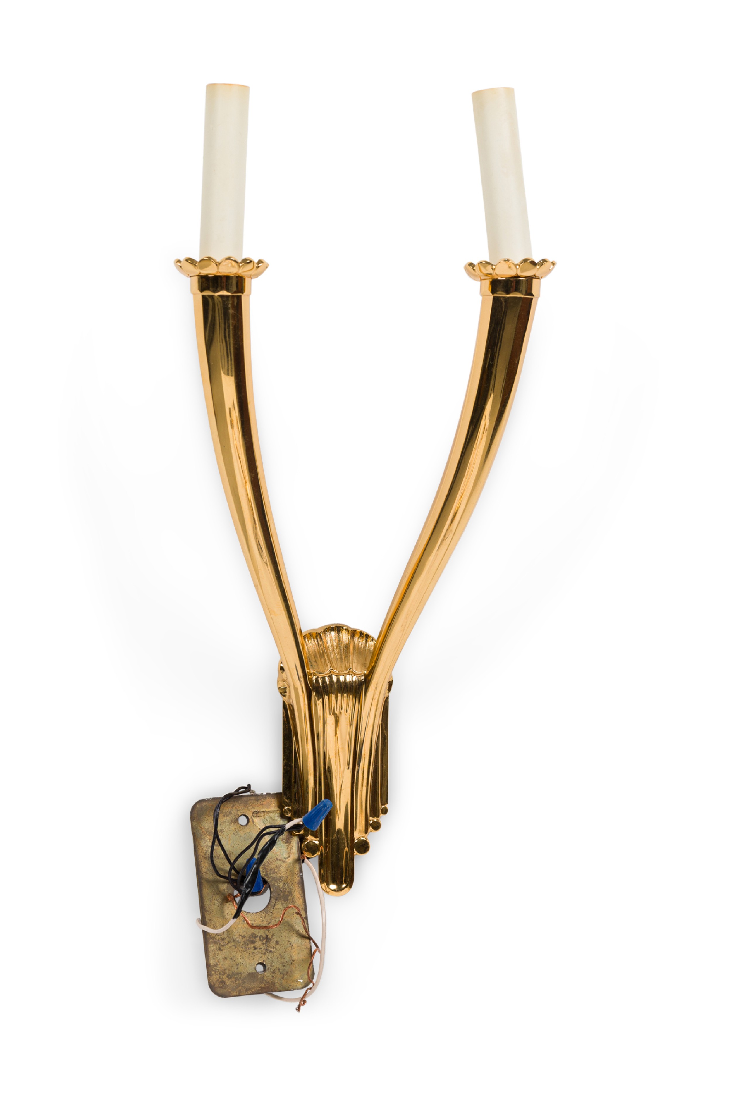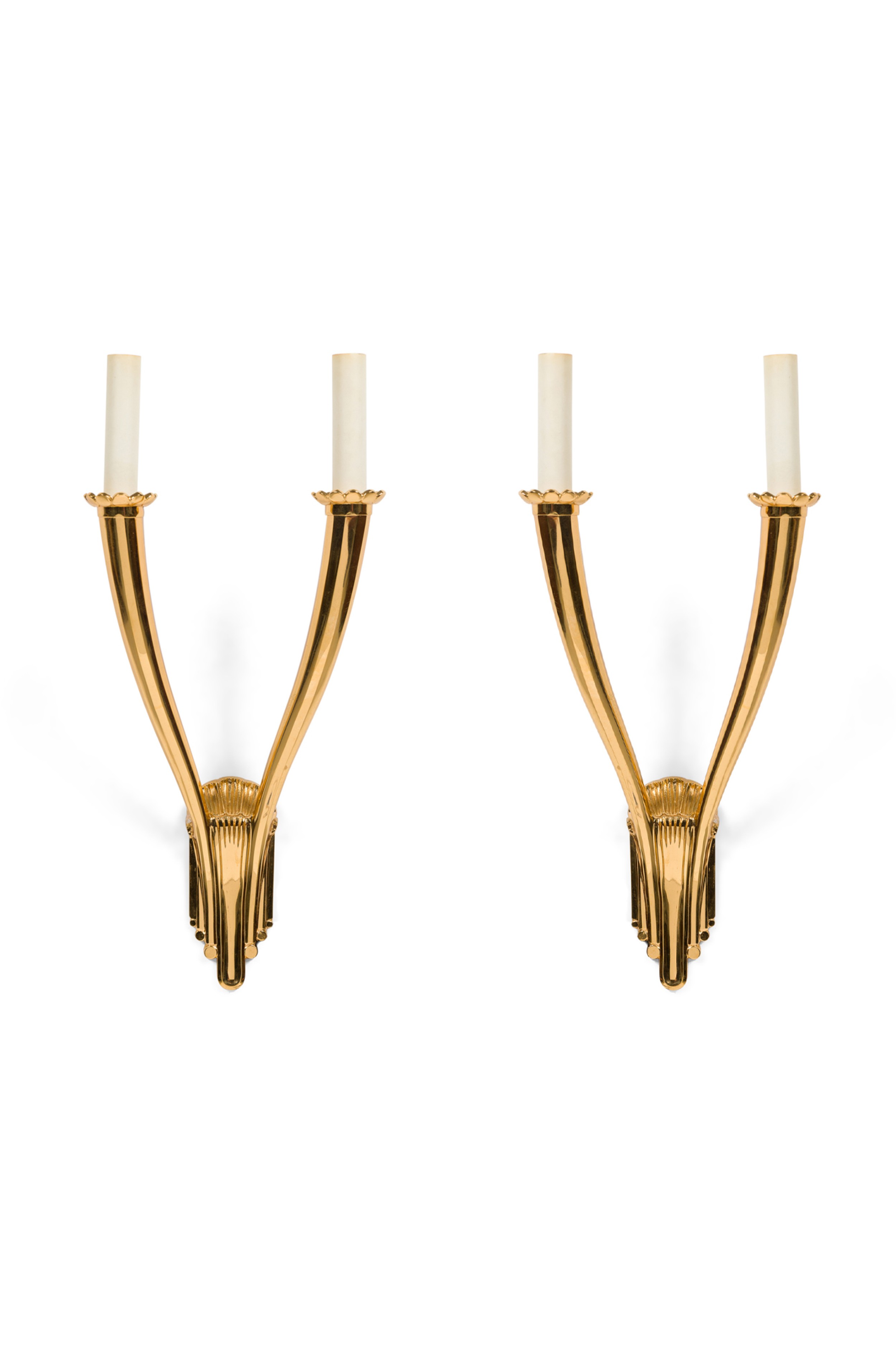PAIR of French Art-Deco style brass plated wishbone shaped 2-arm wall sconces (in the style of Leleu) (PRICED AS PAIR)