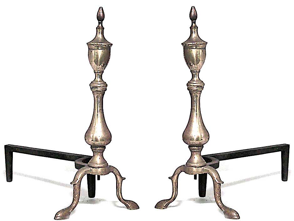 PAIR of American Country-style (19th Century) brass andirons with urn top. (PRICED AS PAIR).