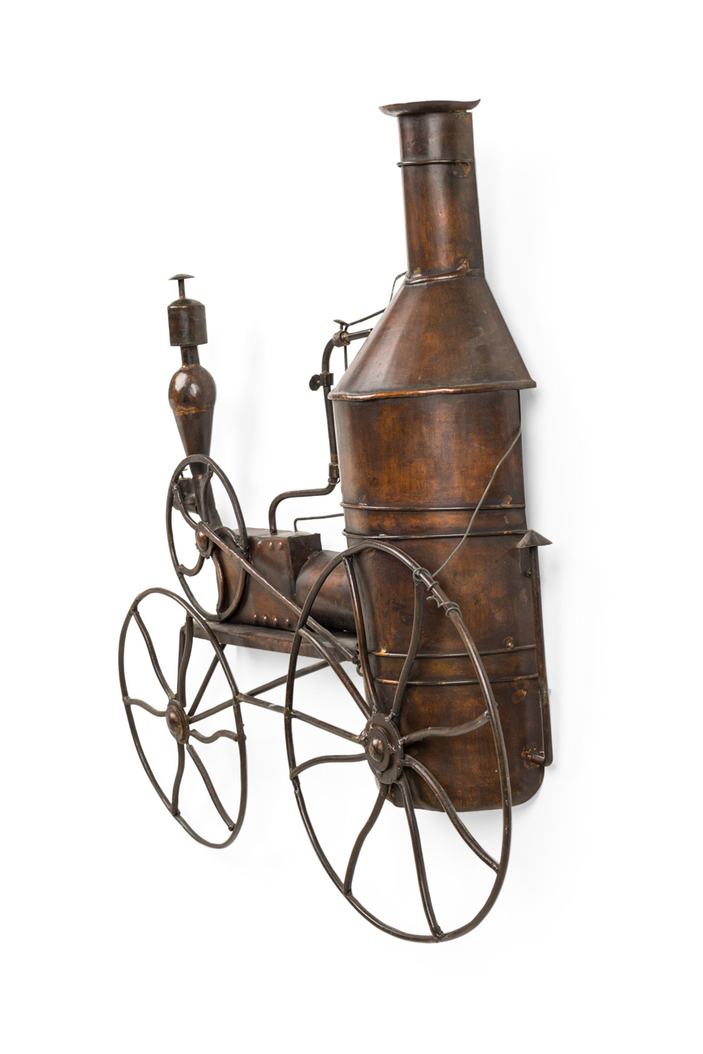 American Country style (20th Century) copper steam engine wall plaque with 3 wheels..