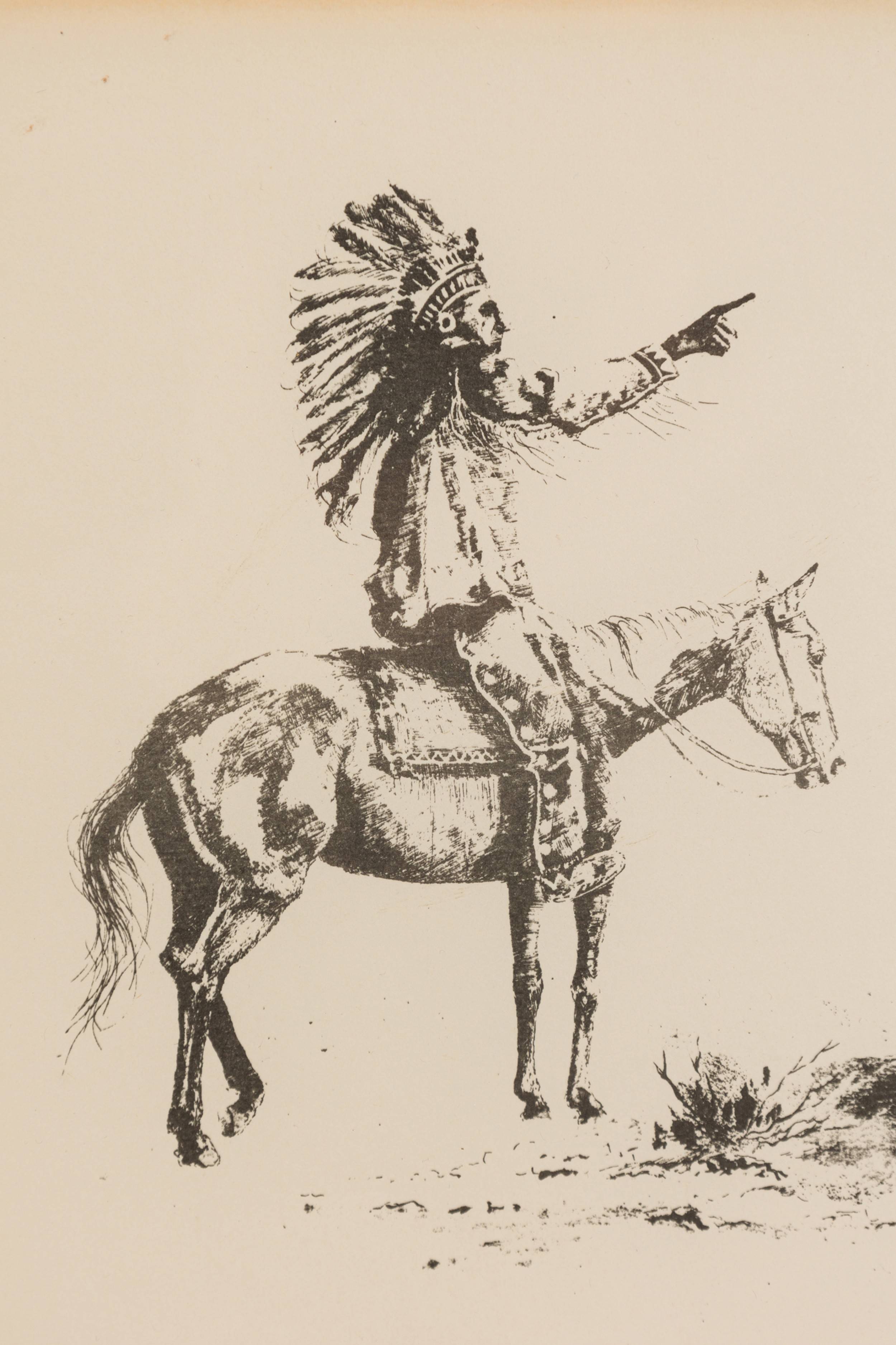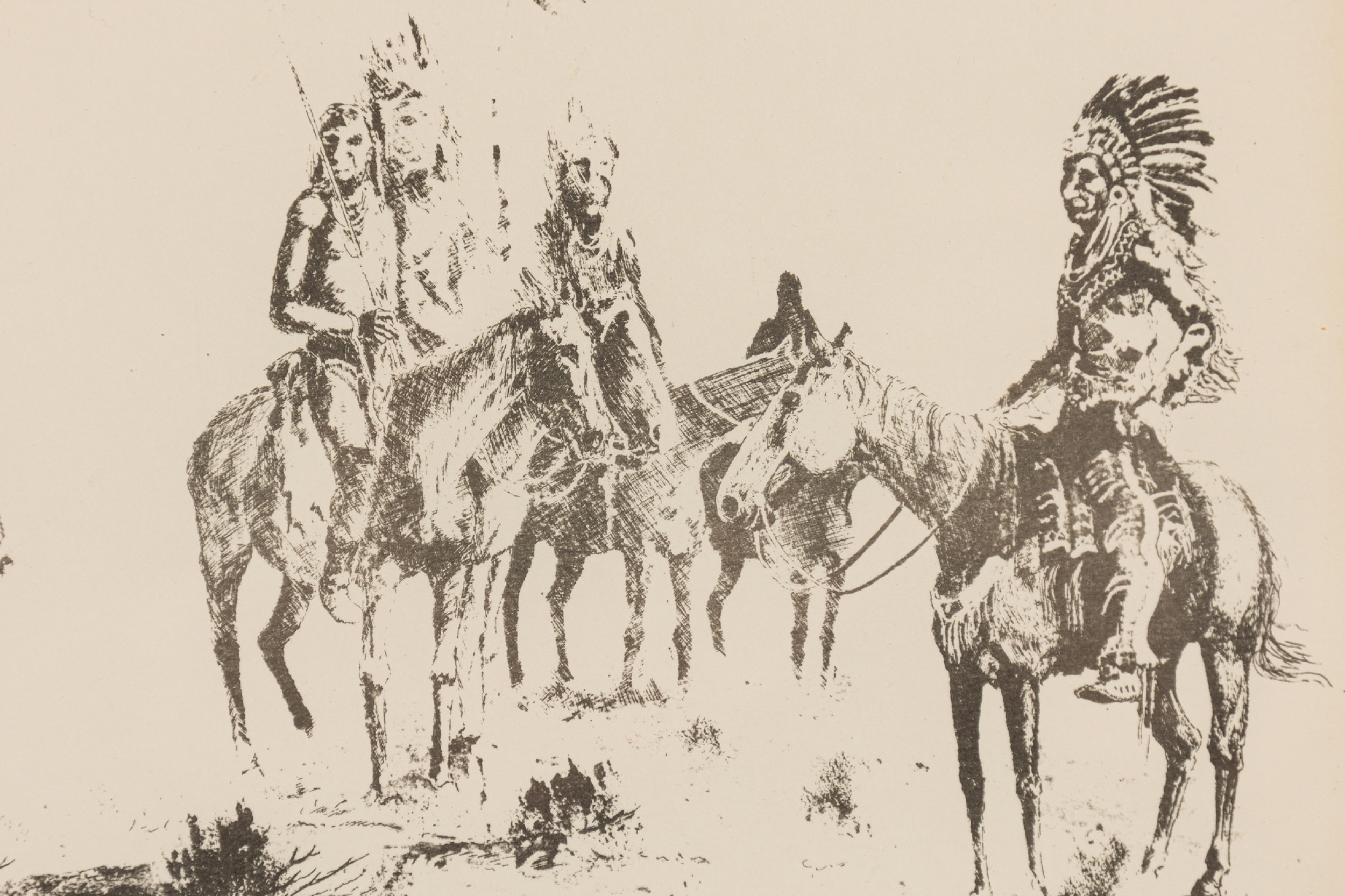 American Western style genre scene print of a group of Indians oh horses titlled: "War Council" in a mahogany frame and white mat (SIGNED: McCAIN) (similar items: NWL7281,, 7282A, 7284, 7285).