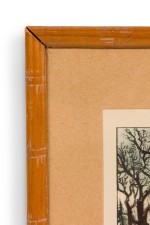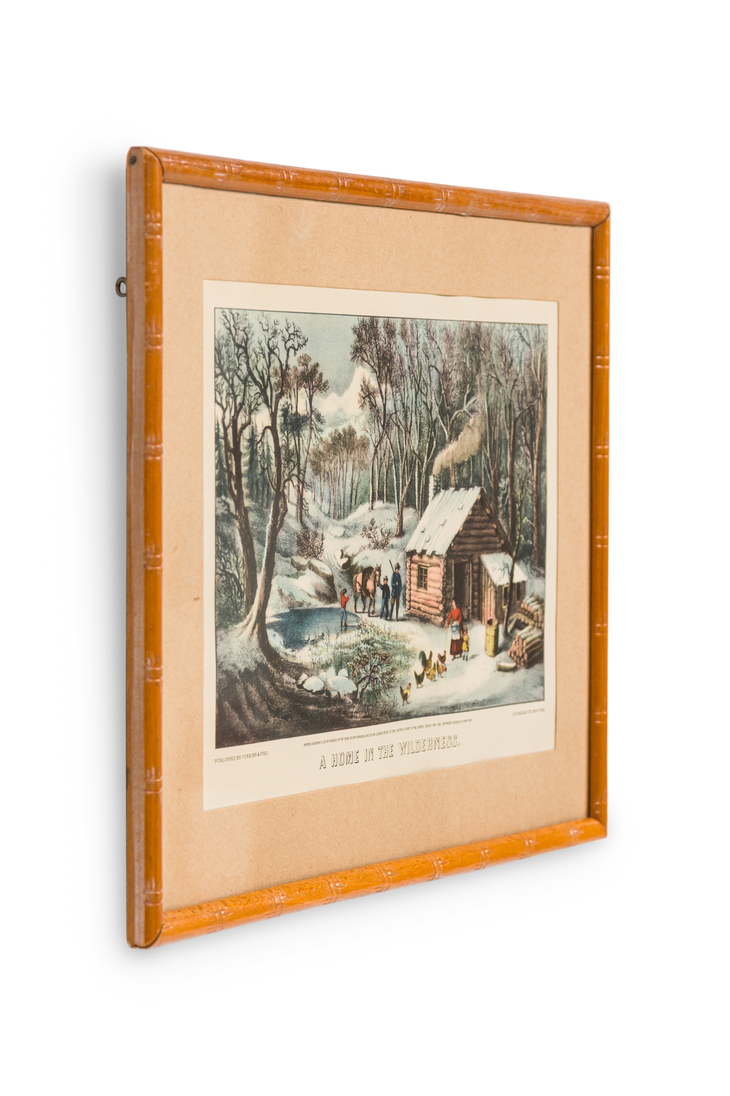 American Country (19th Century) Colored Lithograph Print of a Genre Winter Scene of People Near a Cabin In The Woods, Titled: "A Home in The Wilderness" in a pine fauc bamboo frame (CURRIER AND IVES).