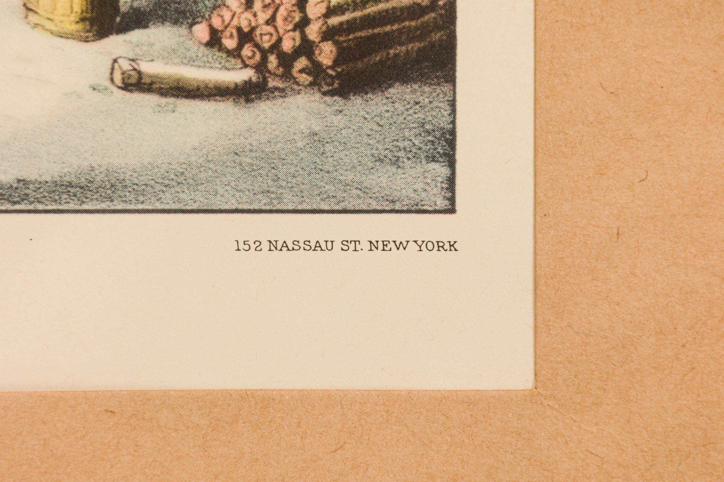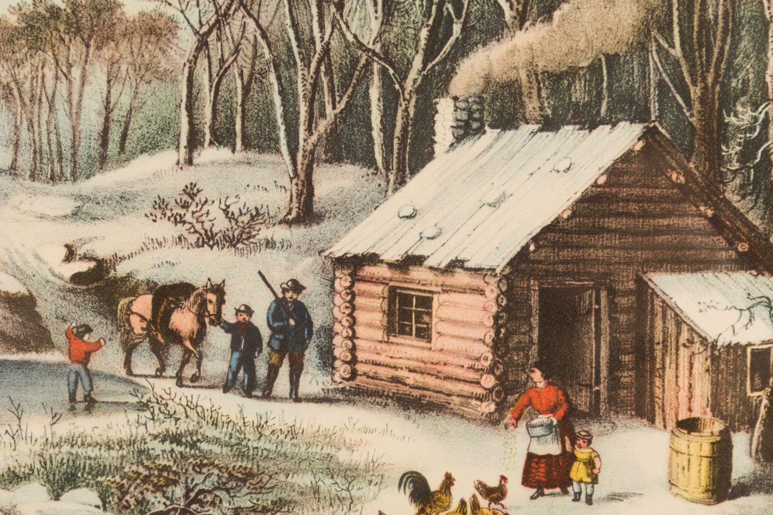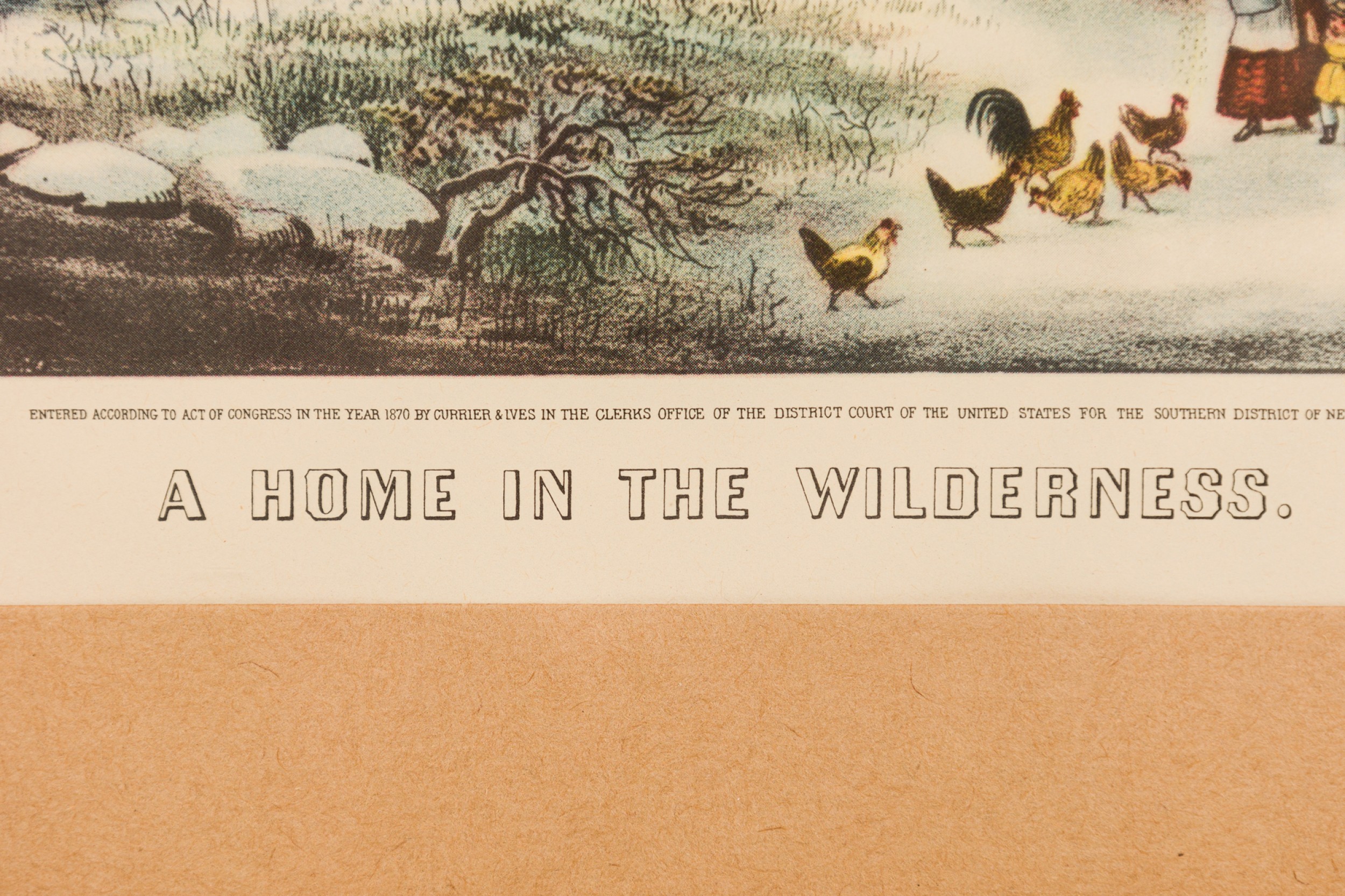 American Country (19th Century) Colored Lithograph Print of a Genre Winter Scene of People Near a Cabin In The Woods, Titled: "A Home in The Wilderness" in a pine fauc bamboo frame (CURRIER AND IVES)