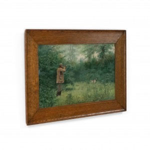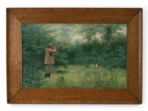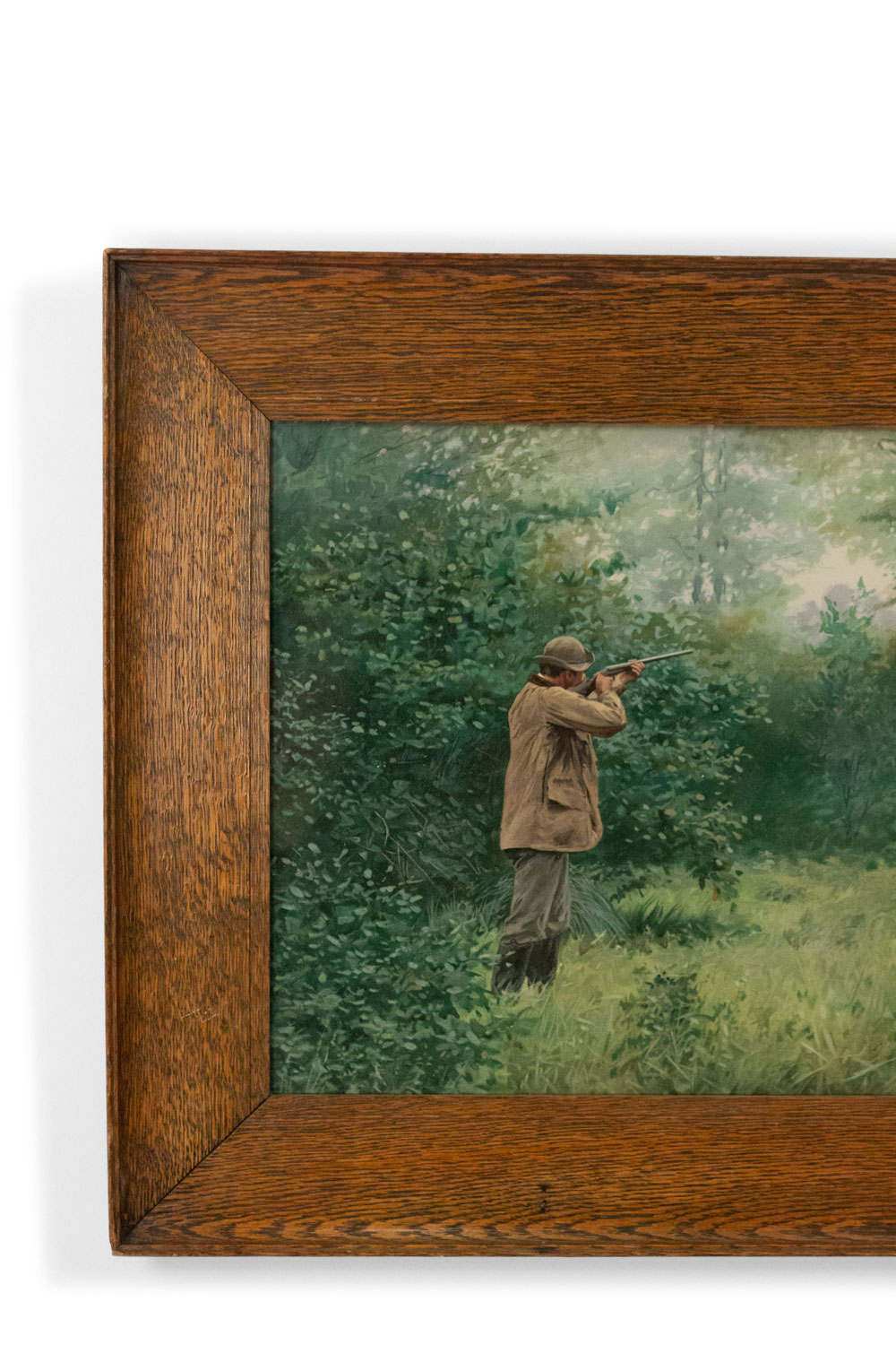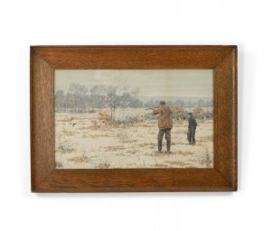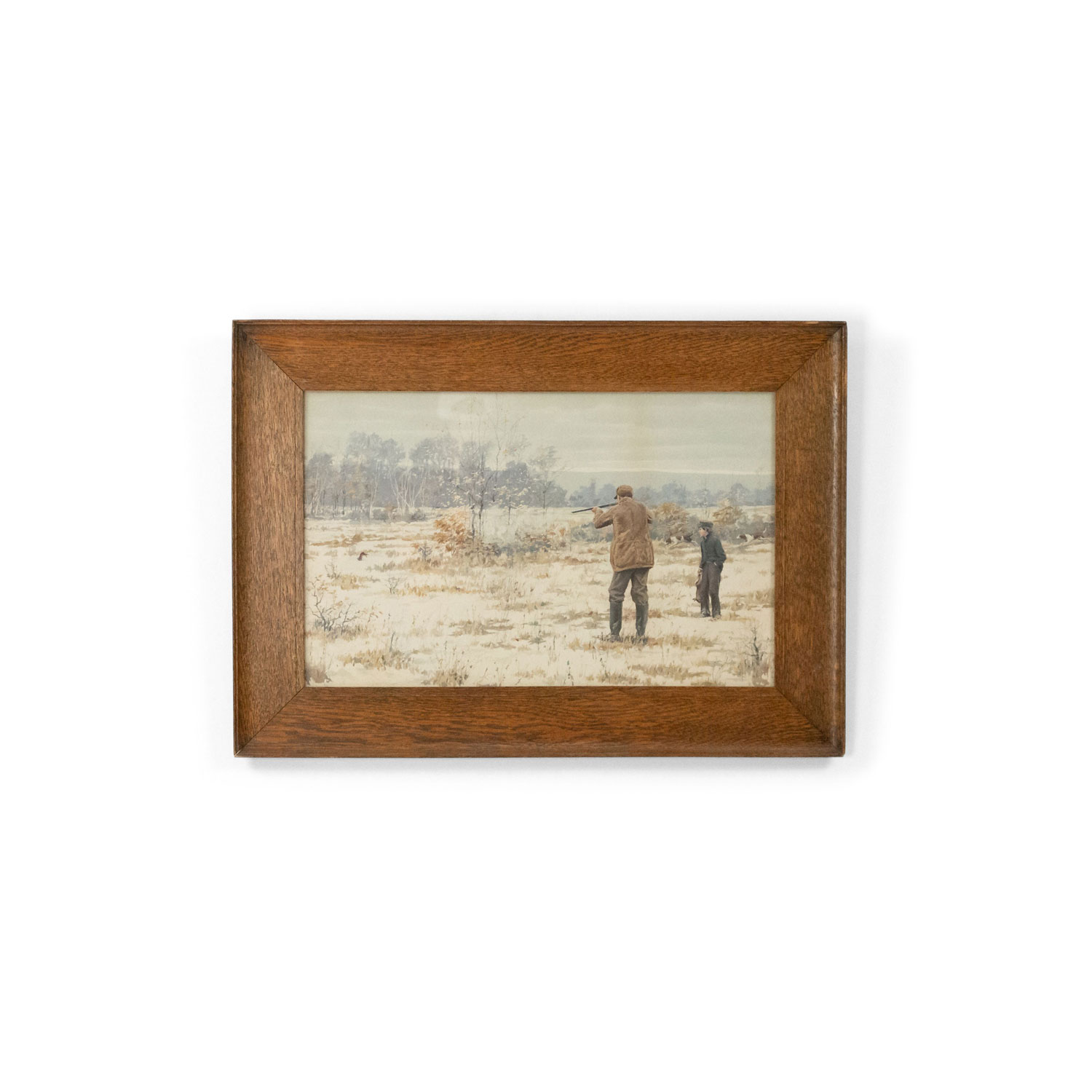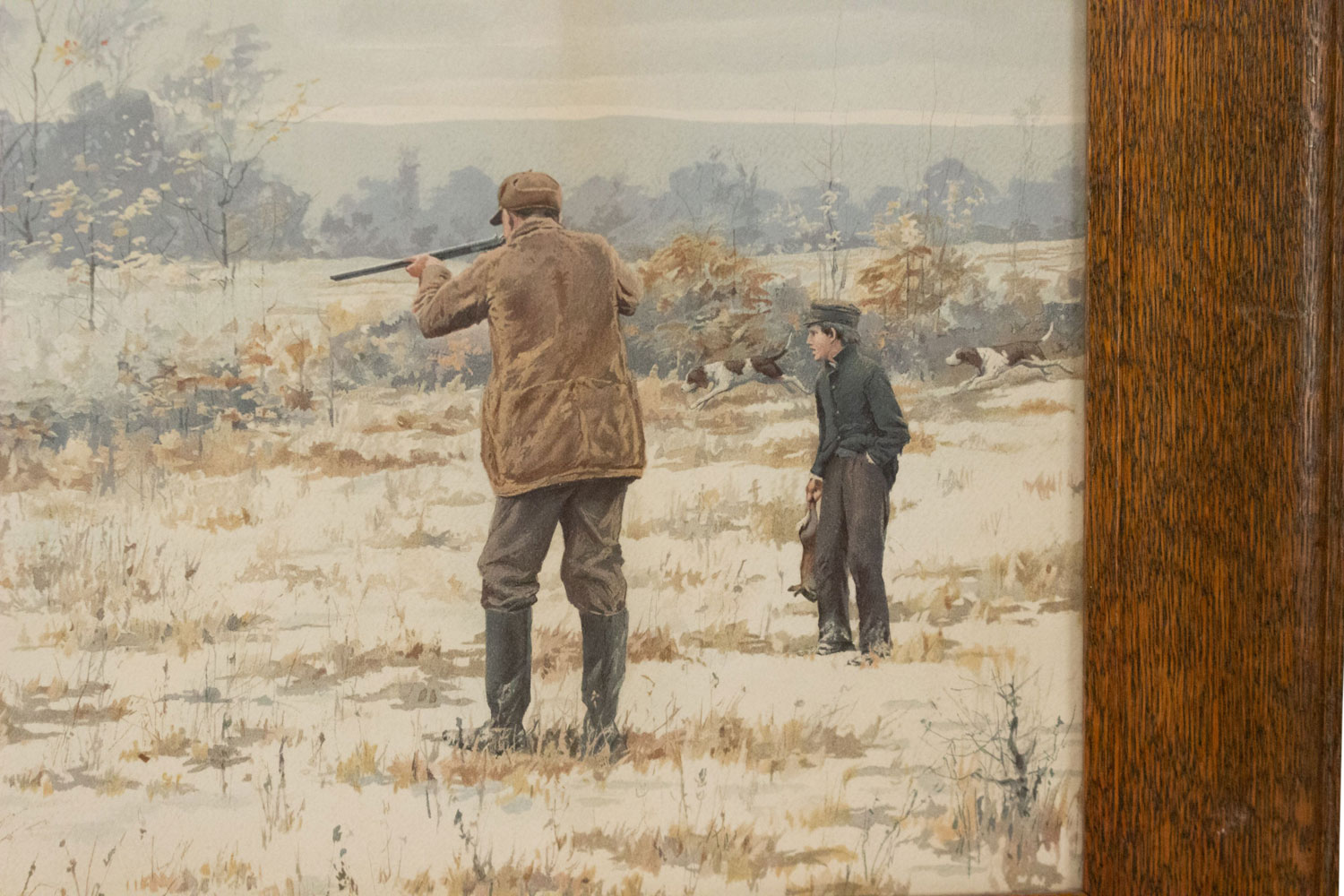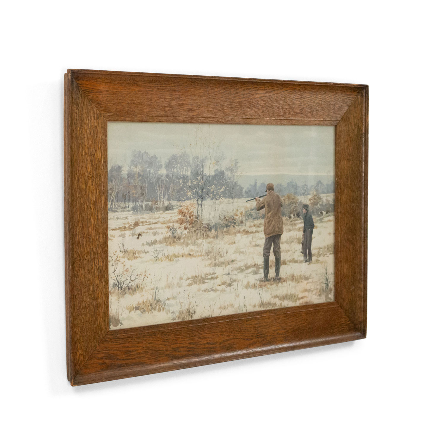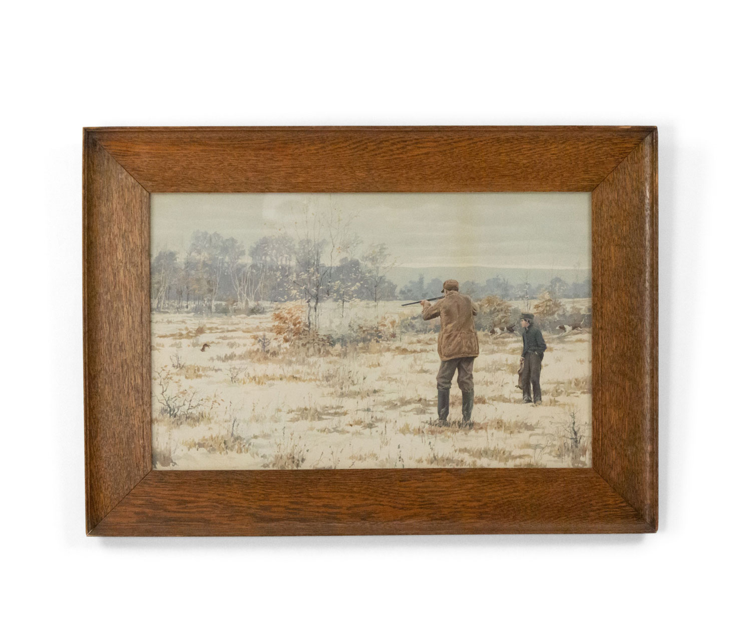 PAIR of oak framed American Country style watercolor lithographs with scenes of hunters shooting game (signed A B FROST) (PRICED AS PAIR)