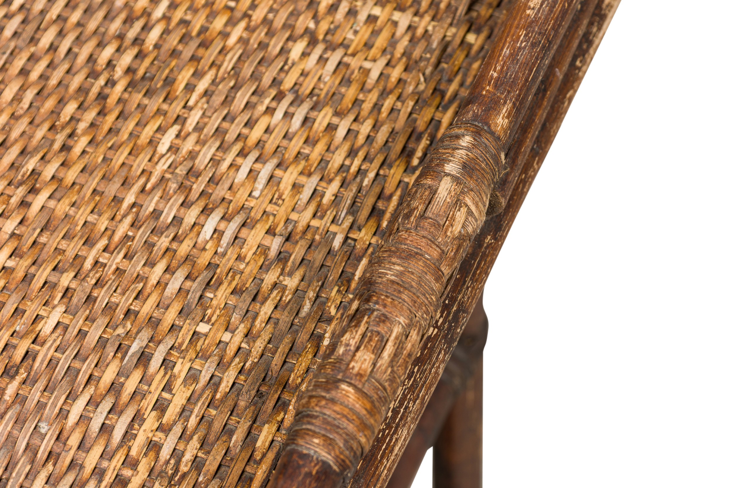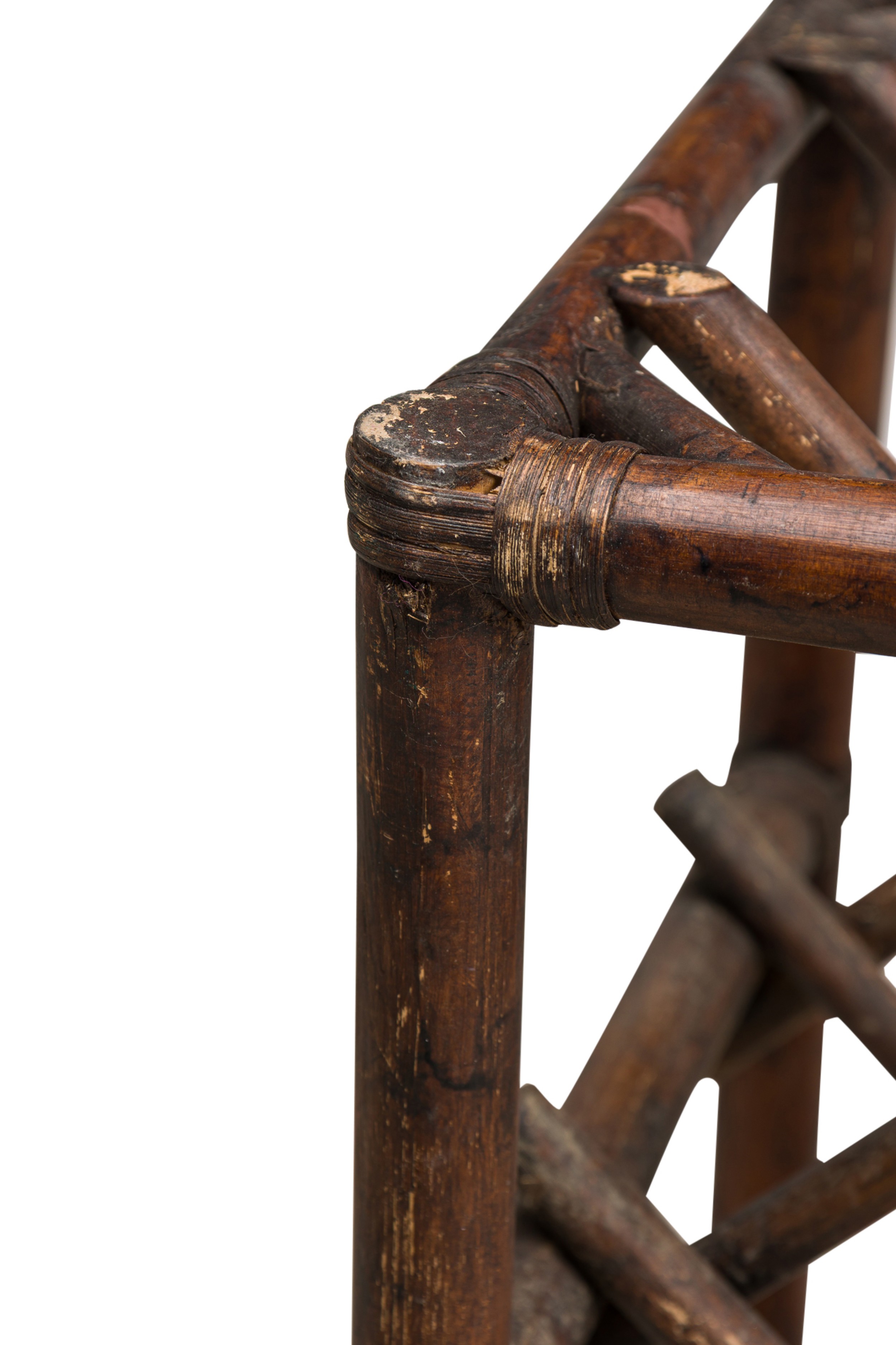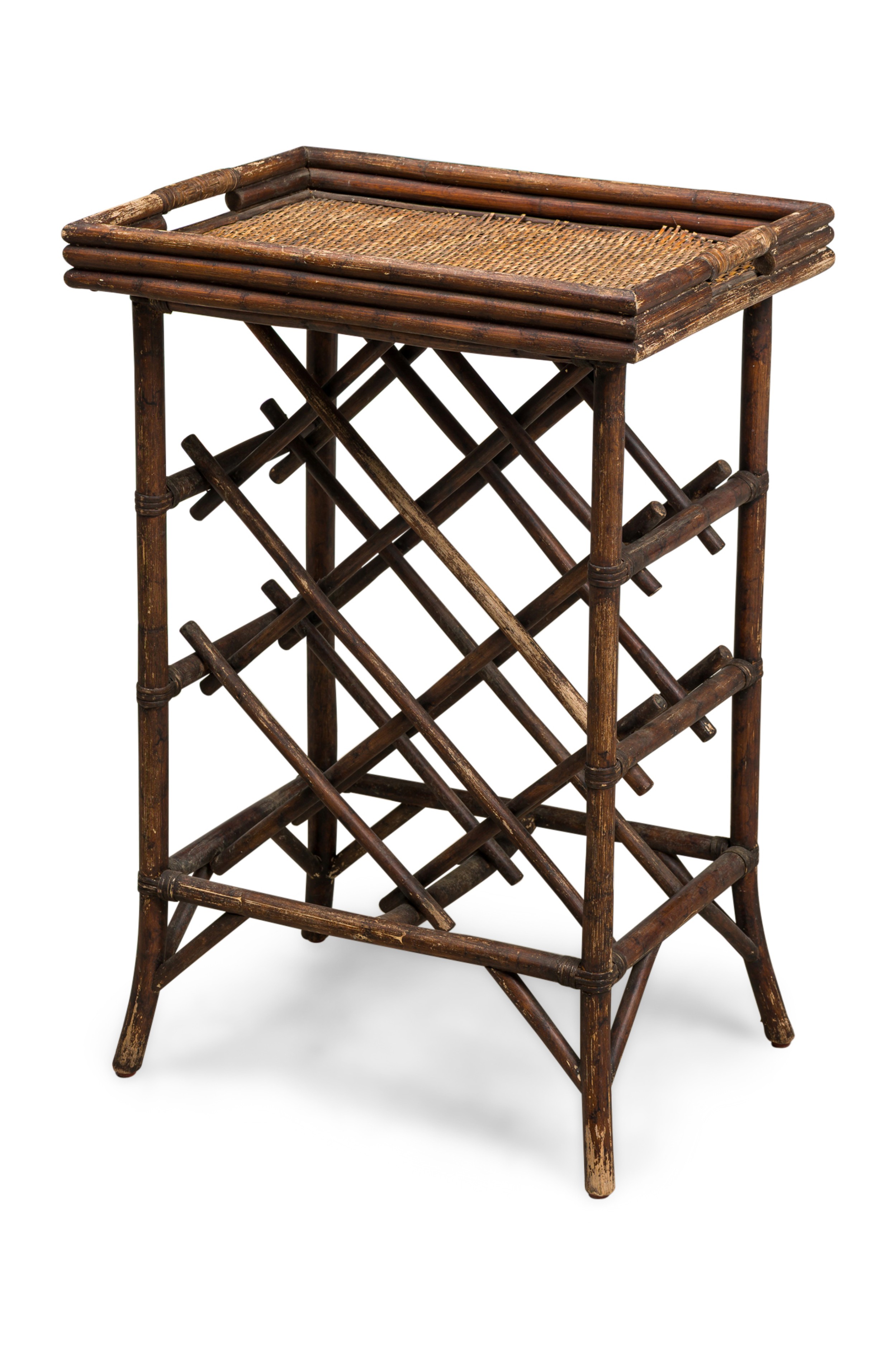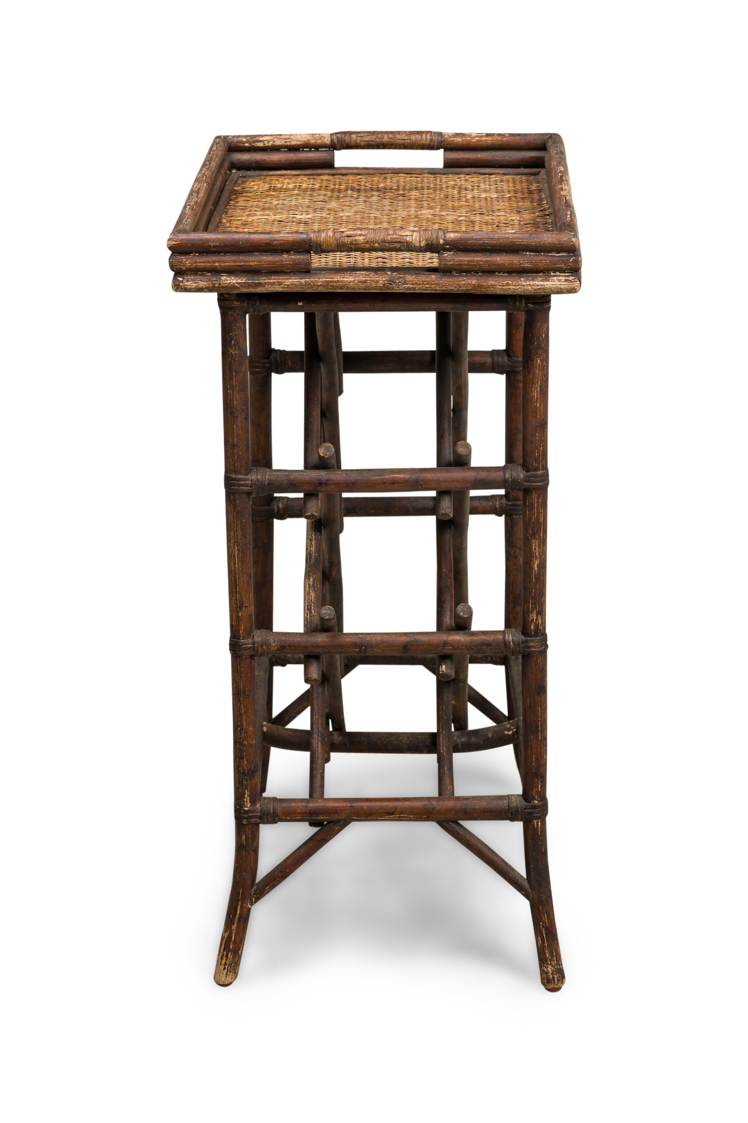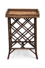Bamboo Mid-Century tall occasional table with a rattan woven tray table top supporting a lattice design base