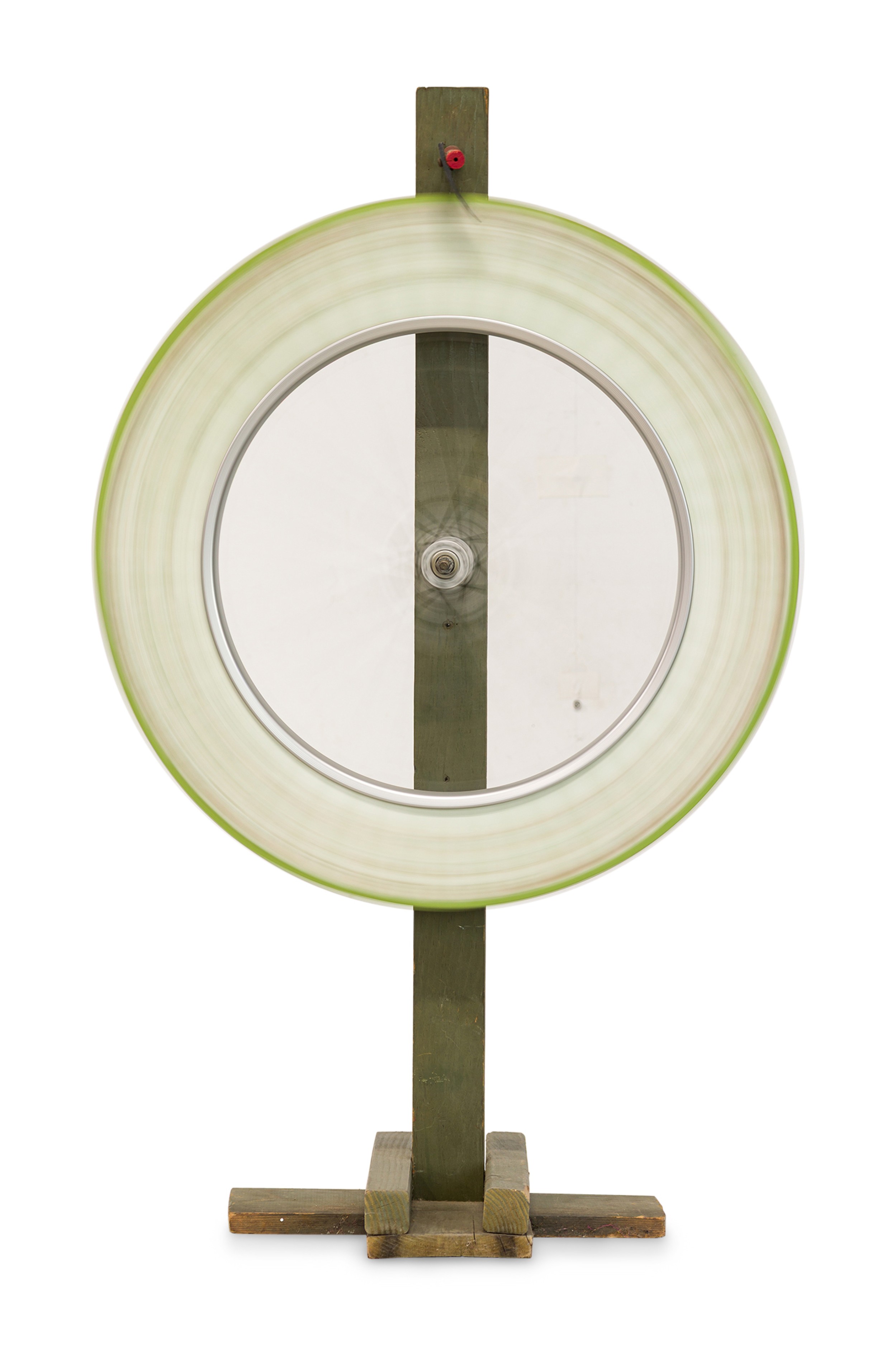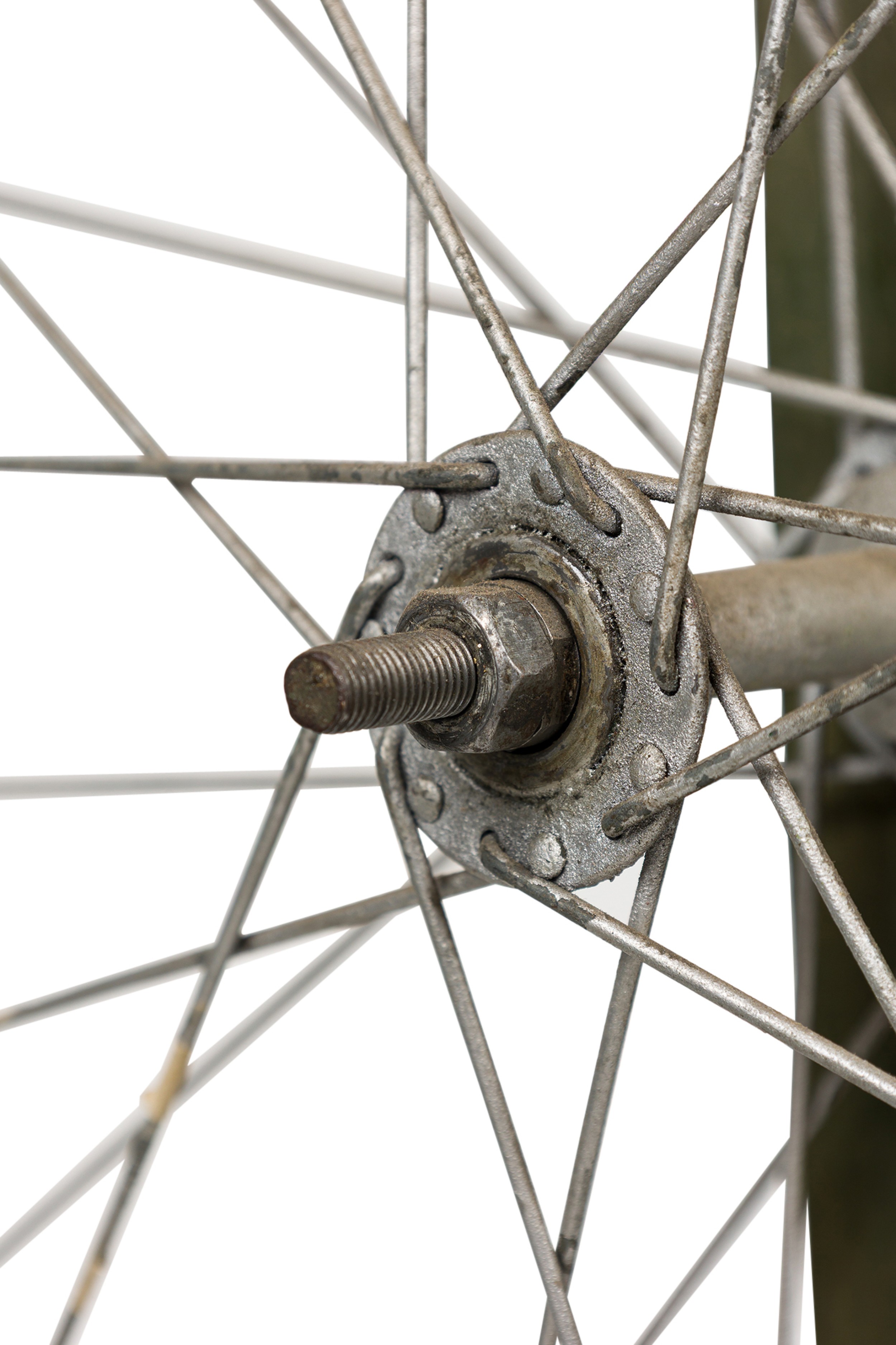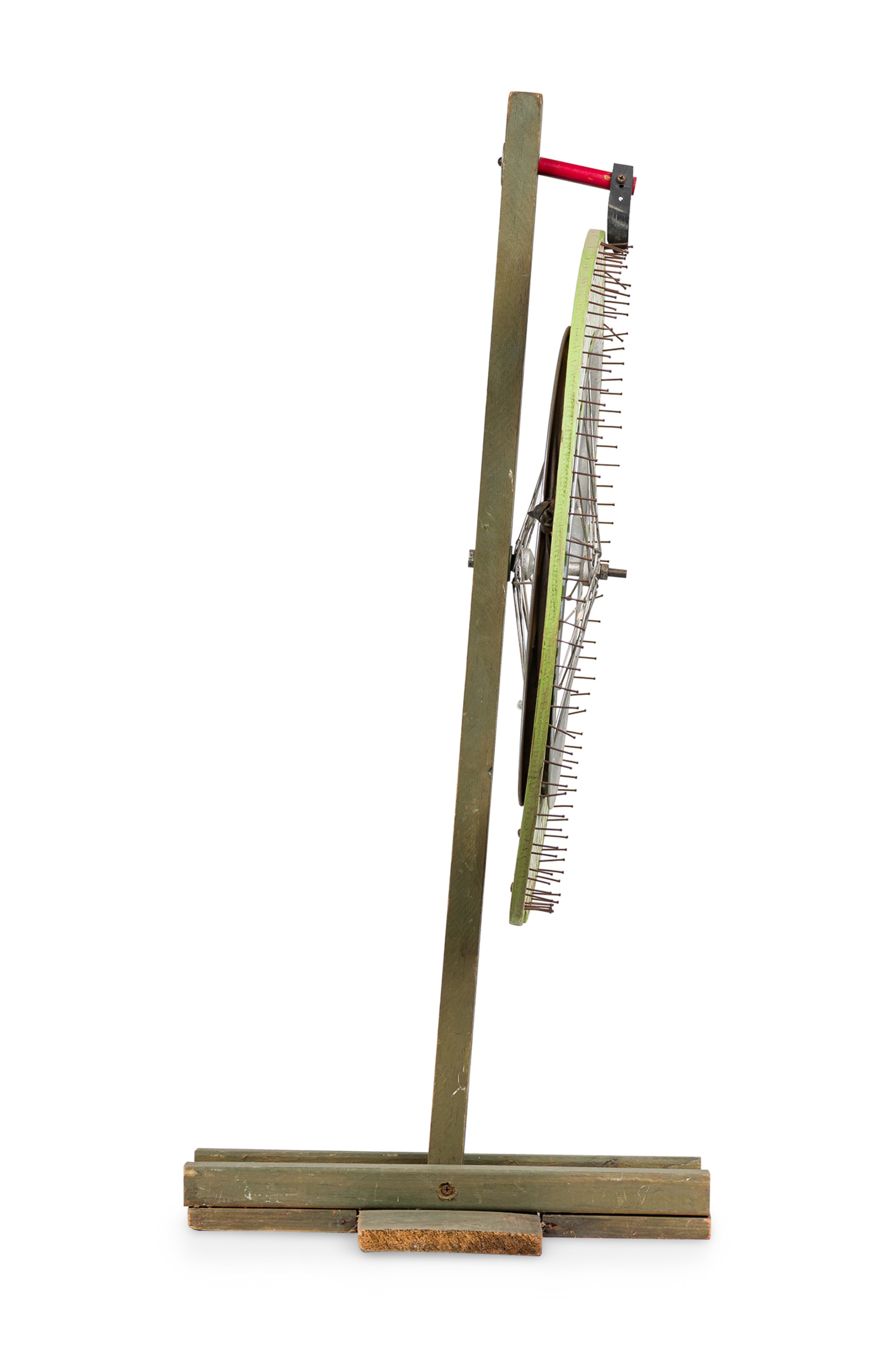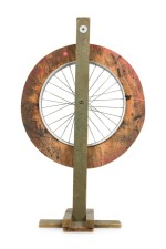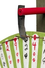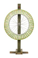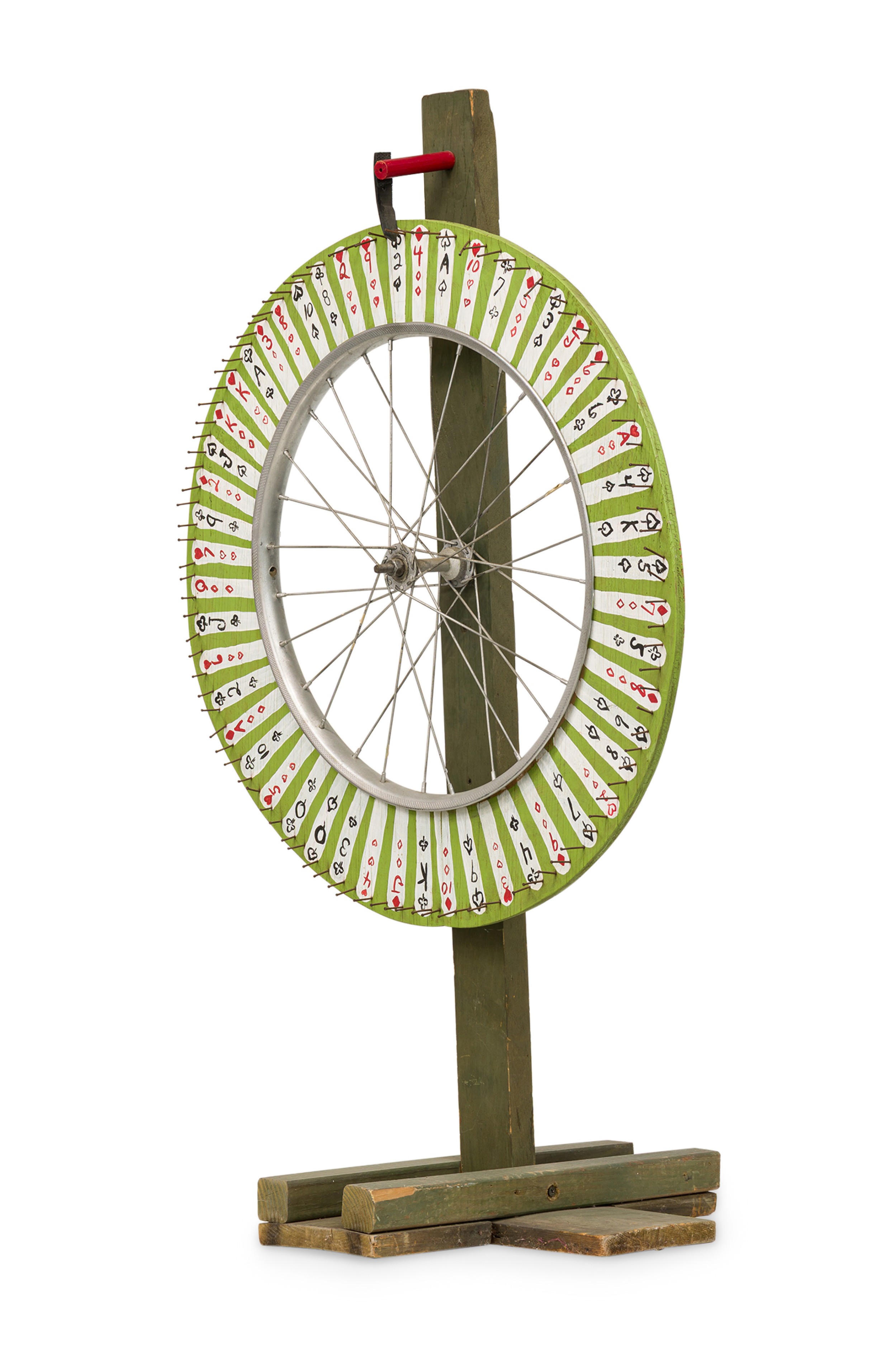 American Country style handmade carnival wheel with salvaged bycylce wheel bearing painted card faces on the spinning wheel standing on a wooden cross base..