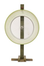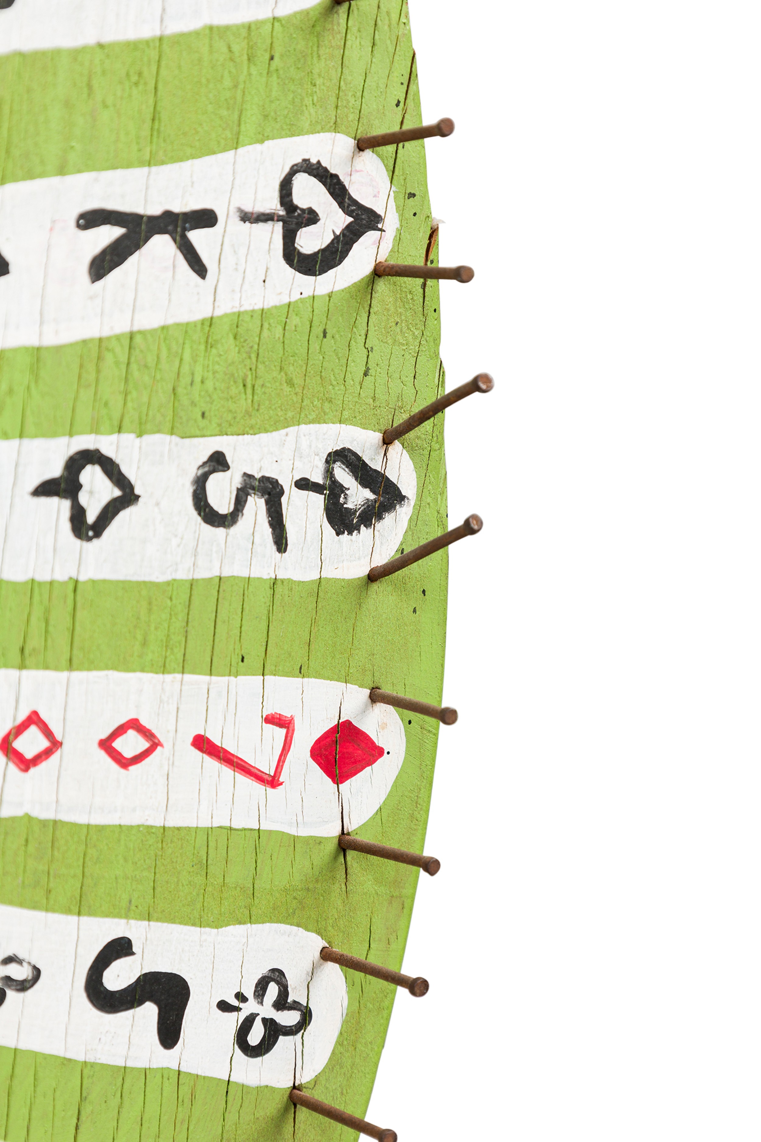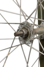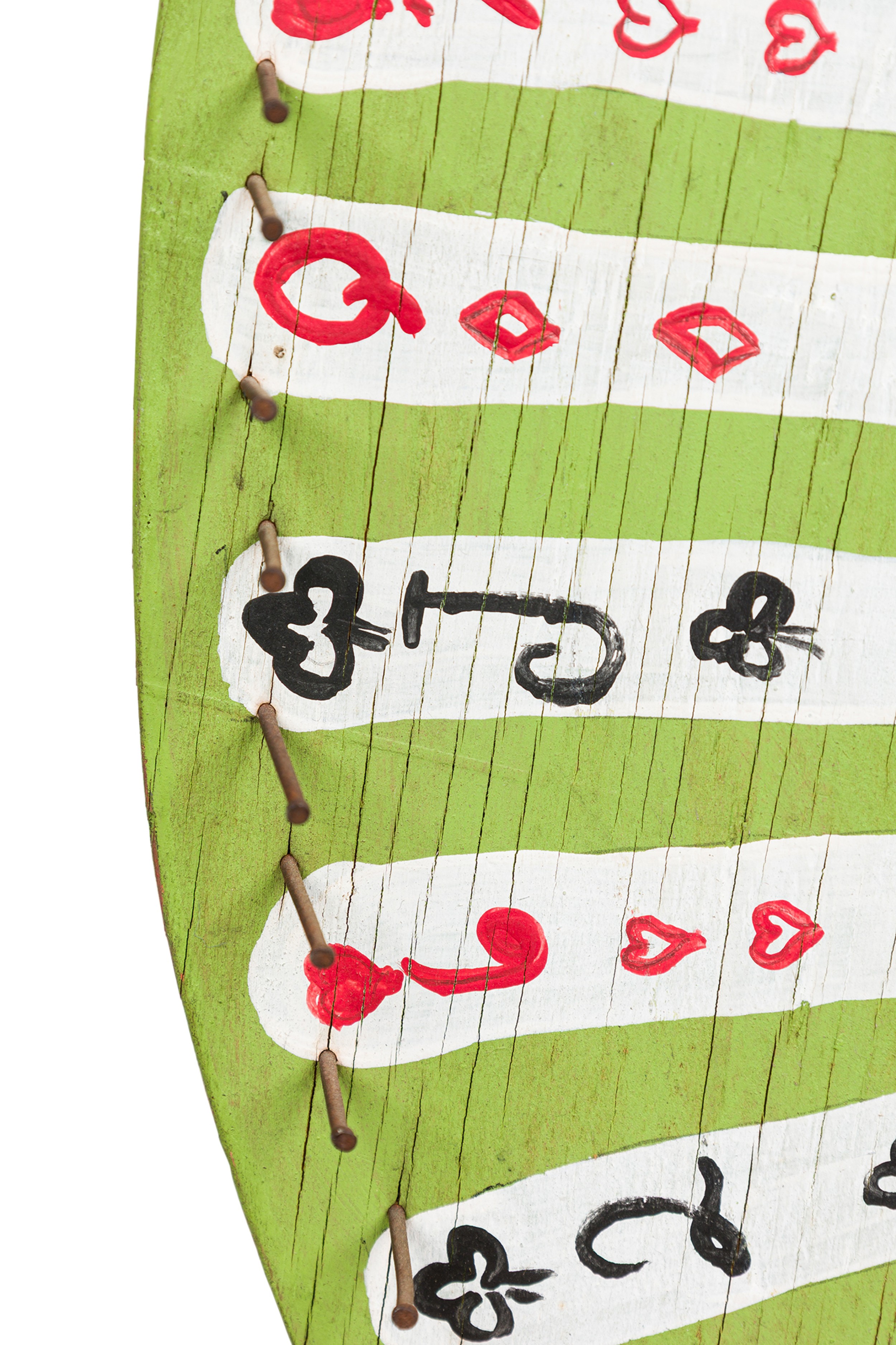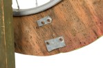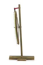 American Country style handmade carnival wheel with salvaged bycylce wheel bearing painted card faces on the spinning wheel standing on a wooden cross base.