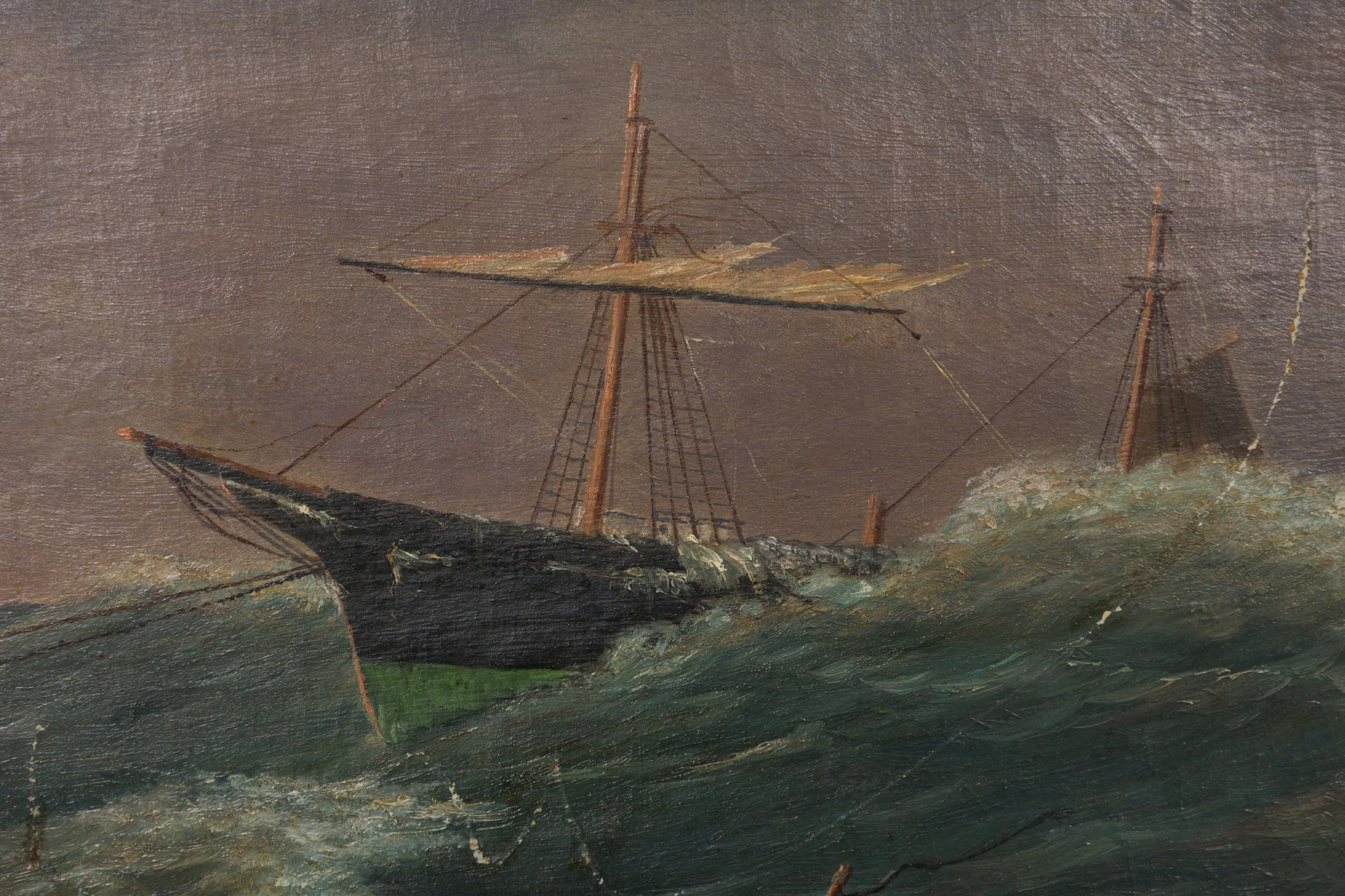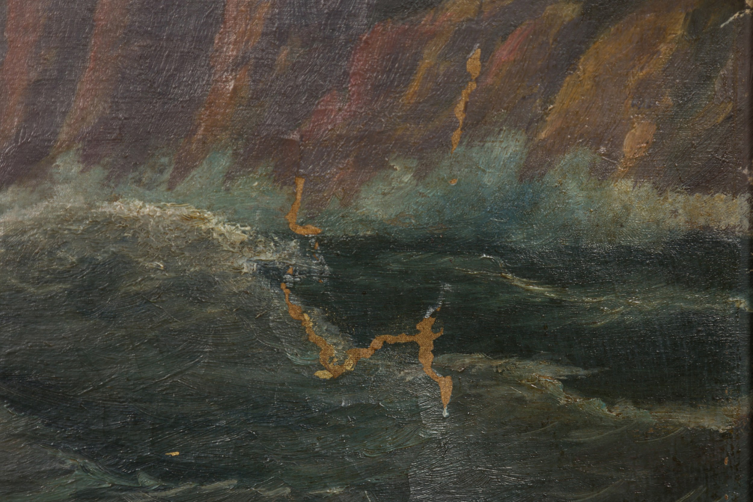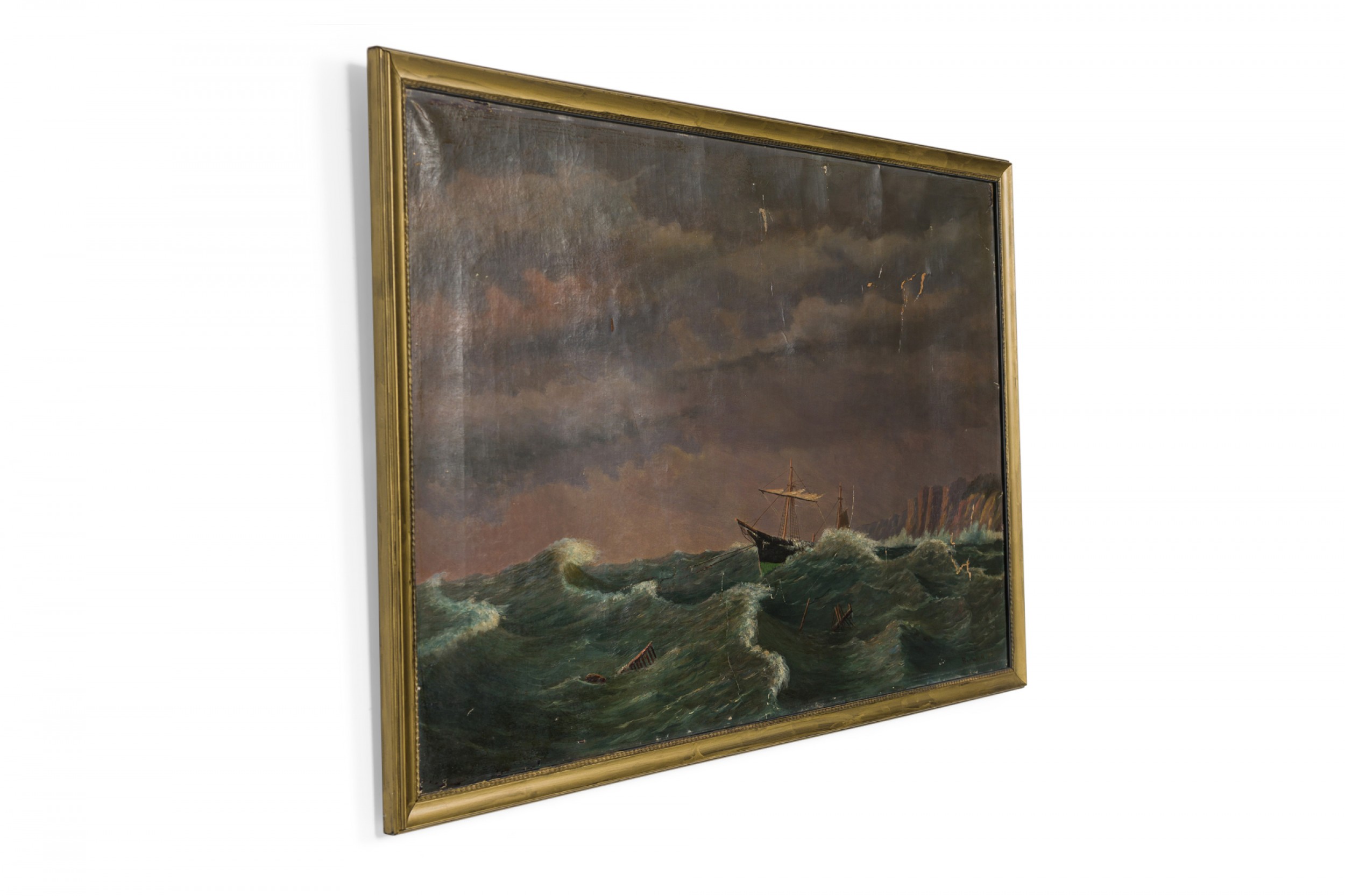 American (19th Century) seascape oil painting in a gold carved frame of a ship foundering in heavy seas with coastal cliffs in the background..
