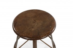 American 1940's industrial metal stool with a natural wood round top with an adjustable seat heat and a round foot rest.