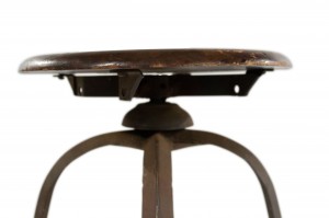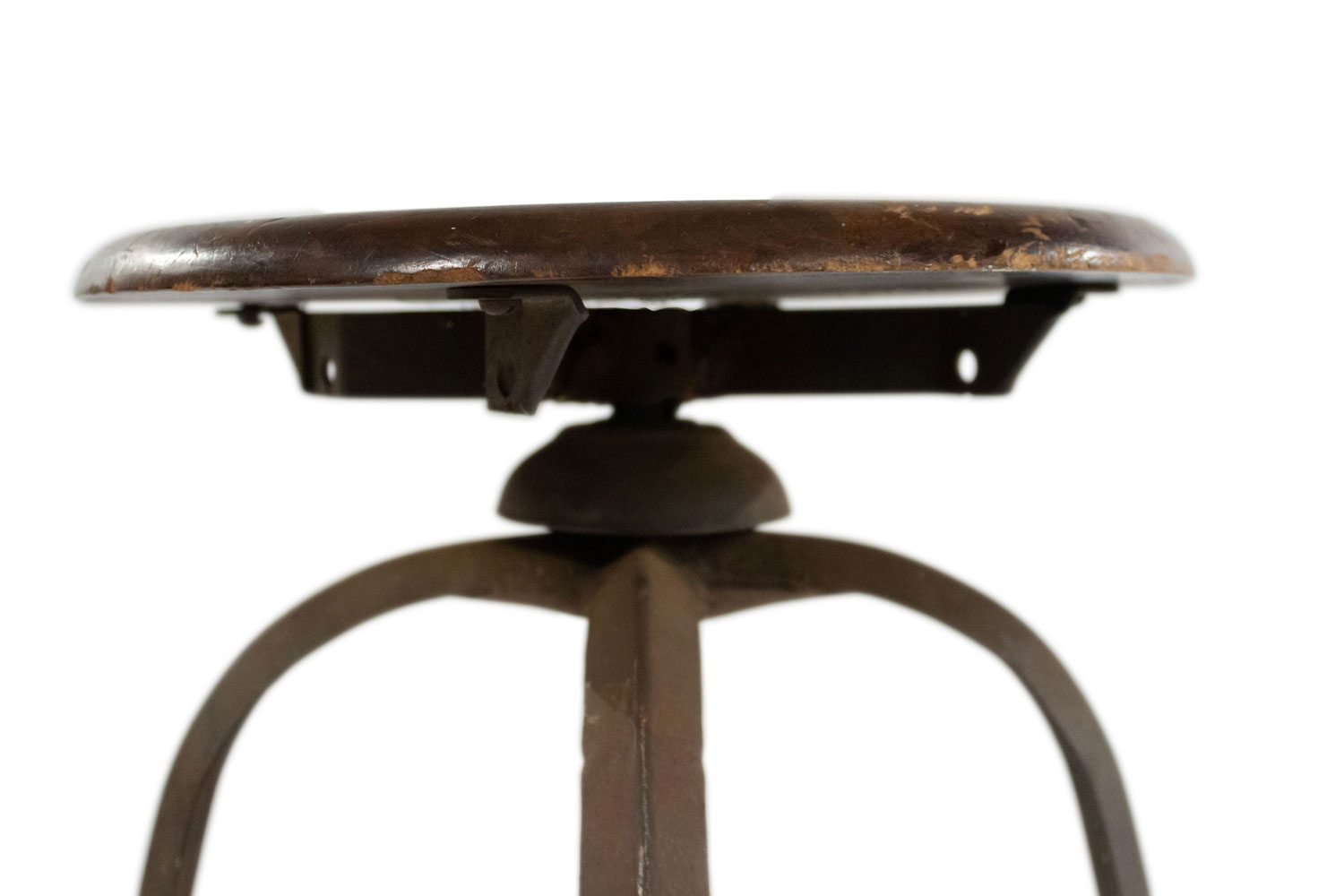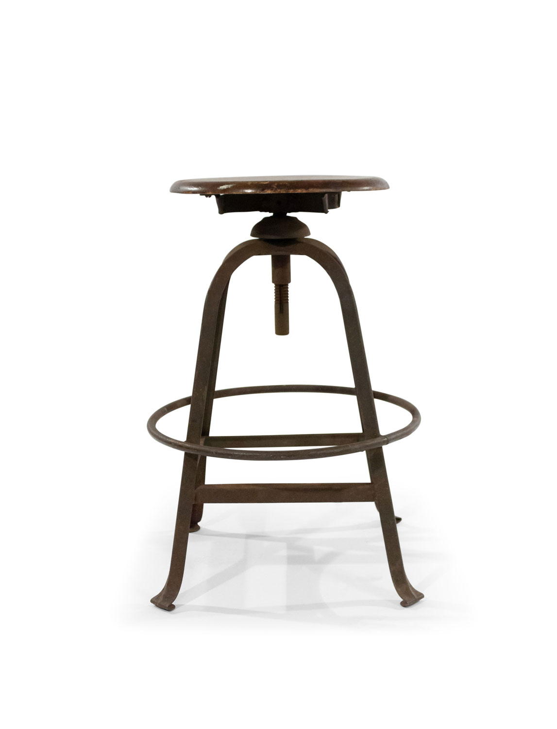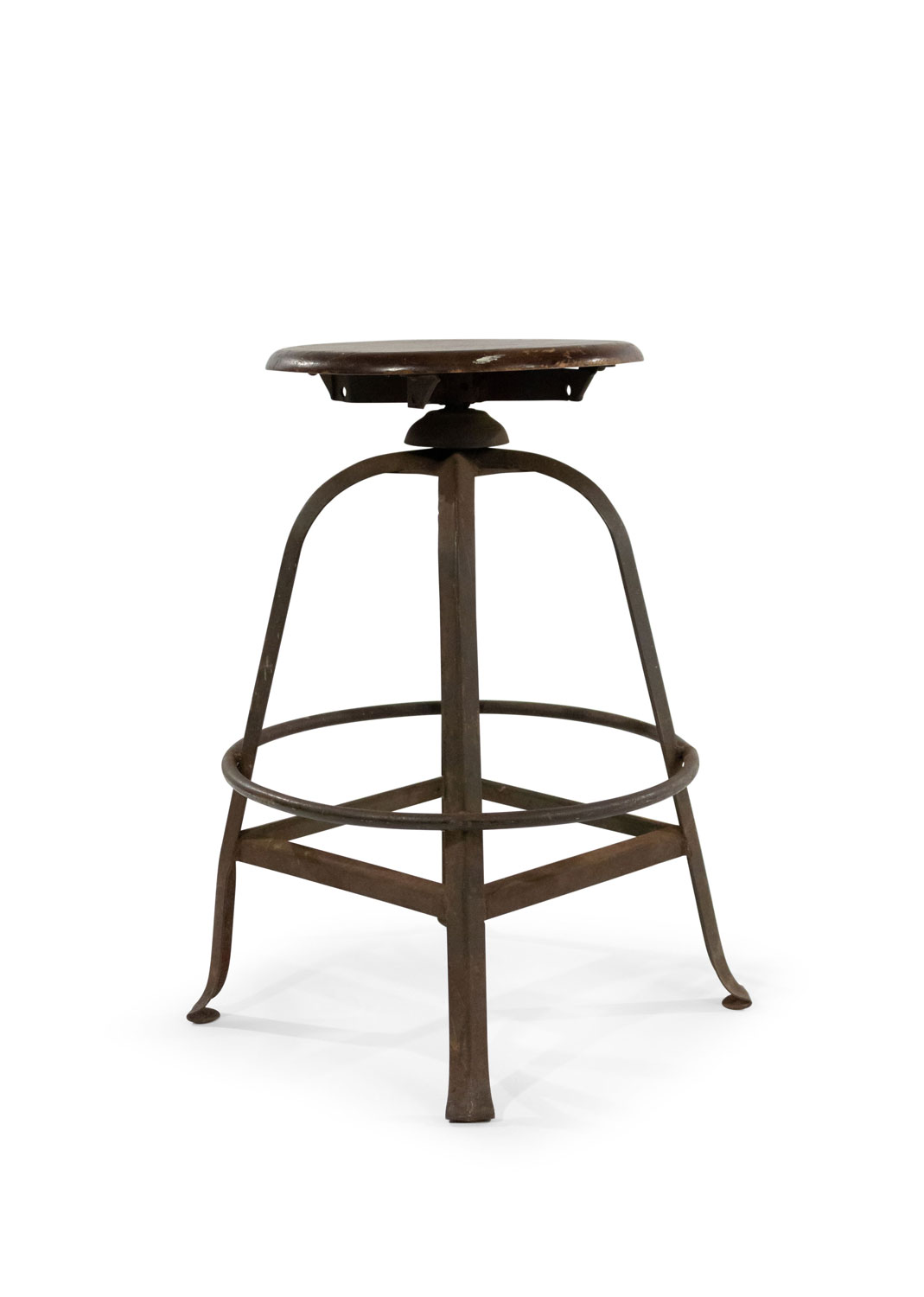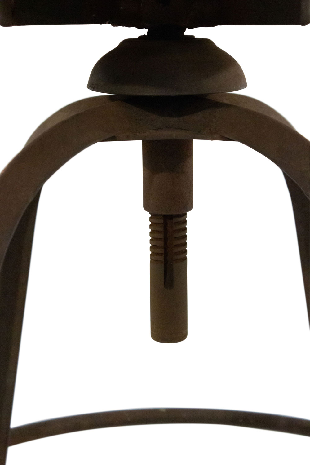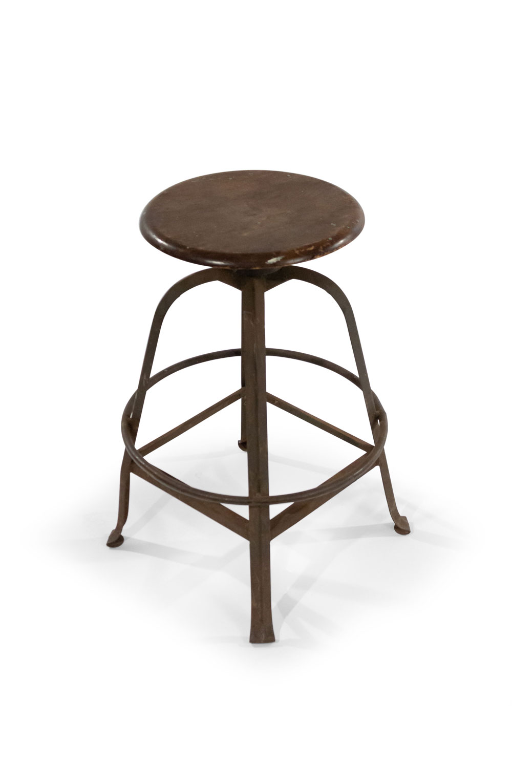 American 1940's industrial metal stool with a natural wood round top with an adjustable seat heat and a round foot rest..