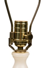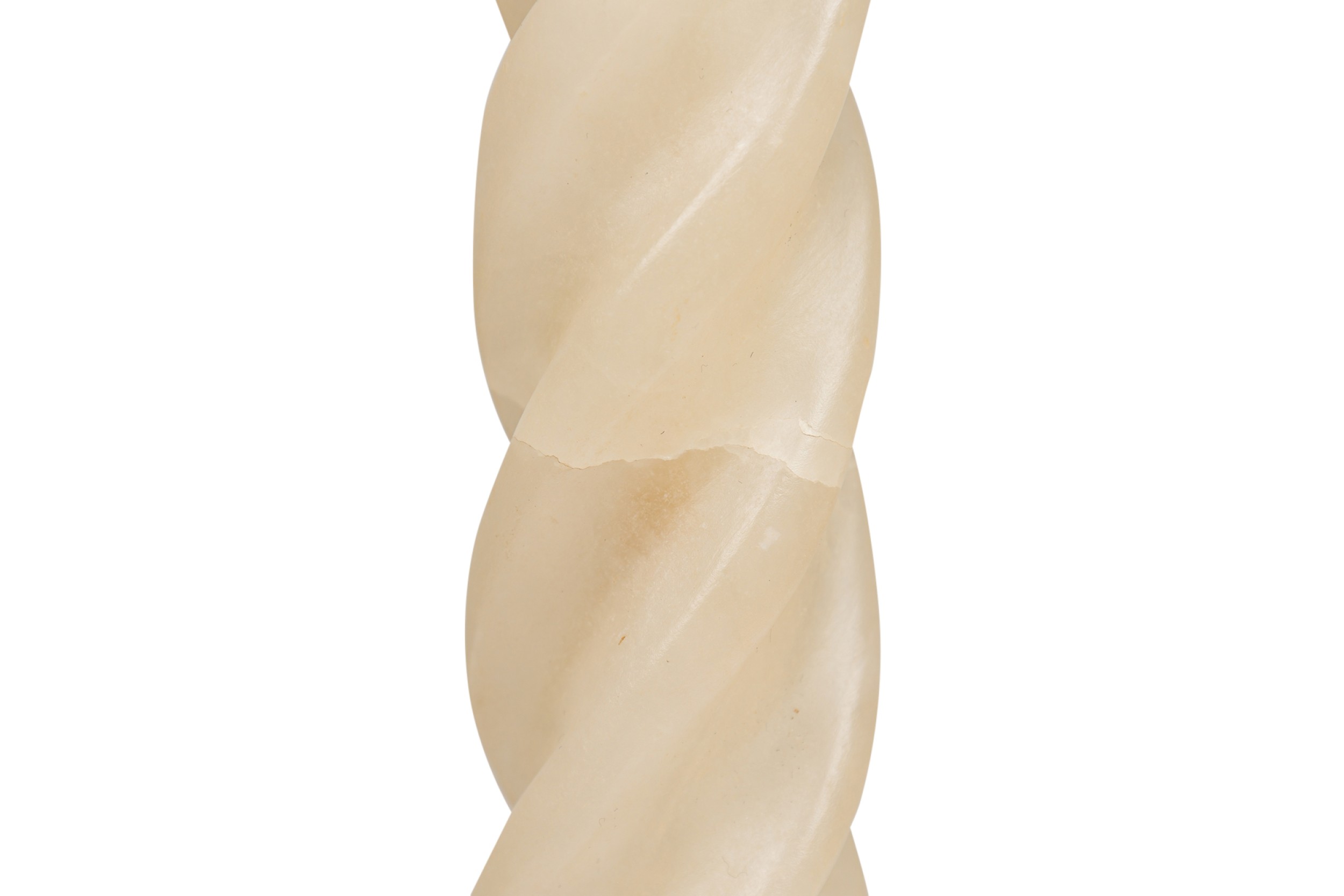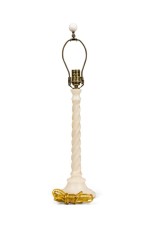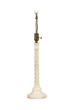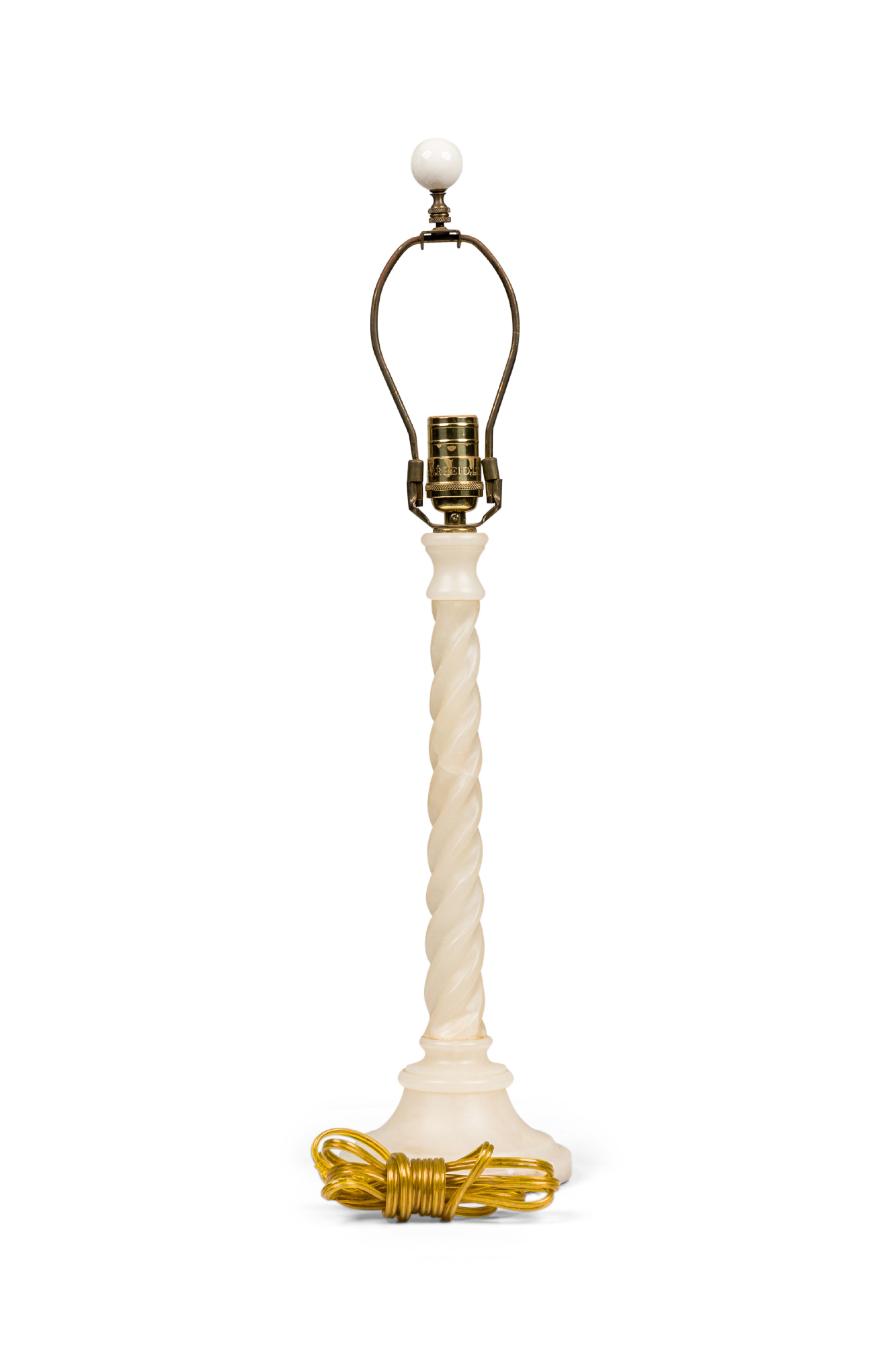 Mid-Century Barley Twist Column white marble lamp with a bulb cage and a ceramic white finial.