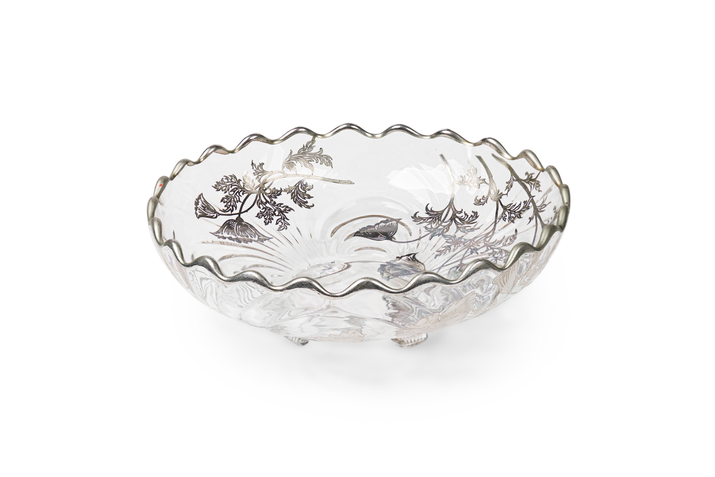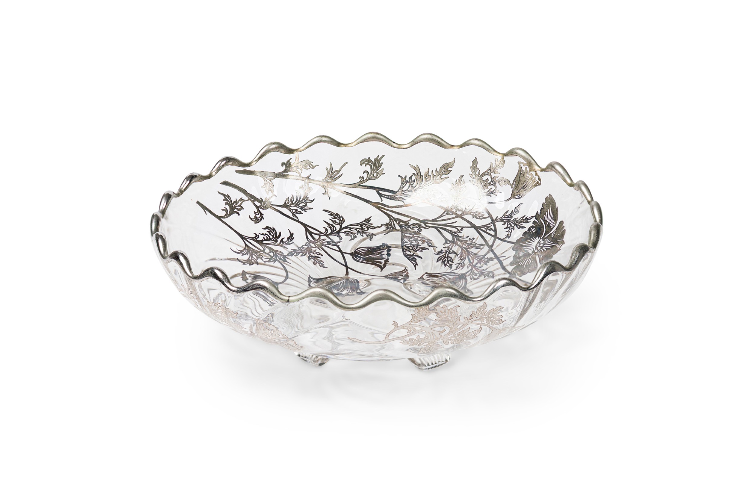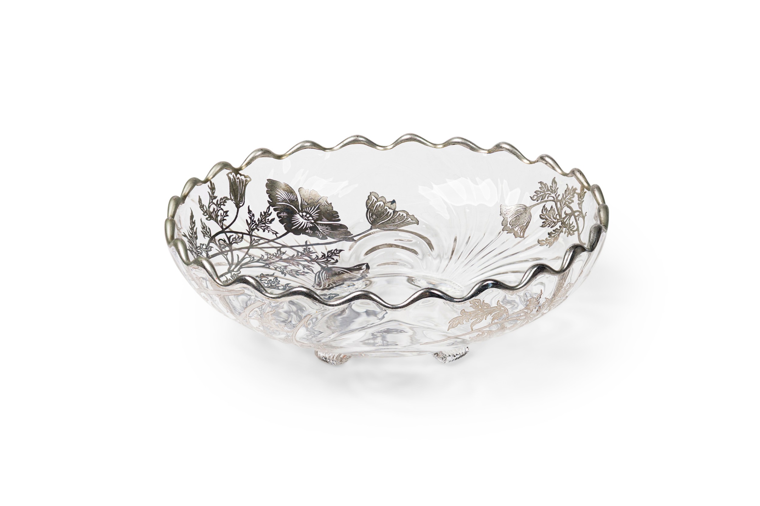 Mid-Century American silver floral overlay glass bowl / ashtry with scalloped edges raised on four feet (SILVER CITY GLASS COMPANY)