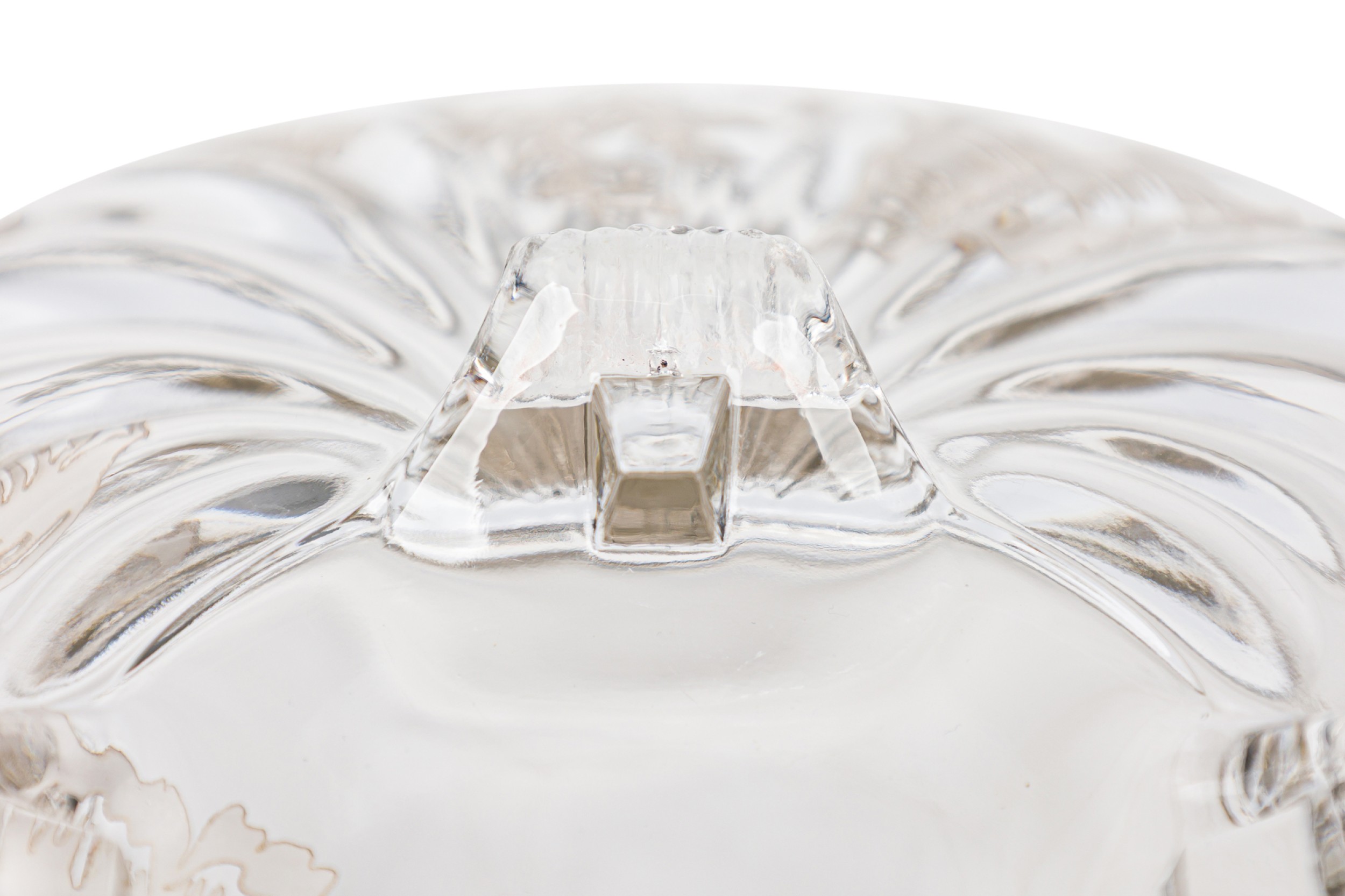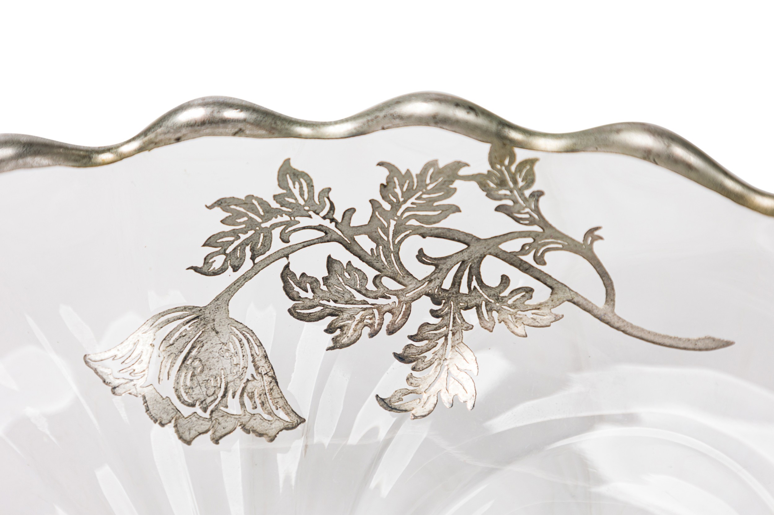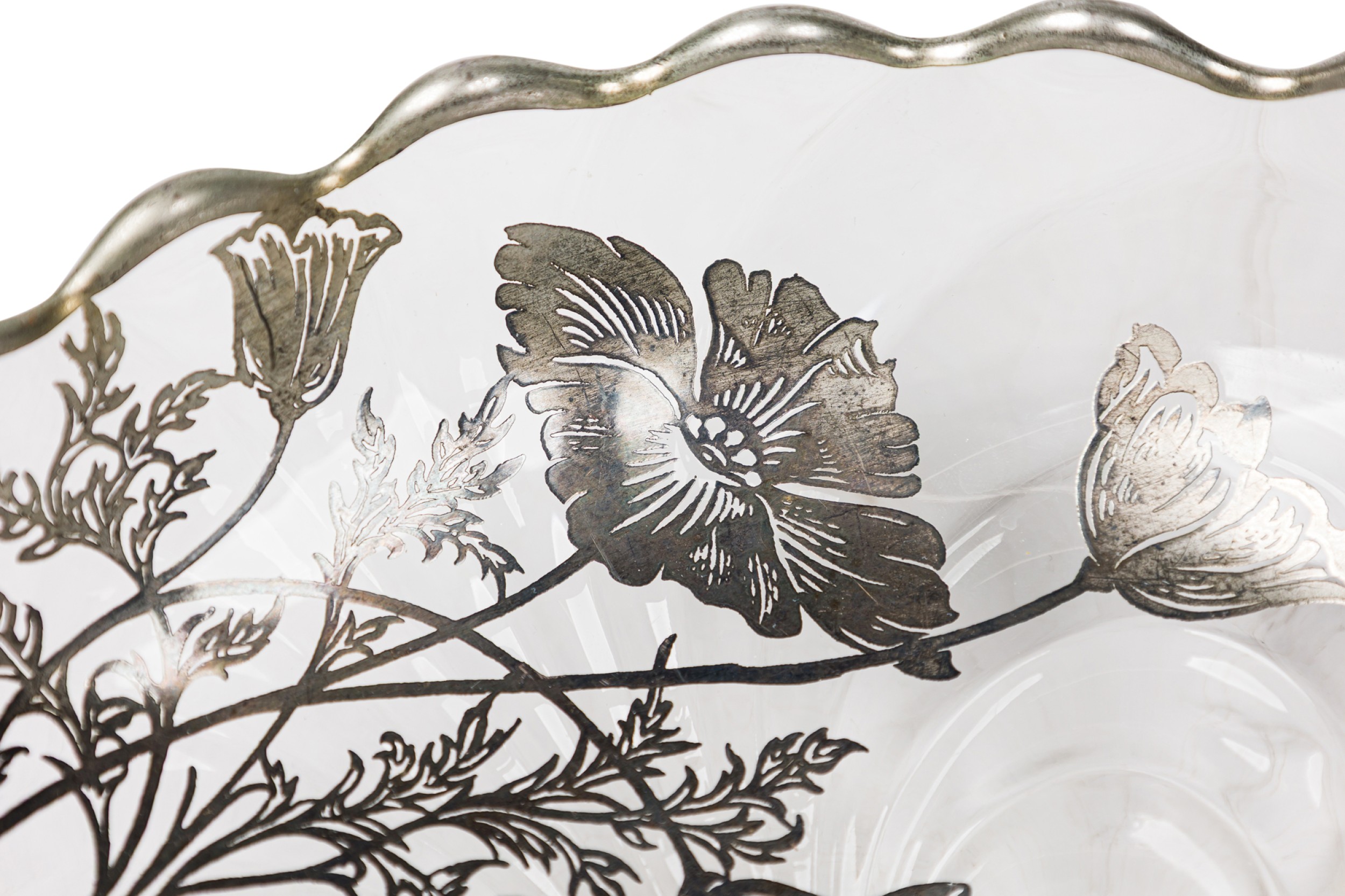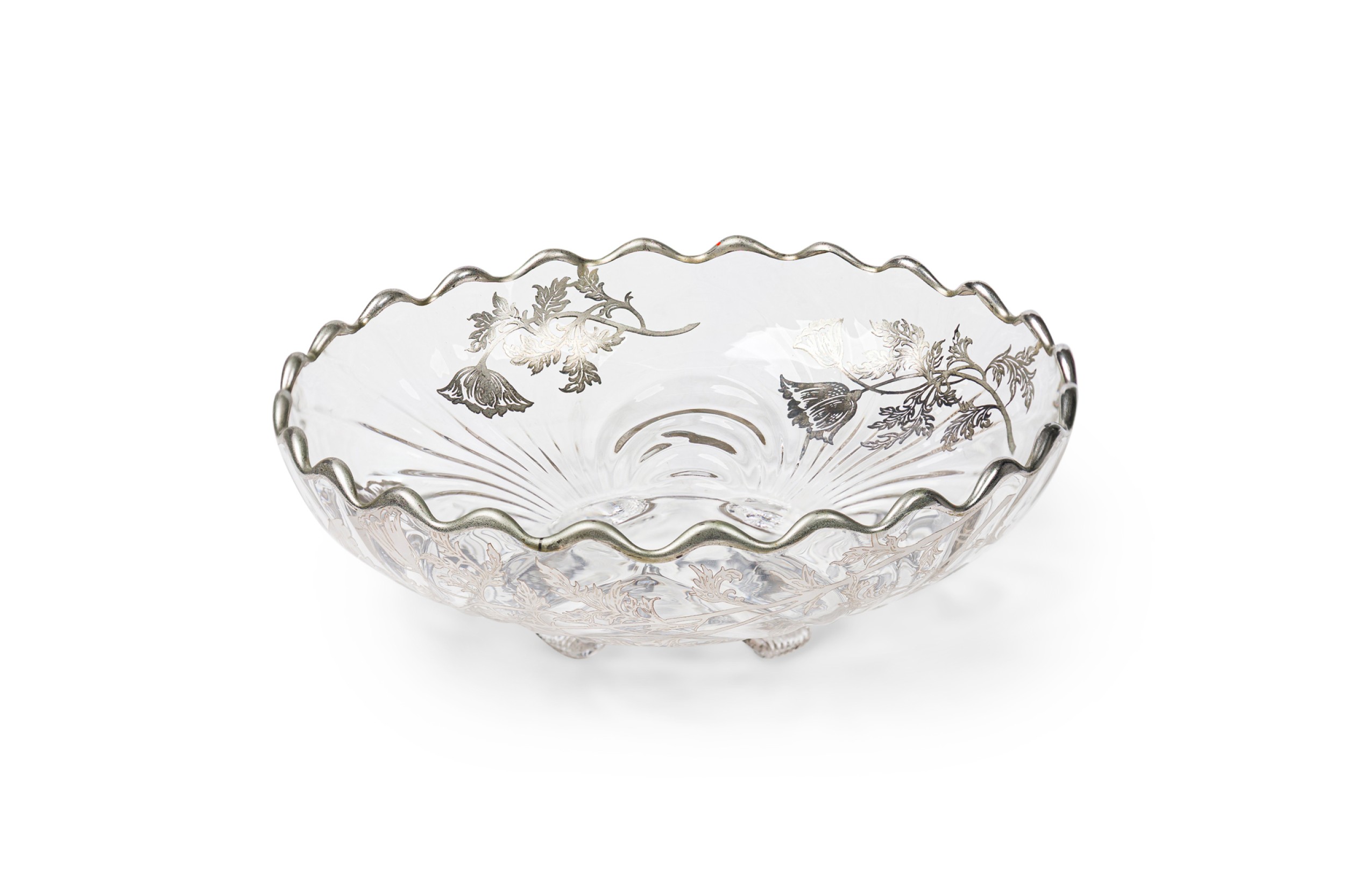 Mid-Century American silver floral overlay glass bowl / ashtry with scalloped edges raised on four feet (SILVER CITY GLASS COMPANY)