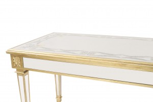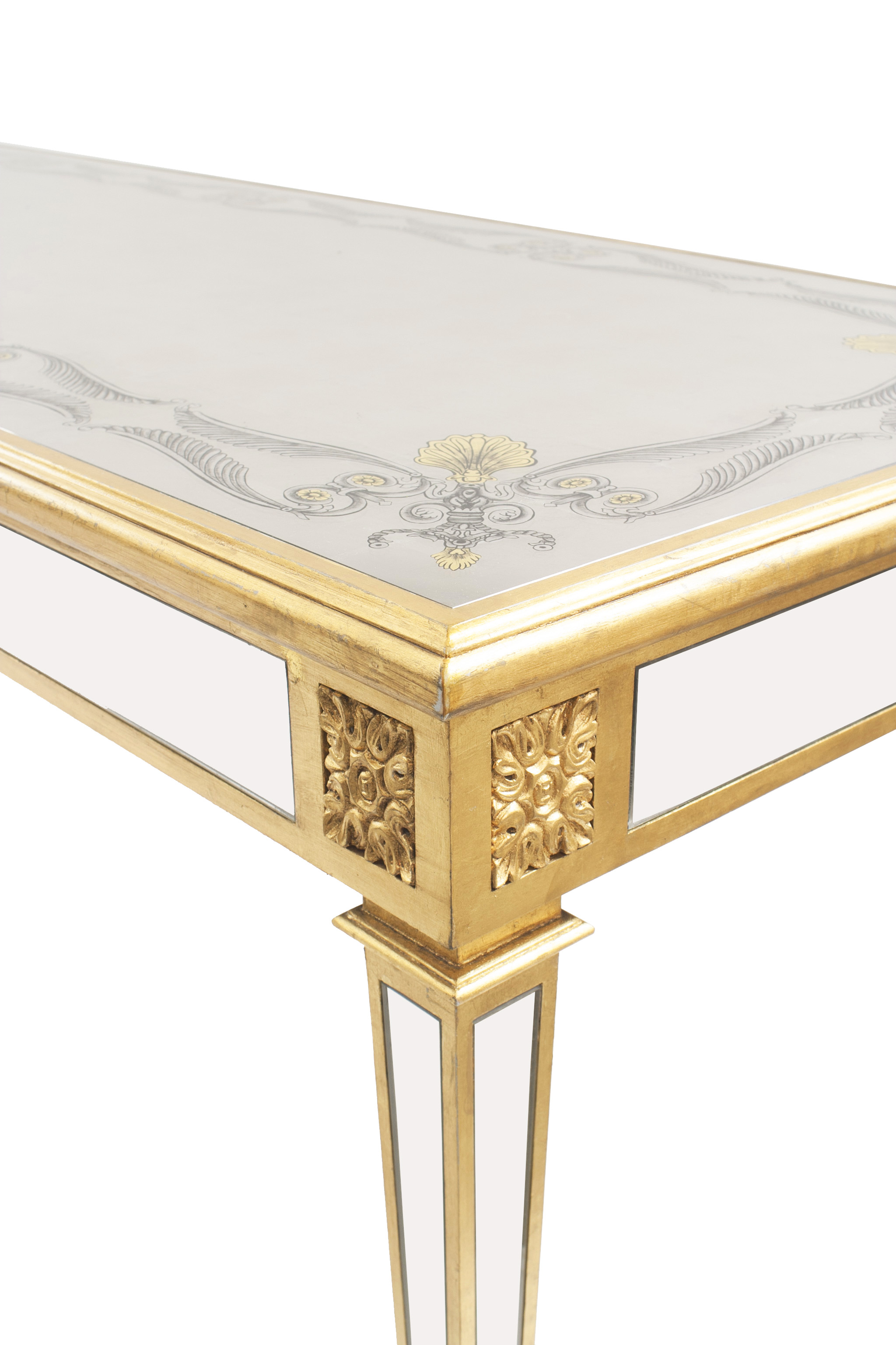 American Mid-Century console table having a silver leaf and eglomise decorated top inset in gold painted wood with a mirrored apron supported on square tapered mirrored legs.