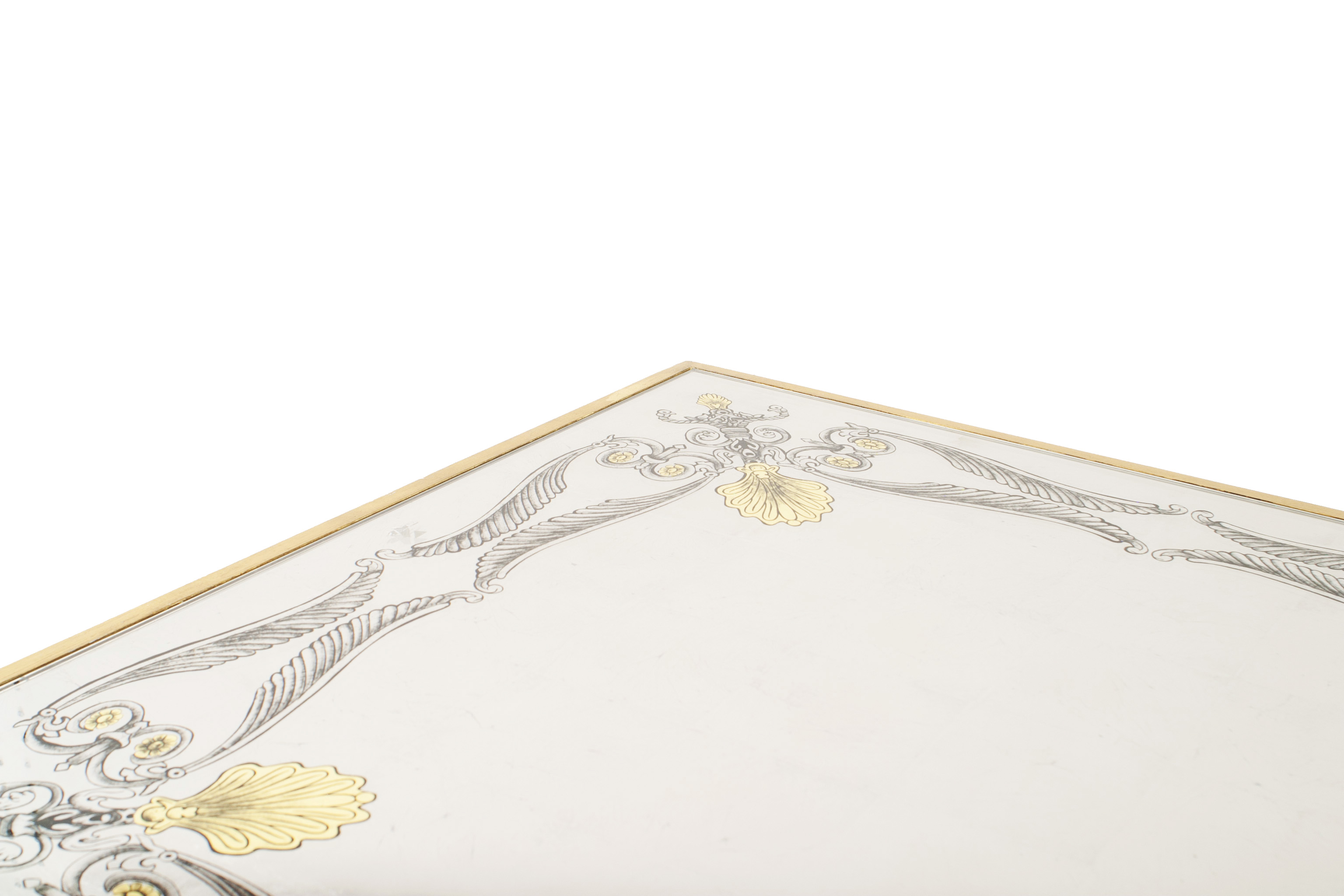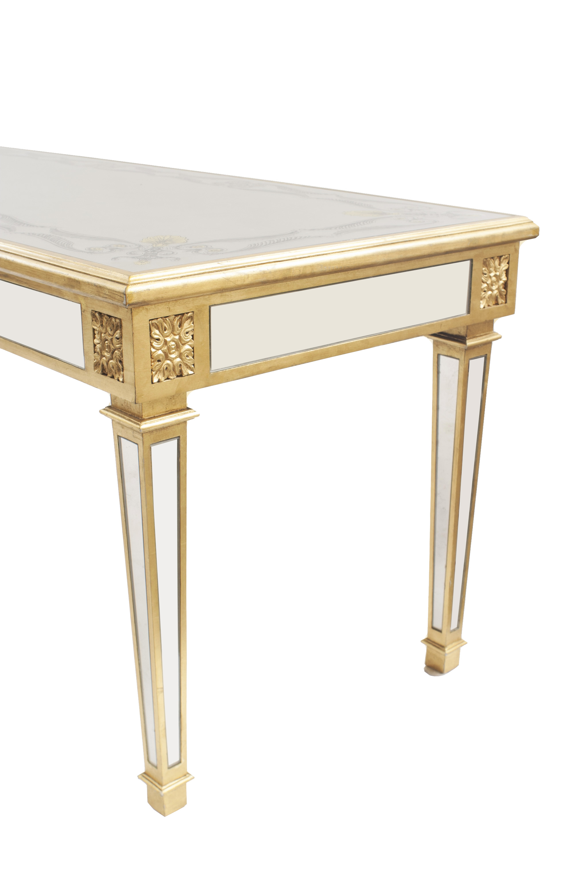 American Mid-Century console table having a silver leaf and eglomise decorated top inset in gold painted wood with a mirrored apron supported on square tapered mirrored legs