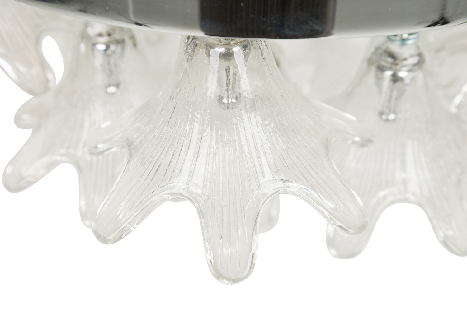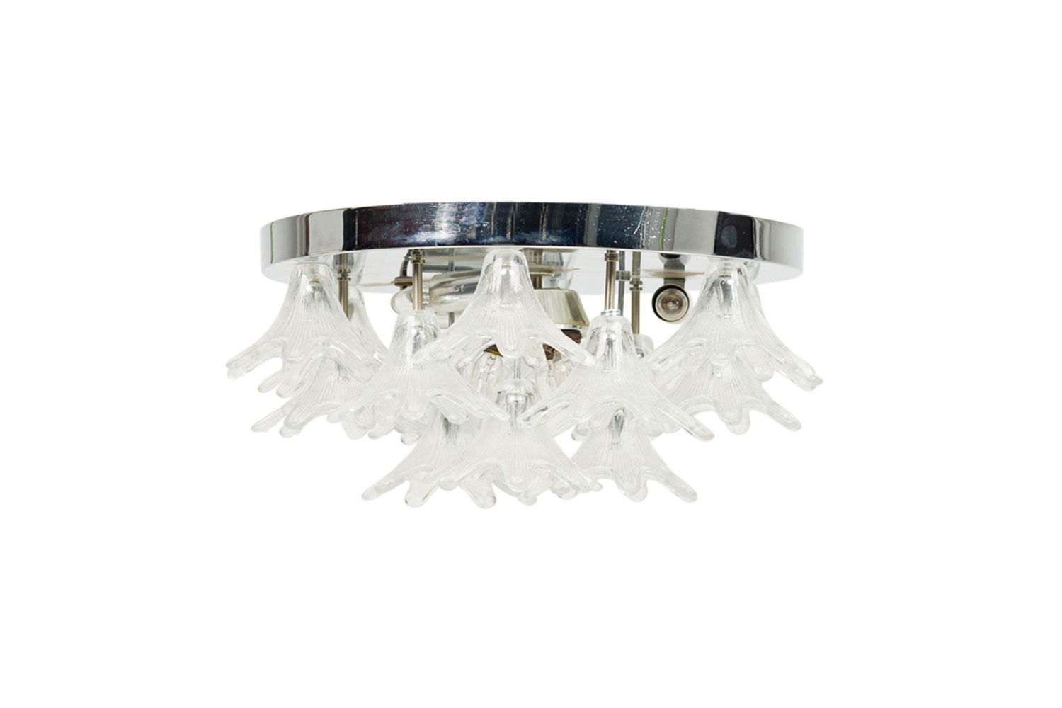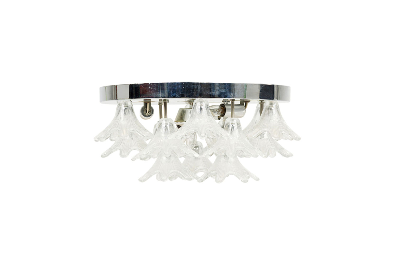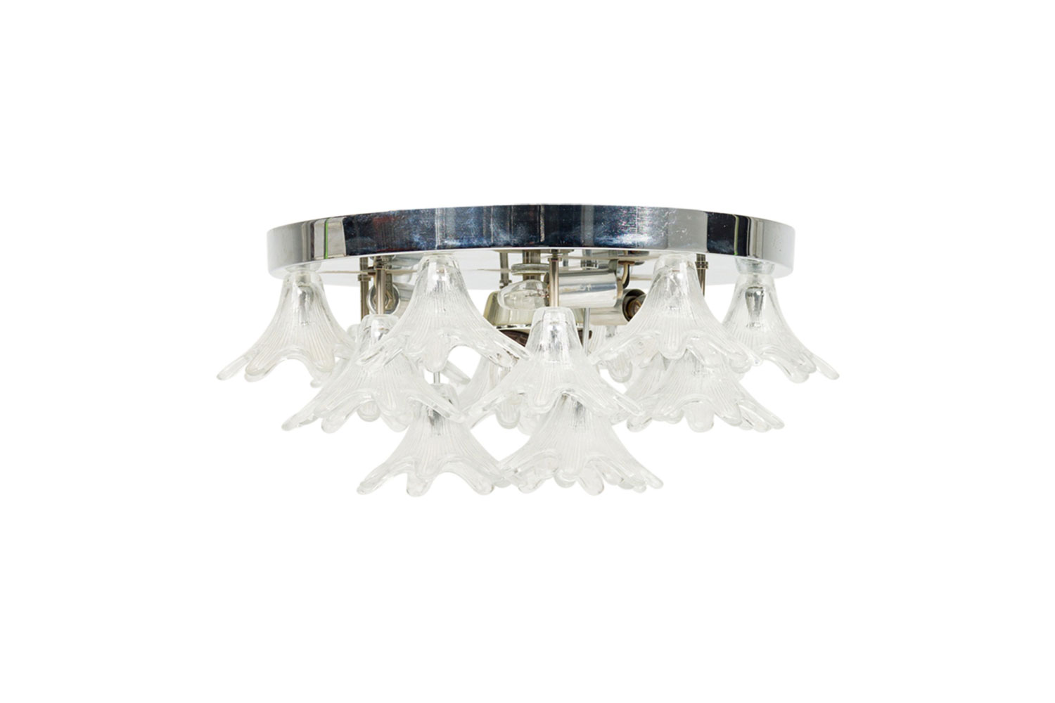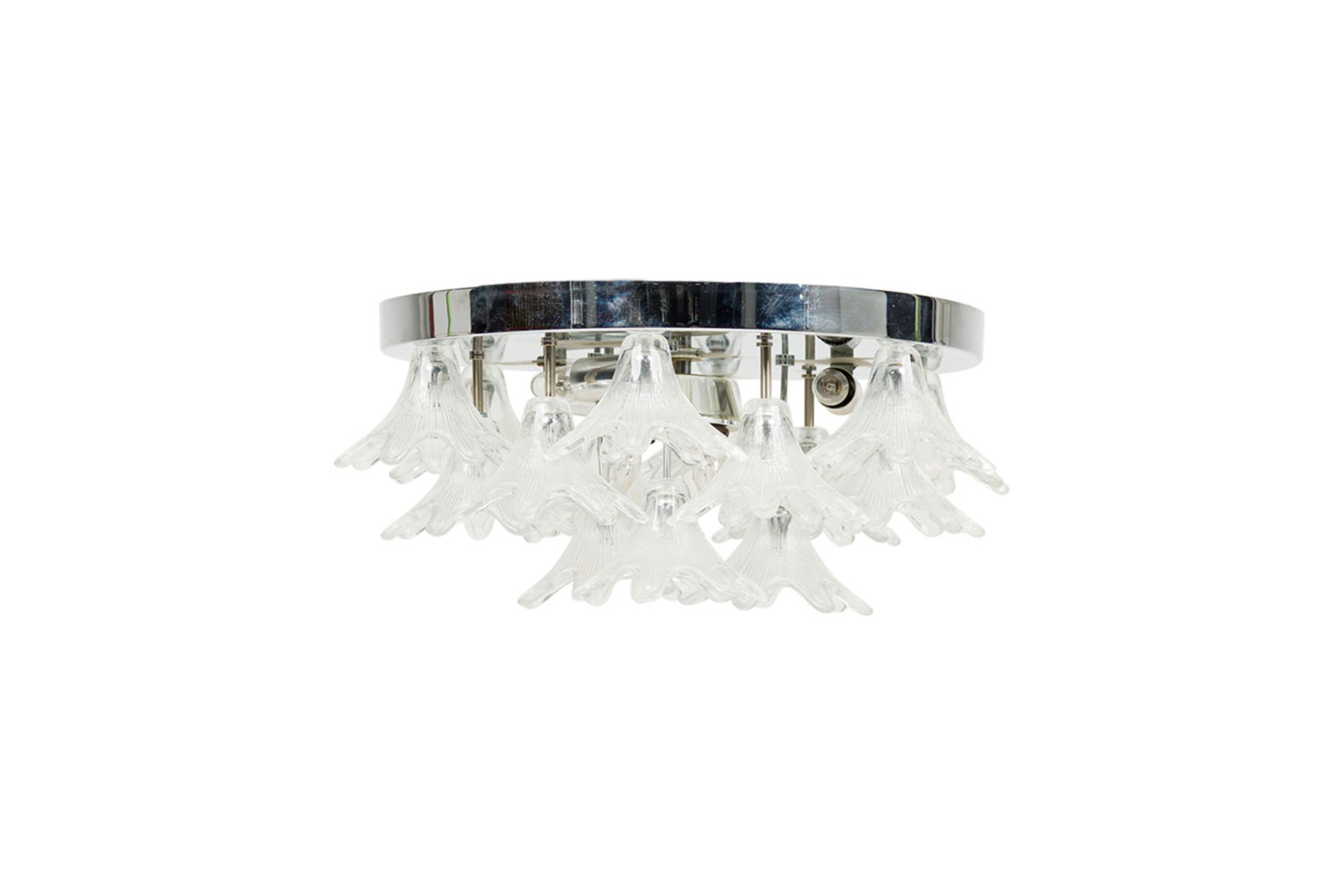 American Mid-Century Plafonnier / ceiling monunted fixture with a chrome ring frame have clear glass shades in the form flowers