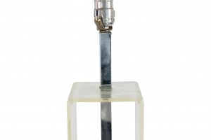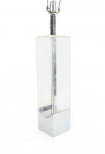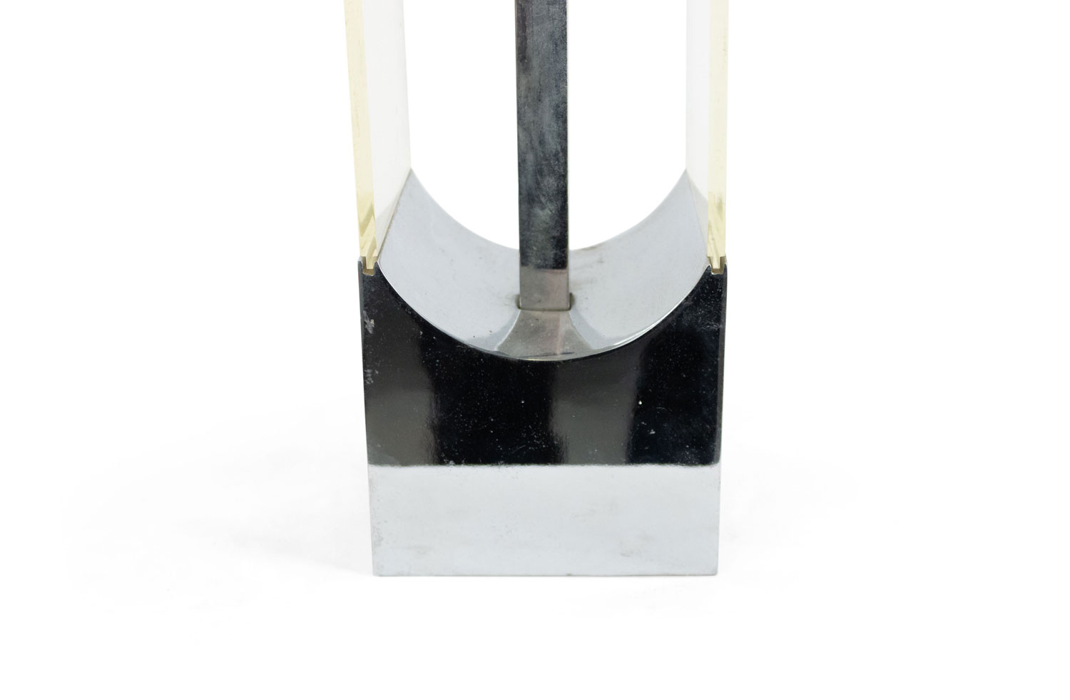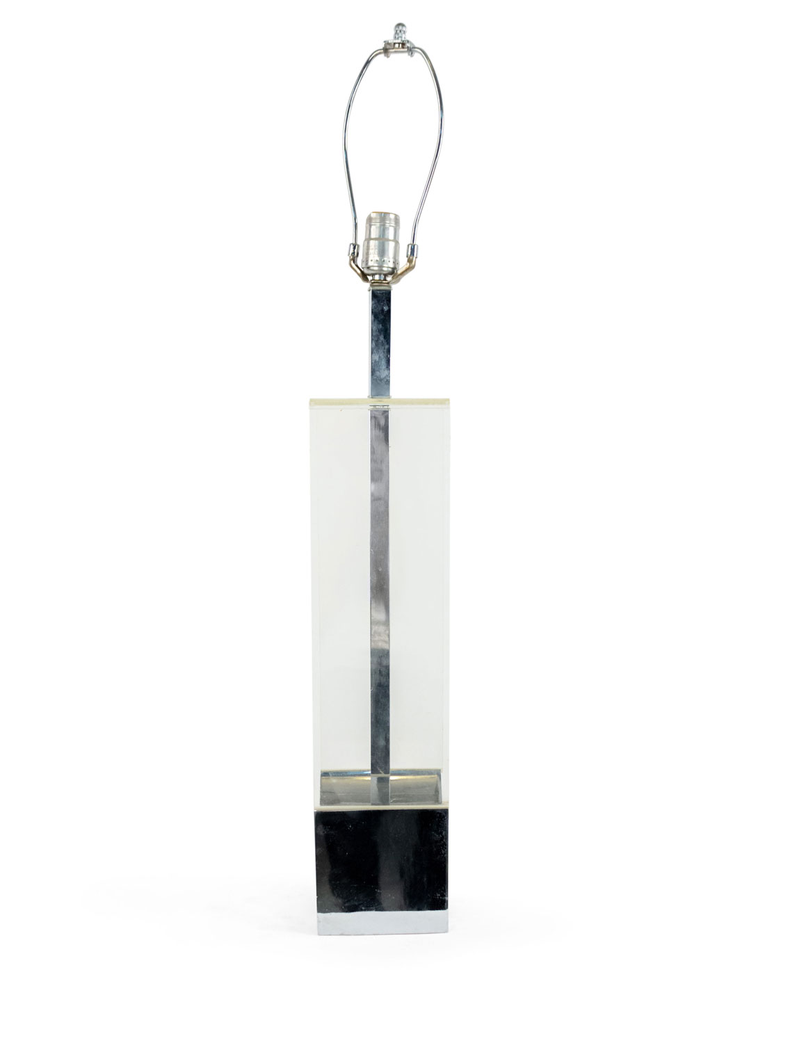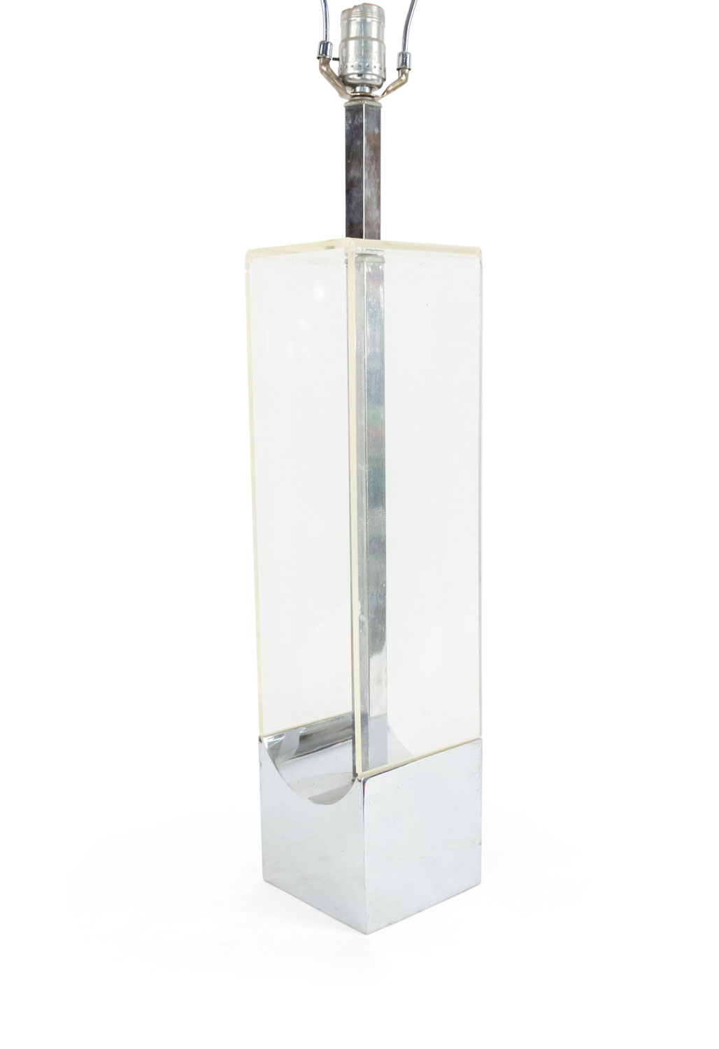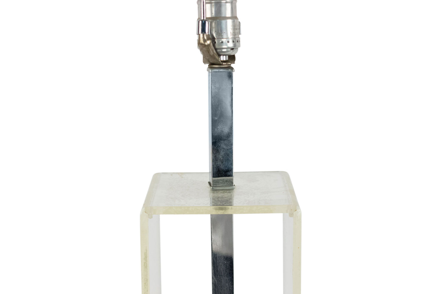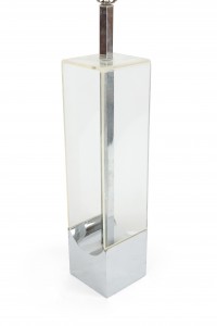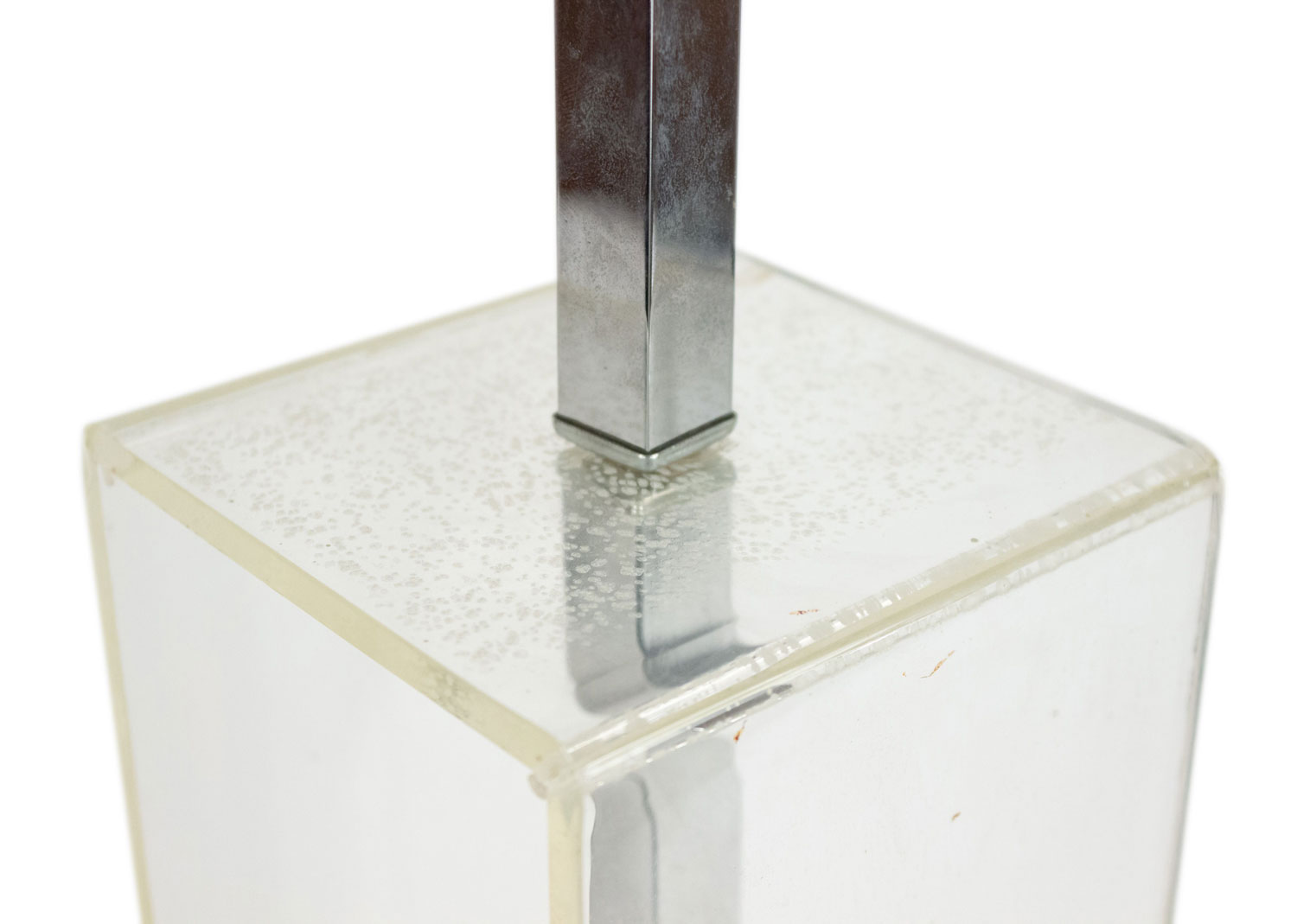 American Mid-Century table lamp with a Lucite open rectangle over a chrome cube base with a concave top..