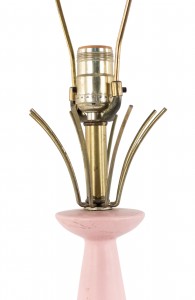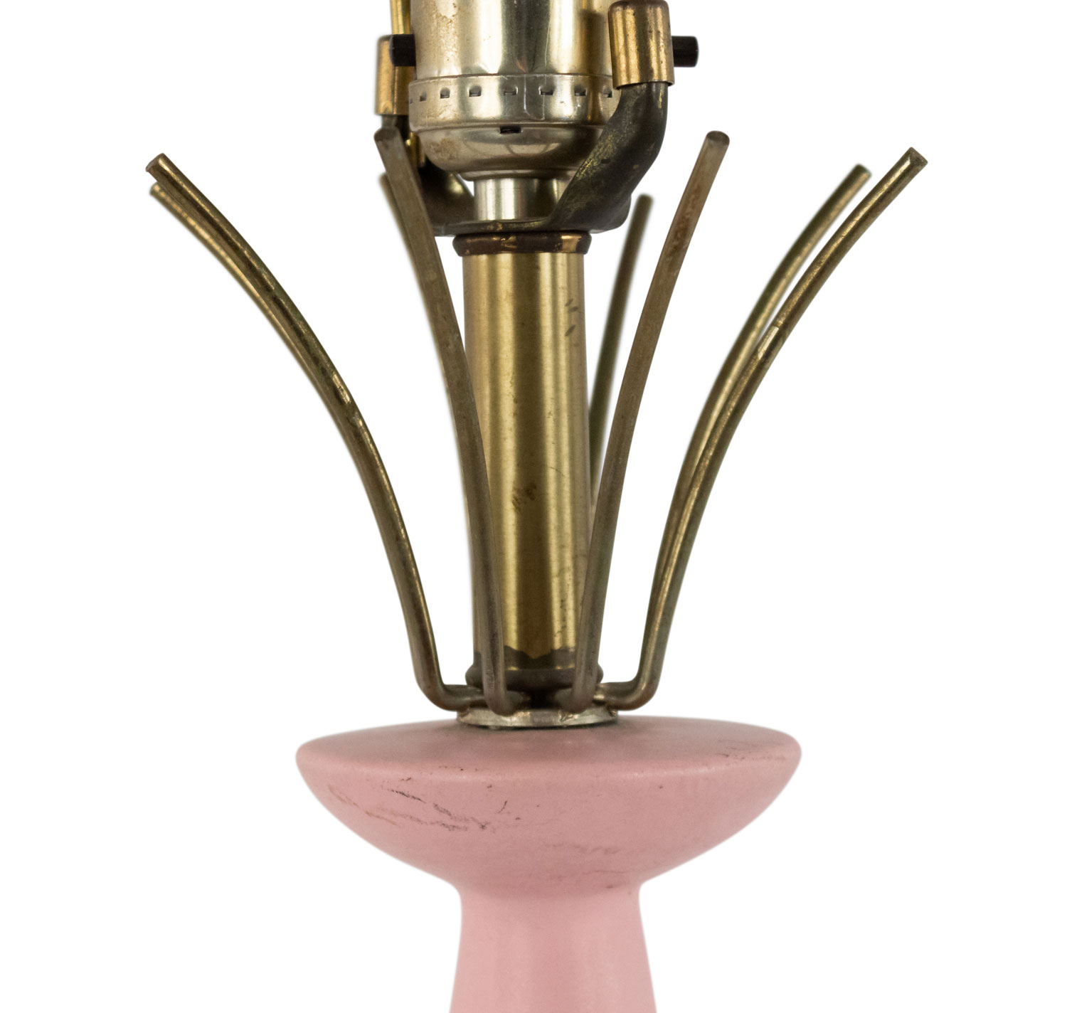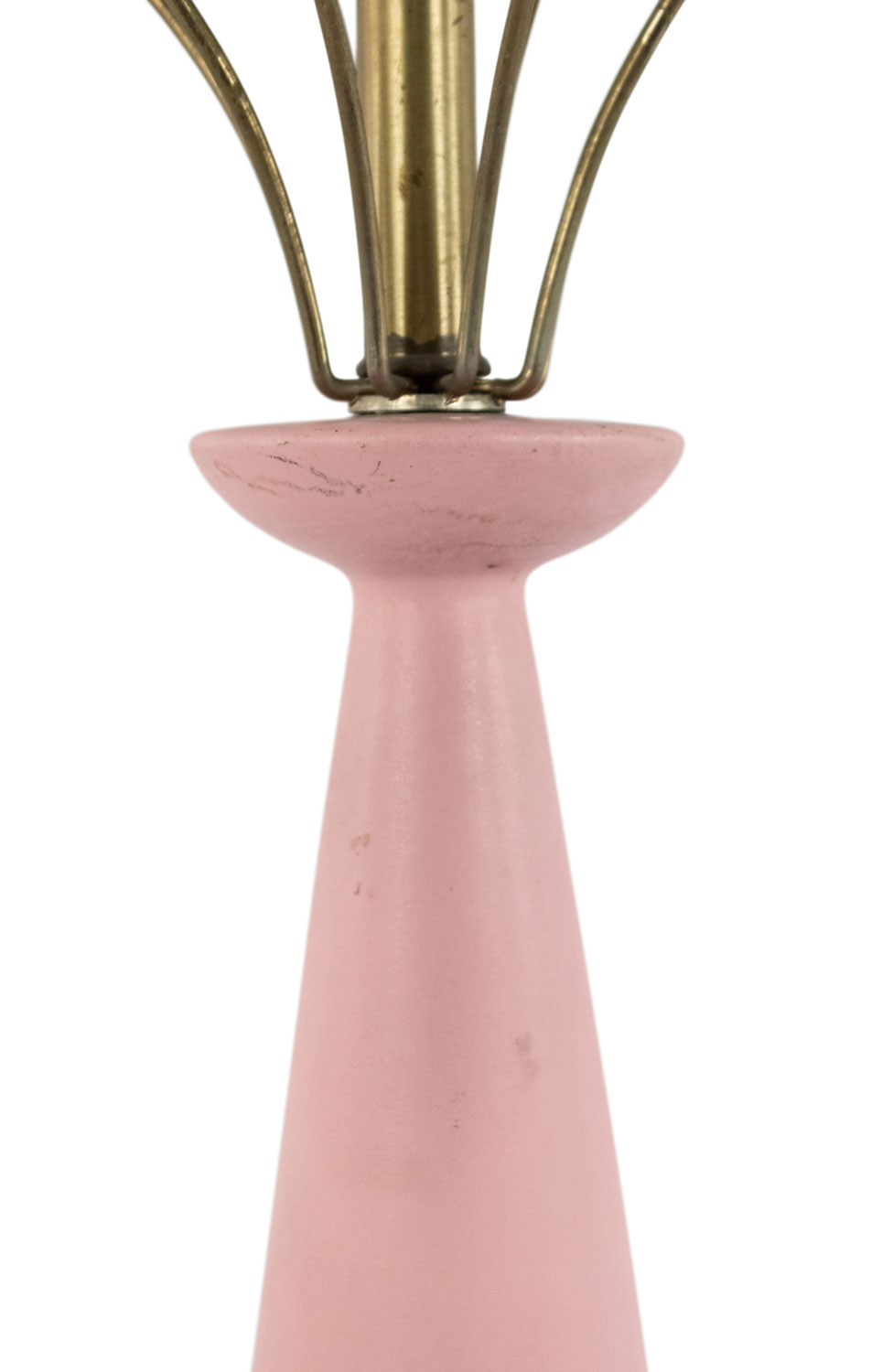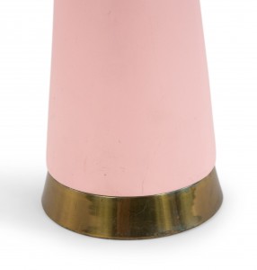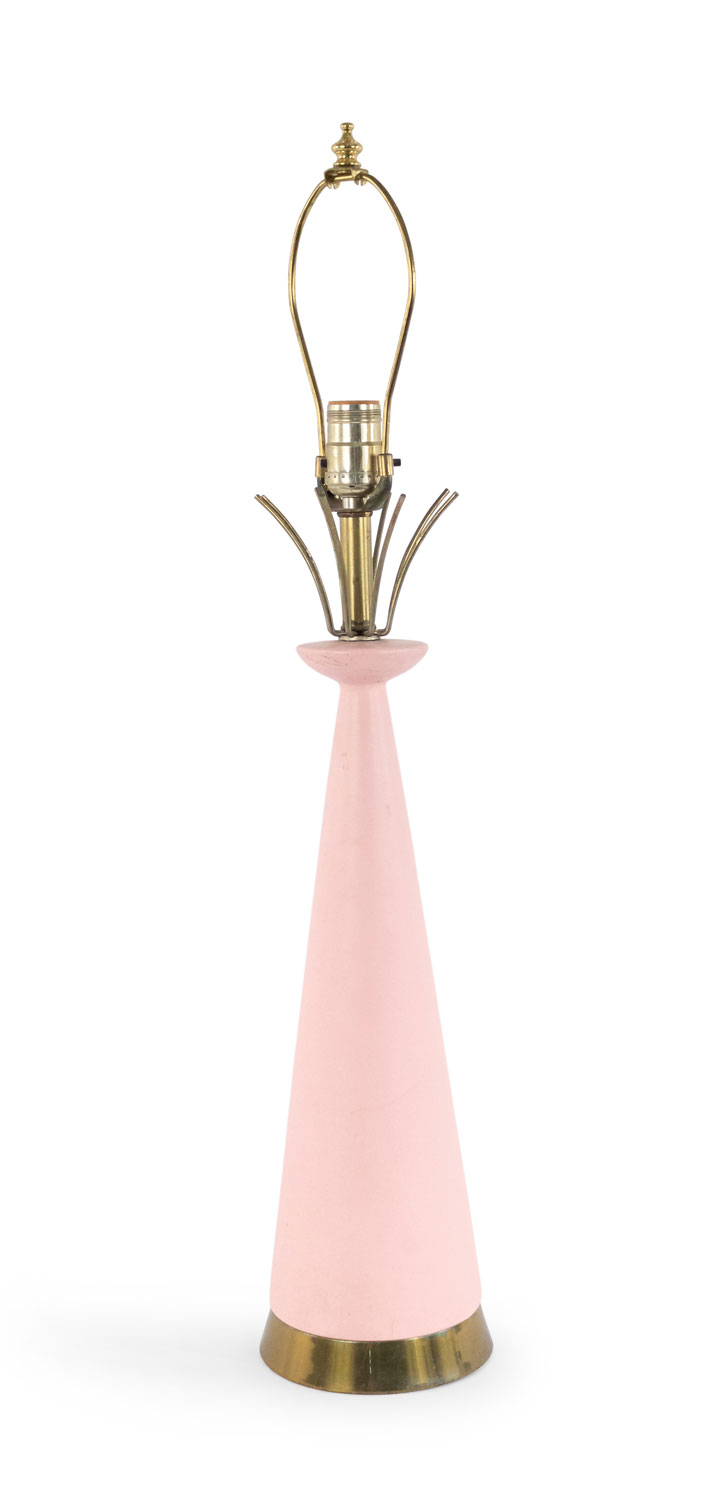 American Mid-Century pink porcelain cone shaped table lamp with a round brass base and brass spokes at top..