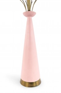 American Mid-Century pink porcelain cone shaped table lamp with a round brass base and brass spokes at top.