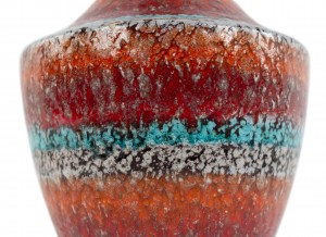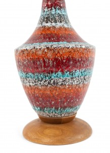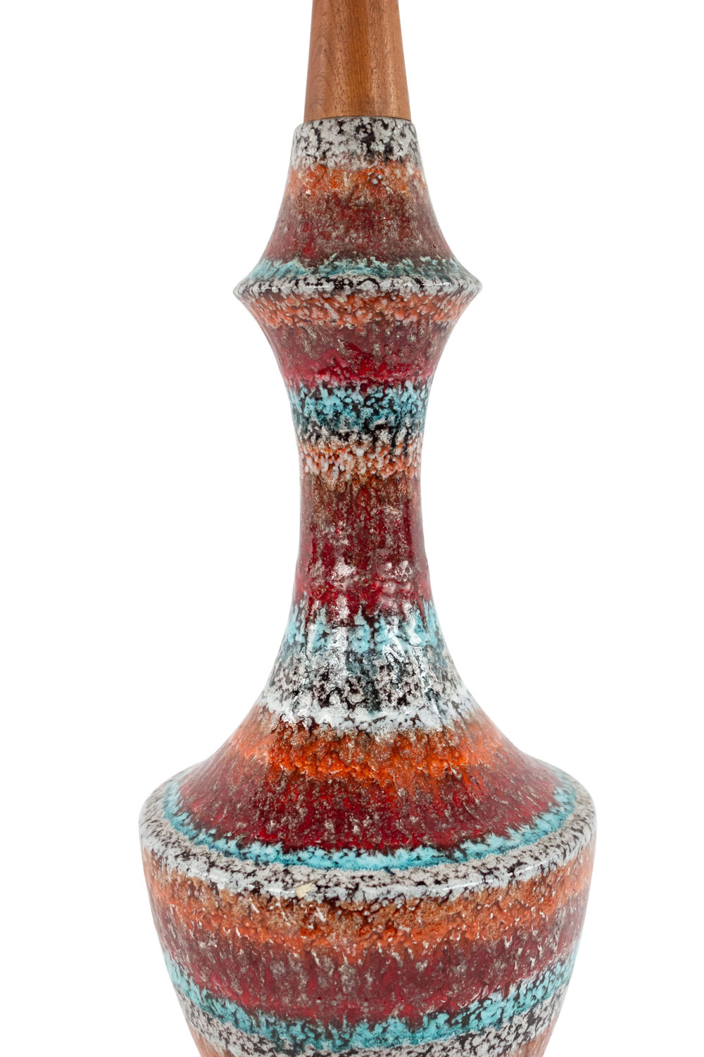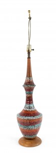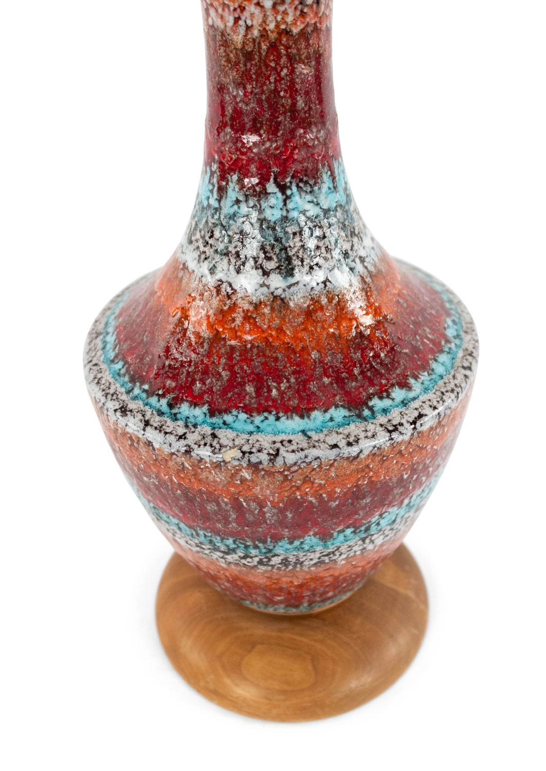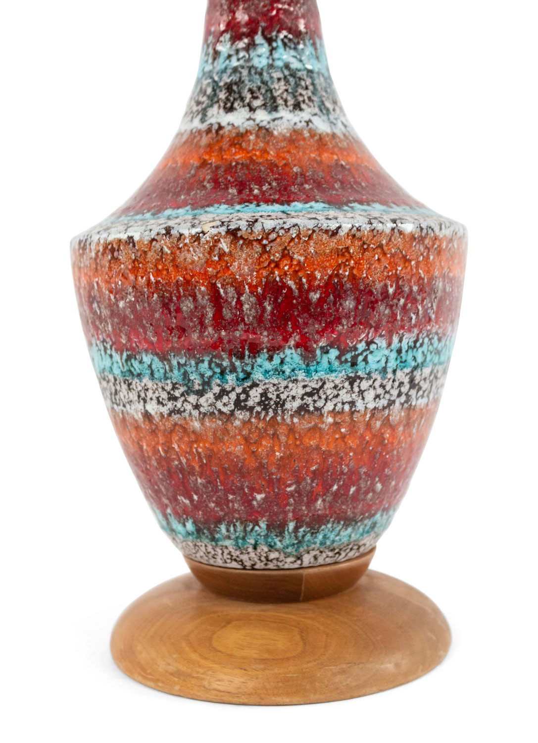 American Mid-Century red and multicolored textured porcelain narrow tapered shaped table lamp with a light wood round base and top section..