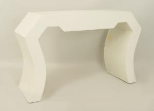 American Mid-Century white painted console table with a geometric shape with concave sides (Attributed to KARL SPRINGER).